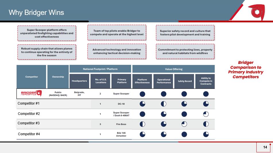Source: National Interagency Fire Center, CalFire, WinAir, RAND Corporation, Bridger management estimates and DeHavilland OEM specifications and marketing. (1) Compared to larger aerial firefighting platforms, i.e., Boeing 747 Supertanker and McDonnell Douglas DC - 10. (2) Assumes scoopable water is 5 miles away; a Scooper can fly up to 8 hours per day (refueling after four hours) and drop 50,000 gallons per tank of fuel. (3) Includes season al water bodies without regard to season and no adjustments to the suitability of a water source based on its likely size at a given time of year. Also assumes that the Company has permission to draw from these bodies of water. Amphibious aerial firefighting aircraft outfitted with upgraded avionics and high - powered turbine engines Unique aeronautical design enables tight maneuvering at low altitudes and airspeeds, allowing for high - precision suppression Ability to utilize natural water sources enables ~50% more time - on - duty per mission than other aerial firefighting aircraft 207 MPH Cruise Speed 8 Hours Daily Active Firefighting Time 1.5k Gallons Tank Capacity 90% of Fires Within 20 Miles of Scooper - accessible Bodies of Water (3) 100k Gallons Dropped / Day (2) 50% + Lower Drop Height (1) Super Scoopers in High Demand due to Unique Firefighting Capabilities 13