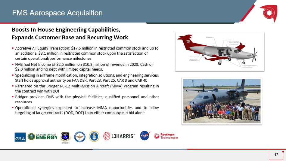 FMS Aerospace Acquisition Boosts In - House Engineering Capabilities, Expands Customer Base and Recurring Work ▪ Accretive All Equity Transaction: $17.5 million in restricted common stock and up to an additional $3.1 million in restricted common stock upon the satisfaction of certain operational/performance milestones ▪ FMS had Net Income of $2.5 million on $10.3 million of revenue in 2023. Cash of $2.0 million and no debt with limited capital needs. ▪ Specializing in airframe modification, integration solutions, and engineering services. Staff holds approval authority on FAA DER, Part 23, Part 25, CAR 3 and CAR 4b ▪ Partnered on the Bridger PC - 12 Multi - Mission Aircraft (MMA) Program resulting in the contract win with DOI ▪ Bridger provides FMS with the physical facilities, qualified personnel and other resources ▪ O perational synergies expected to increase MMA opportunities and to allow targeting of larger contracts (DOD, DOE) than either company can bid alone 17