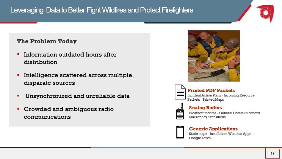 Printed PDF Packets I ncident Action Plans - Incoming Resource Packets - Printed Maps Analog Radios Weather updates - General Communications – Emergency Transitions Generic Applications Static maps - Insufficient Weather Apps - Google Drive Leveraging Data to Better Fight Wildfires and Protect Firefighters 18 The Problem Today ▪ Information outdated hours after distribution ▪ Intelligence scattered across multiple, disparate sources ▪ Unsynchronized and unreliable data ▪ Crowded and ambiguous radio communications