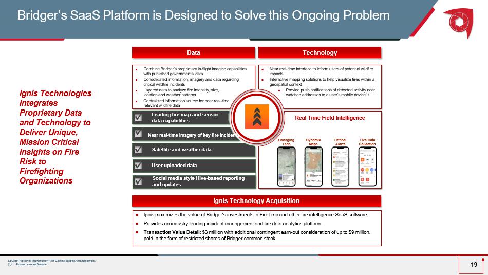 Ignis Technologies Integrates Proprietary Data and Technology to Deliver Unique, Mission Critical Insights on Fire Risk to Firefighting Organizations Bridger’s SaaS Platform is Designed to Solve this Ongoing Problem 19 Combine Bridger’s proprietary in - flight imaging capabilities with published governmental data Consolidated information, imagery and data regarding critical wildfire incidents Layered data to analyze fire intensity, size, location and weather patterns  Centralized information source for near real - time, relevant wildfire data  Near real - time interface to inform users of potential wildfire impacts  Interactive mapping solutions to help visualize fires within a geospatial context  Provide push notifications of detected activity near watched addresses to a user’s mobile device (1) Leading fire map and sensor data capabilities Satellite and weather data User uploaded data Data Technology x x x Near real - time imagery of key fire incidents x x  Ignis maximizes the value of Bridger’s investments in FireTrac and other fire intelligence SaaS software  Provides an industry leading incident management and fire data analytics platform  Transaction Value Detail: $3 million with additional contingent earn - out consideration of up to $9 million, paid in the form of restricted shares of Bridger common stock Ignis Technology Acquisition Real Time Field Intelligence Live Data Collection Dynamic Maps Critical Alerts Emerging Tech Source: National Interagency Fire Center, Bridger management. (1) Future release feature. x Social media style Hive - based reporting and updates