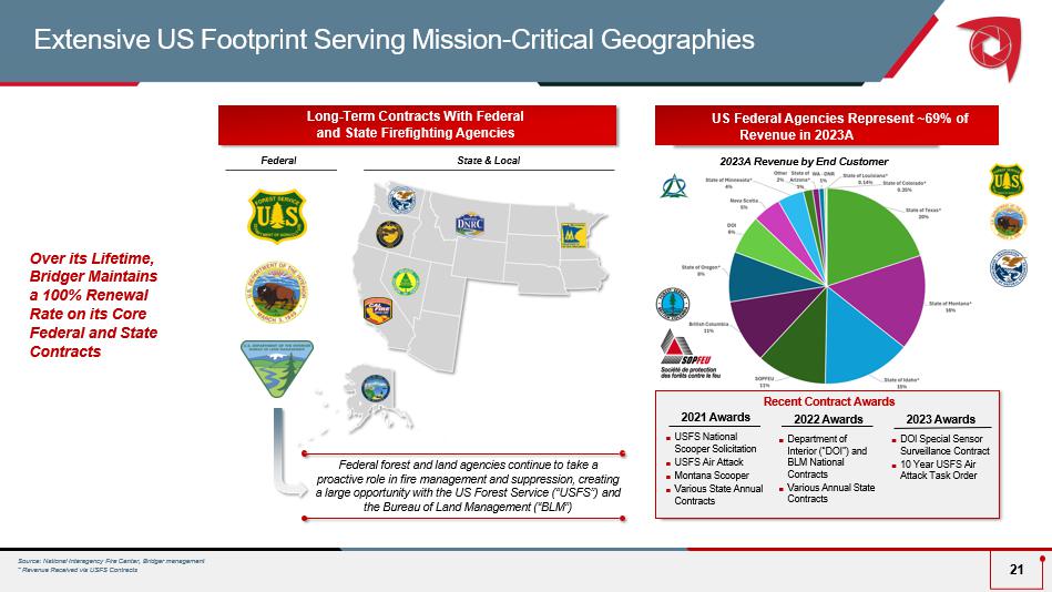 Long - Term Contracts With Federal and State Firefighting Agencies Federal State & Local Federal forest and land agencies continue to take a proactive role in fire management and suppression, creating a large opportunity with the US Forest Service (“USFS”) and the Bureau of Land Management (“BLM”) Over its Lifetime, Bridger Maintains a 100% Renewal Rate on its Core Federal and State Contracts Source: National Interagency Fire Center, Bridger managemen t * Revenue Received via USFS Contracts Extensive US Footprint Serving Mission - Critical Geogra phies 21 US Federal Agencies Represent ~69% of Revenue in 2023A 202 3A Revenue by End Customer 2021 Awards  USFS National Scooper Solicitation  USFS Air Attack  Montana Scooper  Various State Annual Contracts 2022 Awards  Department of Interior (“DOI”) and BLM National Contracts  Various Annual State Contracts Recent Contract Awards 2023 Awards  DOI Special Sensor Surveillance Contract  10 Year USFS Air Attack Task Order