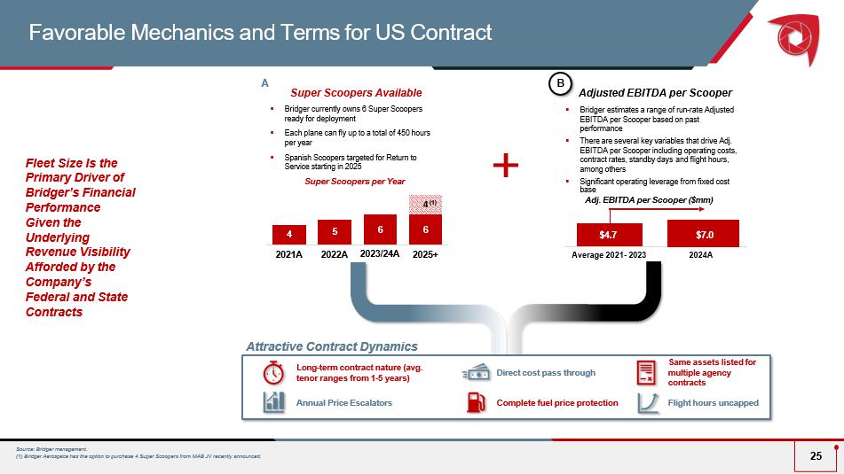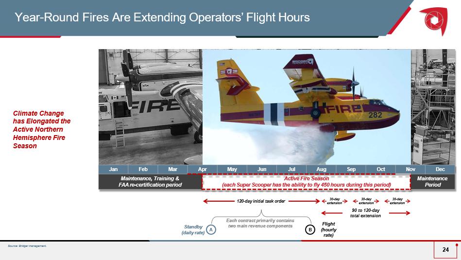  Awarded 4 Super Scoopers at auction in Q4 2023 from the Spanish Ministry for Ecological Transition and Demographic Challenge  MAB JV partnership completed purchase in late 2023  Bridger has option t o acquire Scoopers from MAB JV as they are returned to service  As aerial firefighting assets become scarcer in the marketplace, Bridger expects increasing demand for Scoopers internationally  Potential to grow Bridger fleet to 10 Super Scoopers Spanish Scooper Acquisition to Drive Future Growth 23 Fleet of 4 Aircraft Overview The Addition of Spanish Scoopers is expected to Transform Bridger to the Largest Private Owner of Super Scoopers in the World