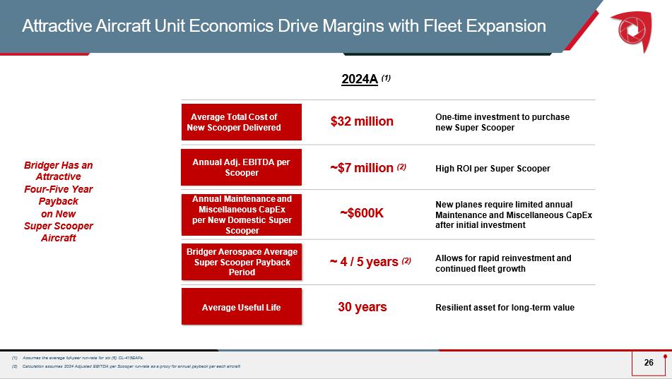 A B Super Scoopers Available ▪ Bridger currently owns 6 Super Scoopers ready for deployment ▪ Each plane can fly up to a total of 450 hours per year ▪ Spanish Scoopers targeted for Return to Service starting in 2025 Long - term contract nature (avg. tenor ranges from 1 - 5 years) Annual Price Escalators Direct cost pass through Complete fuel price protection Same assets listed for multiple agency contracts Flight hours uncapped Favorable Mechanics and Terms for US Contract 25 Fleet Size Is the Primary Driver of Bridger’s Financial Performance Given the Underlying Revenue Visibility Afforded by the Company’s Federal and State Contracts Super Scoopers per Year Attractive Contract Dynamics Adjusted EBITDA per Scooper ▪ Bridger estimates a range of run - rate Adjusted EBITDA per Scooper based on past performance ▪ There are several key variables that drive Adj. EBITDA per Scooper including operating costs, contract rates, standby days and flight hours, among others ▪ Significant operating leverage from fixed cost base Adj. EBITDA per Scooper ($mm) 4 5 6 6 4 2021A 2022A 2023 /24 A 202 5 + ( 1 ) $ 4.7 $ 7.0 Average 2021 - 2023 2024 A Source: Bridger management. (1) Bridger Aerospace has the option to purchase 4 Super Scoopers from MAB JV recently announced.