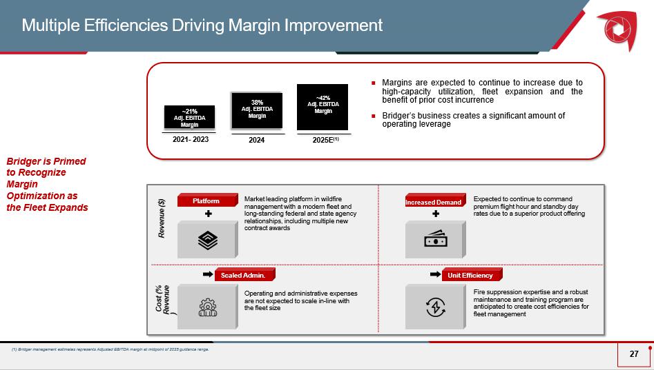 (1) Assumes the average full - year run - rate for six (6) CL - 415EAFs. $32 million One - time investment to purchase new Super Scooper Average Total Cost of New Scooper Delivered Bridger Aerospace Average Super Scooper Payback Period ~ 4 / 5 years (2) Allows for rapid reinvestment and continued fleet growth Annual Maintenance and Miscellaneous CapEx per New Domestic Super Scooper ~$600K New planes require limited annual Maintenance and Miscellaneous CapEx after initial investment Bridger Has an Attractive Four - Five Y ear Payback on New Super Scooper Aircraft Attractive Aircraft Unit Economics Drive Margins with Fleet Expansion 26 2024 A (1) Annual Adj. EBITDA per Scooper ~$7 million (2) High ROI per Super Scooper Average Useful Life 30 years Resilient asset for long - term value (2) Calculation assumes 202 4 Adjusted EBITDA per Scooper run - rate as a proxy for annual payback per each aircraft