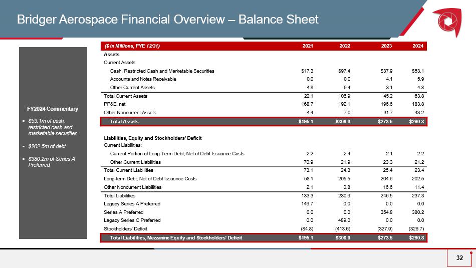 2024 2023 2022 2021 ($ In Millions ) $66.8 $ 56.0 $ 38.8 $30 .4 Fire Suppression 13.1 9.7 7 .2 8 .6 Aerial Surveillance 13.9 - - - MRO 4.8 1 .0 0. 0 0 .0 Other ( UAS, Maintenance, Admin) $98.6 $ 66.7 $46 .4 $39 .4 Total Revenue (57.5) ( 41.3 ) ( 33.9 ) (26 .6 ) Less: COGS $41.1 $ 25.4 $12 .5 $ 12.8 Gross Profit 42% 38 % 2 7 % 33% Gross Profit Margin % (57.5) ( 103.0 ) (5 4.6 ) (19 .3 ) Less: G&A, Interest Expense, and Other Income $(15.6) $ (77.4) $(4 2.1 ) $( 6.5 ) Net L oss ( 4) $37.3 $ 18.7 $ 3.7 $ 9.8 Adj. EBITDA (1) ( 3 ) 38% 28 % 8 % 25 % Adj. EBITDA Margin % 6 6 5 (2 ) 4 # of Fire Suppression Aircraft Source: Bridger management estimates. (1) See slide 33 for a reconciliation of GAAP Net Income to adjusted EBITDA. (2) Bridger had five CL - 415EAF Super Scoopers, though only four Super Scoopers were active for the majority of 2022 fire season. Bridger took delivery of the sixth Super Scooper in Q1 2023. (3) Adjusted EBITDA for 2022 includes (among other items) (i) lower revenue than anticipated due to the delayed arrival of multiple aircraft and the impact of a less intense fire season as compared to the prior two years, (ii) $3.0 million of costs related to the acquisition of Super Scoopers 5 and 6, (4) May not foot due to rounding. Bridger Aerospace Financial Overview – Income Statement 31