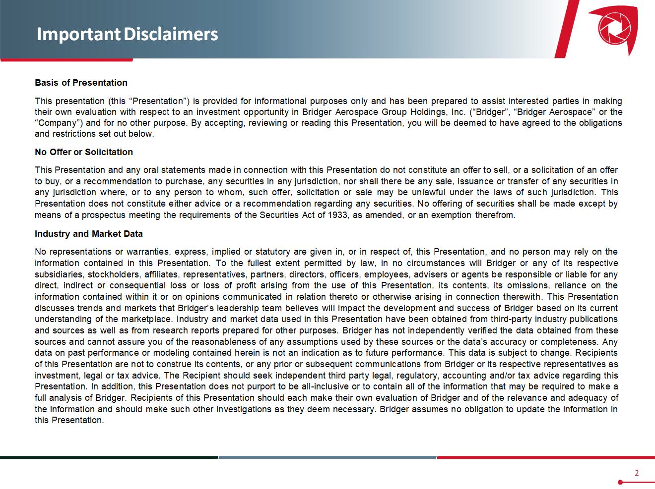 Basis of Presentation This presentation (this “Presentation”) is provided for informational purposes only and has been prepared to assist interested parties in making their own evaluation with respect to an investment opportunity in Bridger Aerospace Group Holdings, Inc . (“Bridger”, “Bridger Aerospace” or the “Company”) and for no other purpose . By accepting, reviewing or reading this Presentation, you will be deemed to have agreed to the obligations and restrictions set out below . No Offer or Solicitation This Presentation and any oral statements made in connection with this Presentation do not constitute an offer to sell, or a solicitation of an offer to buy, or a recommendation to purchase, any securities in any jurisdiction, nor shall there be any sale, issuance or transfer of any securities in any jurisdiction where, or to any person to whom, such offer, solicitation or sale may be unlawful under the laws of such jurisdiction . This Presentation does not constitute either advice or a recommendation regarding any securities . No offering of securities shall be made except by means of a prospectus meeting the requirements of the Securities Act of 1933 , as amended, or an exemption therefrom . Industry and Market Data No representations or warranties, express, implied or statutory are given in, or in respect of, this Presentation, and no person may rely on the information contained in this Presentation . To the fullest extent permitted by law, in no circumstances will Bridger or any of its respective subsidiaries, stockholders, affiliates, representatives, partners, directors, officers, employees, advisers or agents be responsible or liable for any direct, indirect or consequential loss or loss of profit arising from the use of this Presentation, its contents, its omissions, reliance on the information contained within it or on opinions communicated in relation thereto or otherwise arising in connection therewith . This Presentation discusses trends and markets that Bridger’s leadership team believes will impact the development and success of Bridger based on its current understanding of the marketplace . Industry and market data used in this Presentation have been obtained from third - party industry publications and sources as well as from research reports prepared for other purposes . Bridger has not independently verified the data obtained from these sources and cannot assure you of the reasonableness of any assumptions used by these sources or the data’s accuracy or completeness . Any data on past performance or modeling contained herein is not an indication as to future performance . This data is subject to change . Recipients of this Presentation are not to construe its contents, or any prior or subsequent communications from Bridger or its respective representatives as investment, legal or tax advice . The Recipient should seek independent third party legal, regulatory, accounting and/or tax advice regarding this Presentation . In addition, this Presentation does not purport to be all - inclusive or to contain all of the information that may be required to make a full analysis of Bridger . Recipients of this Presentation should each make their own evaluation of Bridger and of the relevance and adequacy of the information and should make such other investigations as they deem necessary . Bridger assumes no obligation to update the information in this Presentation . Important Disclaimers 2