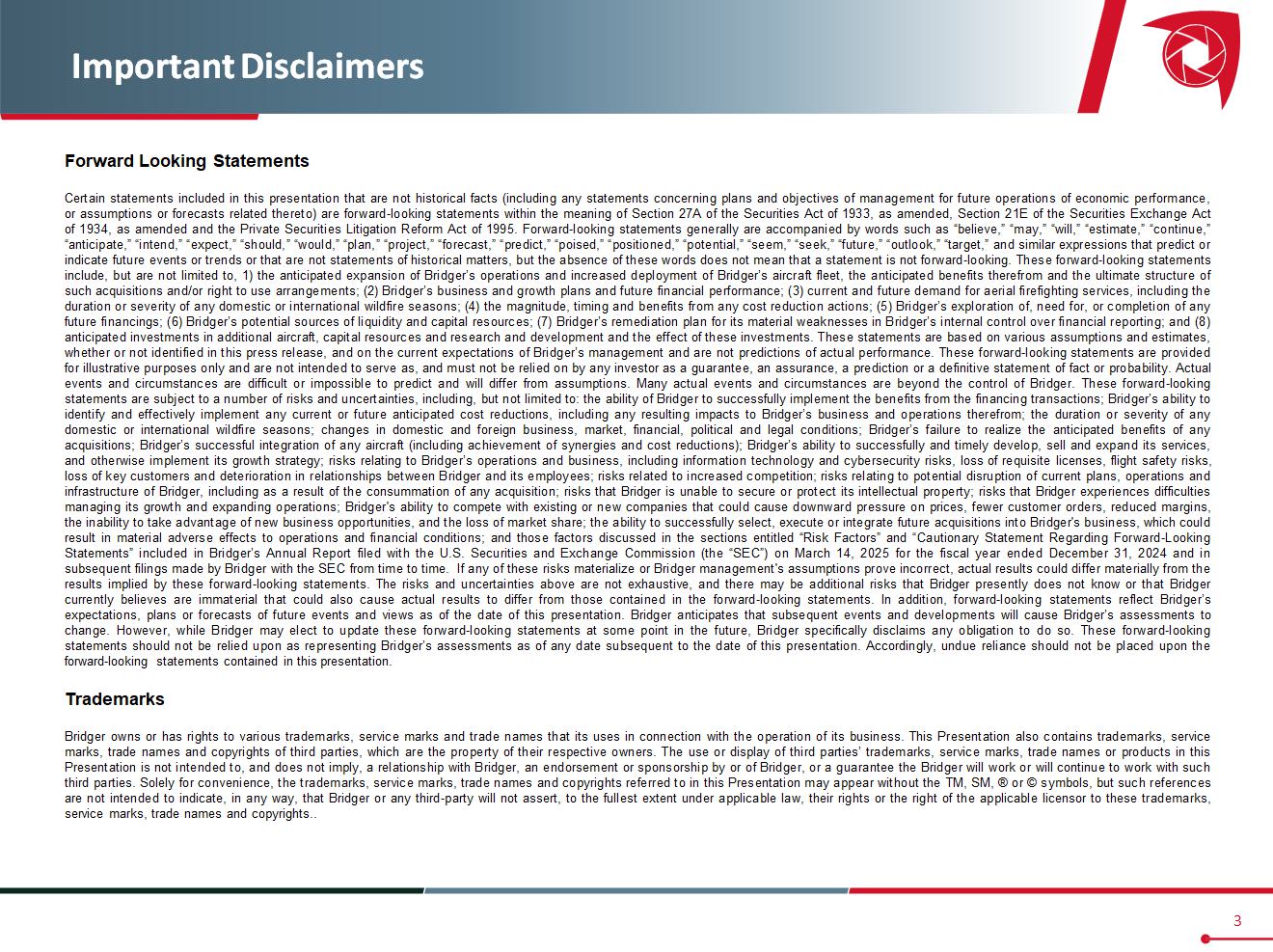 Forward Looking Statements Certain statements included in this presentation that are not historical facts (including any statements concerning plans and objectives of management for future operations of economic performance, or assumptions or forecasts related thereto) are forward - looking statements within the meaning of Section 27 A of the Securities Act of 1933 , as amended, Section 21 E of the Securities Exchange Act of 1934 , as amended and the Private Securities Litigation Reform Act of 1995 . Forward - looking statements generally are accompanied by words such as “believe,” “may,” “will,” “estimate,” “continue,” “anticipate,” “intend,” “expect,” “should,” “would,” “plan,” “project,” “forecast,” “predict,” “poised,” “positioned,” “potential,” “seem,” “seek,” “future,” “outlook,” “target,” and similar expressions that predict or indicate future events or trends or that are not statements of historical matters, but the absence of these words does not mean that a statement is not forward - looking . These forward - looking statements include, but are not limited to, 1 ) the anticipated expansion of Bridger’s operations and increased deployment of Bridger’s aircraft fleet, the anticipated benefits therefrom and the ultimate structure of such acquisitions and/or right to use arrangements ; ( 2 ) Bridger’s business and growth plans and future financial performance ; ( 3 ) current and future demand for aerial firefighting services, including the duration or severity of any domestic or international wildfire seasons ; ( 4 ) the magnitude, timing and benefits from any cost reduction actions ; ( 5 ) Bridger’s exploration of, need for, or completion of any future financings ; ( 6 ) Bridger’s potential sources of liquidity and capital resources ; ( 7 ) Bridger’s remediation plan for its material weaknesses in Bridger’s internal control over financial reporting ; and ( 8 ) anticipated investments in additional aircraft, capital resources and research and development and the effect of these investments . These statements are based on various assumptions and estimates, whether or not identified in this press release, and on the current expectations of Bridger’s management and are not predictions of actual performance . These forward - looking statements are provided for illustrative purposes only and are not intended to serve as, and must not be relied on by any investor as a guarantee, an assurance, a prediction or a definitive statement of fact or probability . Actual events and circumstances are difficult or impossible to predict and will differ from assumptions . Many actual events and circumstances are beyond the control of Bridger . These forward - looking statements are subject to a number of risks and uncertainties, including, but not limited to : the ability of Bridger to successfully implement the benefits from the financing transactions ; Bridger’s ability to identify and effectively implement any current or future anticipated cost reductions, including any resulting impacts to Bridger’s business and operations therefrom ; the duration or severity of any domestic or international wildfire seasons ; changes in domestic and foreign business, market, financial, political and legal conditions ; Bridger’s failure to realize the anticipated benefits of any acquisitions ; Bridger’s successful integration of any aircraft (including achievement of synergies and cost reductions) ; Bridger’s ability to successfully and timely develop, sell and expand its services, and otherwise implement its growth strategy ; risks relating to Bridger’s operations and business, including information technology and cybersecurity risks, loss of requisite licenses, flight safety risks, loss of key customers and deterioration in relationships between Bridger and its employees ; risks related to increased competition ; risks relating to potential disruption of current plans, operations and infrastructure of Bridger, including as a result of the consummation of any acquisition ; risks that Bridger is unable to secure or protect its intellectual property ; risks that Bridger experiences difficulties managing its growth and expanding operations ; Bridger's ability to compete with existing or new companies that could cause downward pressure on prices, fewer customer orders, reduced margins, the inability to take advantage of new business opportunities, and the loss of market share ; the ability to successfully select, execute or integrate future acquisitions into Bridger's business, which could result in material adverse effects to operations and financial conditions ; and those factors discussed in the sections entitled “Risk Factors” and “Cautionary Statement Regarding Forward - Looking Statements” included in Bridger’s Annual Report filed with the U . S . Securities and Exchange Commission (the “SEC”) on March 14 , 2025 for the fiscal year ended December 31 , 2024 and in subsequent filings made by Bridger with the SEC from time to time . If any of these risks materialize or Bridger management's assumptions prove incorrect, actual results could differ materially from the results implied by these forward - looking statements . The risks and uncertainties above are not exhaustive, and there may be additional risks that Bridger presently does not know or that Bridger currently believes are immaterial that could also cause actual results to differ from those contained in the forward - looking statements . In addition, forward - looking statements reflect Bridger’s expectations, plans or forecasts of future events and views as of the date of this presentation . Bridger anticipates that subsequent events and developments will cause Bridger’s assessments to change . However, while Bridger may elect to update these forward - looking statements at some point in the future, Bridger specifically di