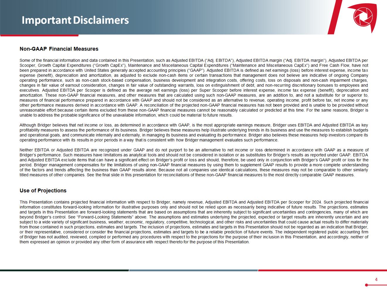 Non - GAAP Financial Measures Some of the financial information and data contained in this Presentation, such as Adjusted EBITDA (“Adj . EBITDA”), Adjusted EBITDA margin (“Adj . EBITDA margin”), Adjusted EBITDA per Scooper, Growth Capital Expenditures (“Growth CapEx”), Maintenance and Miscellaneous Capital Expenditures (“Maintenance and Miscellaneous CapEx”) and Free Cash Flow, have not been prepared in accordance with United States generally accepted accounting principles (“GAAP”) . Adjusted EBITDA is defined as net earnings (loss) before interest expense, income tax expense (benefit), depreciation and amortization, as adjusted to exclude non - cash items or certain transactions that management does not believe are indicative of ongoing Company operating performance, such as non - cash stock - based compensation, business development and integration costs, offering costs, loss on disposals and non - cash impairment charges, changes in fair value of earnout consideration, changes in fair value of outstanding warrants, loss on extinguishment of debt, and non - recurring discretionary bonuses to employees and executives . Adjusted EBITDA per Scooper is defined as the average net earnings (loss) per Super Scooper before interest expense, income tax expense (benefit), depreciation and amortization . These non - GAAP financial measures, and other measures that are calculated using such non - GAAP measures, are an addition to, and not a substitute for or superior to, measures of financial performance prepared in accordance with GAAP and should not be considered as an alternative to revenue, operating income, profit before tax, net income or any other performance measures derived in accordance with GAAP . A reconciliation of the projected non - GAAP financial measures has not been provided and is unable to be provided without unreasonable effort because certain items excluded from these non - GAAP financial measures cannot be reasonably calculated or predicted at this time . For the same reasons, Bridger is unable to address the probable significance of the unavailable information, which could be material to future results . Although Bridger believes that net income or loss, as determined in accordance with GAAP, is the most appropriate earnings measure, Bridger uses EBITDA and Adjusted EBITDA as key profitability measures to assess the performance of its business . Bridger believes these measures help illustrate underlying trends in its business and use the measures to establish budgets and operational goals, and communicate internally and externally, in managing its business and evaluating its performance . Bridger also believes these measures help investors compare its operating performance with its results in prior periods in a way that is consistent with how Bridger management evaluates such performance . Neither EBITDA or Adjusted EBITDA are recognized under GAAP and do not purport to be an alternative to net income or loss determined in accordance with GAAP as a measure of Bridger’s performance . Such measures have limitations as analytical tools and should not be considered in isolation or as substitutes for Bridger’s results as reported under GAAP . EBITDA and Adjusted EBITDA exclude items that can have a significant effect on Bridger’s profit or loss and should, therefore, be used only in conjunction with Bridger’s GAAP profit or loss for the period . Bridger management compensates for the limitations of using non - GAAP financial measures by using them to supplement GAAP results to provide a more complete understanding of the factors and trends affecting the business than GAAP results alone . Because not all companies use identical calculations, these measures may not be comparable to other similarly titled measures of other companies . See the final slide in this presentation for reconciliations of these non - GAAP financial measures to the most directly comparable GAAP measures . Use of Projections This Presentation contains projected financial information with respect to Bridger, namely revenue, Adjusted EBITDA and Adjusted EBITDA per Scooper for 2024 . Such projected financial information constitutes forward - looking information for illustrative purposes only and should not be relied upon as necessarily being indicative of future results . The projections, estimates and targets in this Presentation are forward - looking statements that are based on assumptions that are inherently subject to significant uncertainties and contingencies, many of which are beyond Bridger’s control . See “Forward - Looking Statements” above . The assumptions and estimates underlying the projected, expected or target results are inherently uncertain and are subject to a wide variety of significant business, weather, economic, regulatory, competitive, technological, and other risks and uncertainties that could cause actual results to differ materially from those contained in such projections, estimates and targets . The inclusion of projections, estimates and targets in this Presentation should not be regarded as an indication that Bridger, or their representative, considered or consider the financial projections, estimates and targets to be a reliable prediction of future events . The independent registered public accounting firm of Bridger has not audited, reviewed, compiled or performed any procedures with respect to the projections for the purpose of their inclusion in this Presentation, and accordingly, neither of them expressed an opinion or provided any other form of assurance with respect thereto for the purpose of this Presentation . Important Disclaimers 4