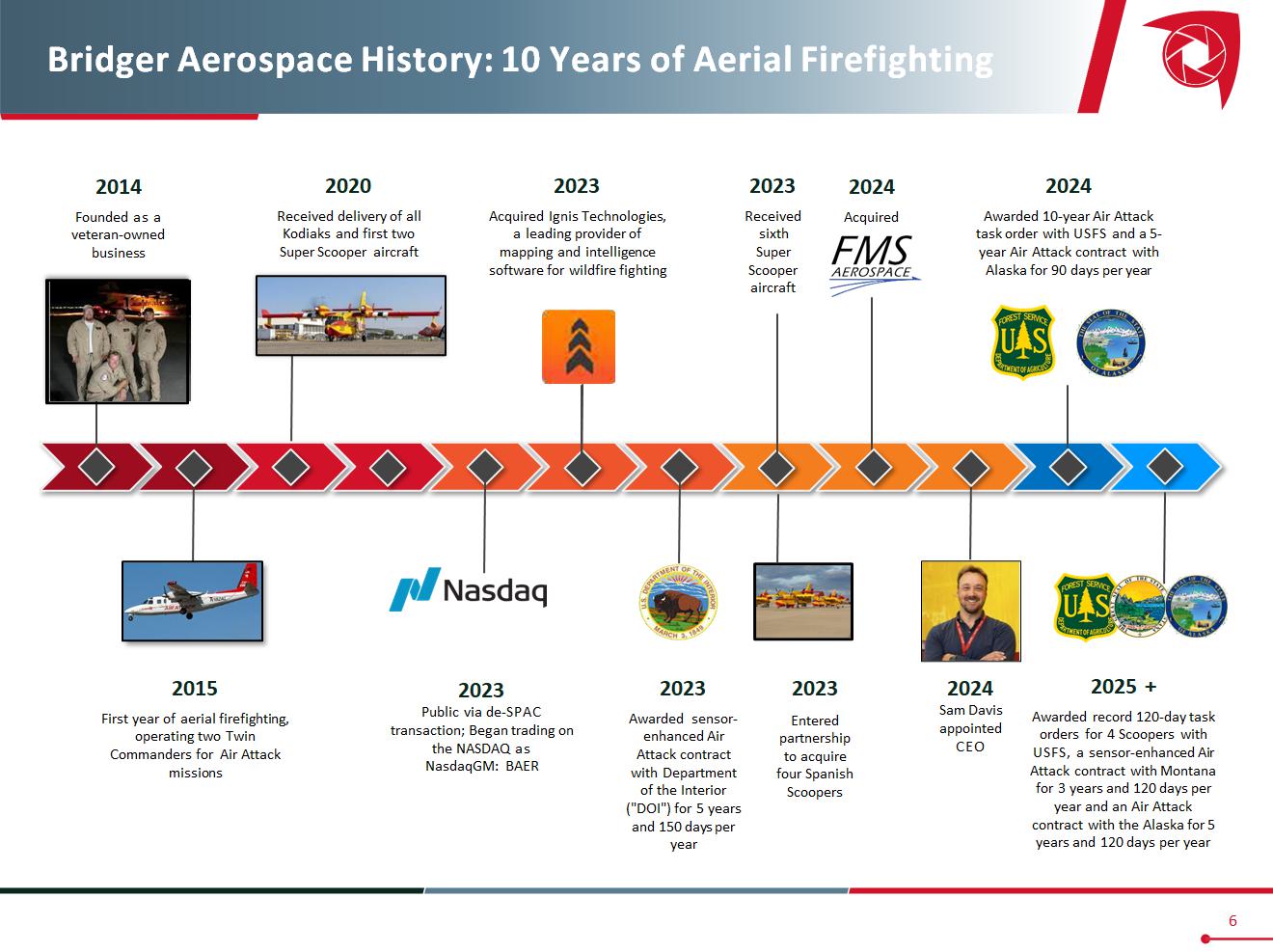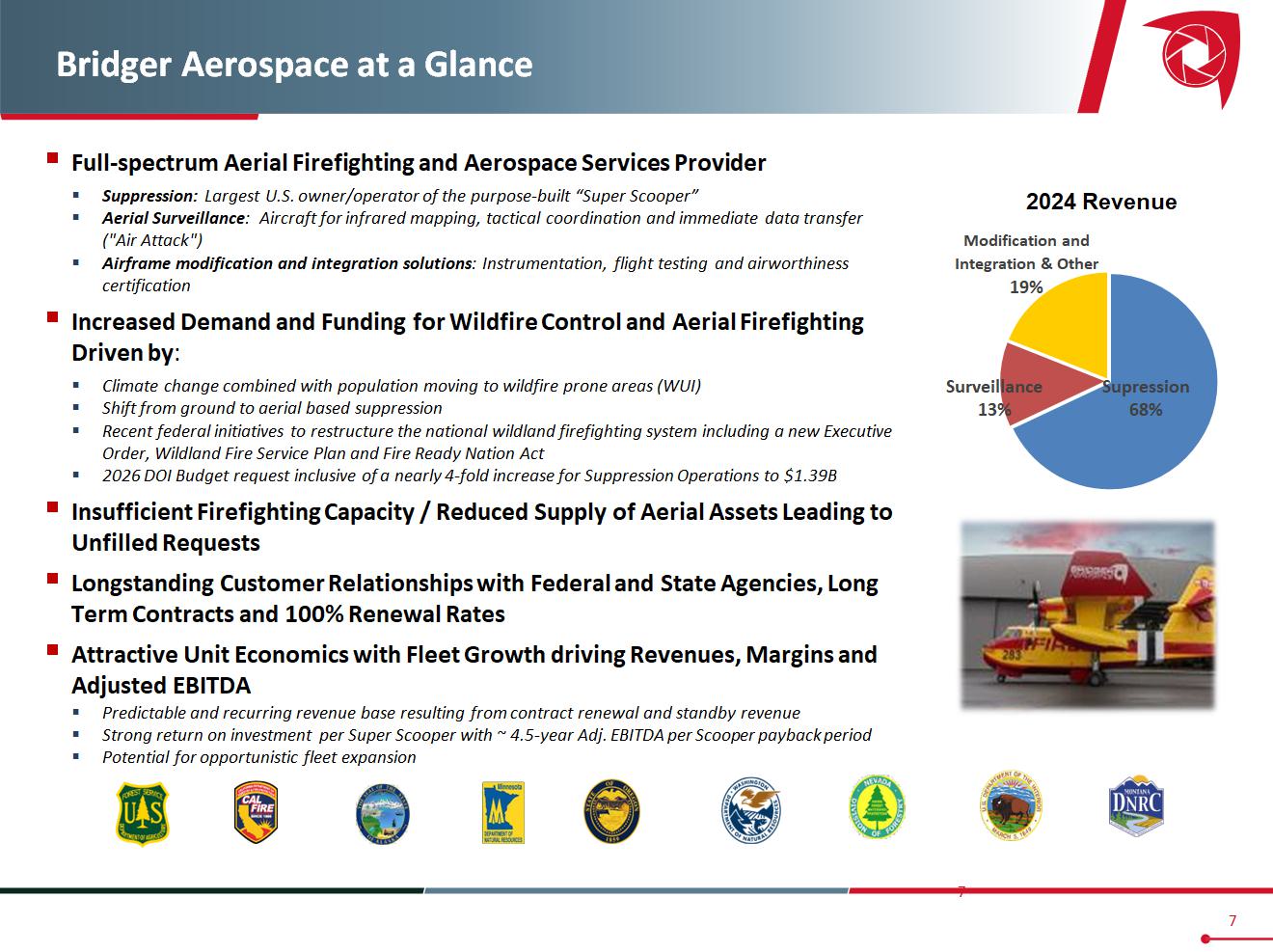 Bridger Aerospace History: 10 Years of Aerial Firefighting 6 2023 Awarded sensor - enhanced Air Attack contract with Department of the Interior ("DOI") for 5 years and 150 days per year 2014 Founded as a veteran - owned business 2015 First year of aerial firefighting, operating two Twin Commanders for Air Attack missions 2020 Received delivery of all Kodiaks and first two Super Scooper aircraft 2023 P ublic via de - SPAC transaction ; B egan trading on the NASDAQ as NasdaqGM: BAER 2024 Sam Davis appointed CEO 2025 + Awarded record 120 - day task orders for 4 Scoopers with USFS, a sensor - enhance d Air Attack contract with Montana for 3 years and 120 days per year and an Air Attack contract with the Alaska for 5 years and 120 days per year 2023 Acquired Ignis Technologies, a leading provider of mapping and intelligence software for wildfire fighting 2024 Acquired 2024 Awarded 10 - year Air Attack task order with USFS and a 5 - year Air Attack contract with Alaska for 90 days per year 202 3 Received sixth Super Scooper aircraft 2023 Entered partnership to acquire four Spanish Scoopers
