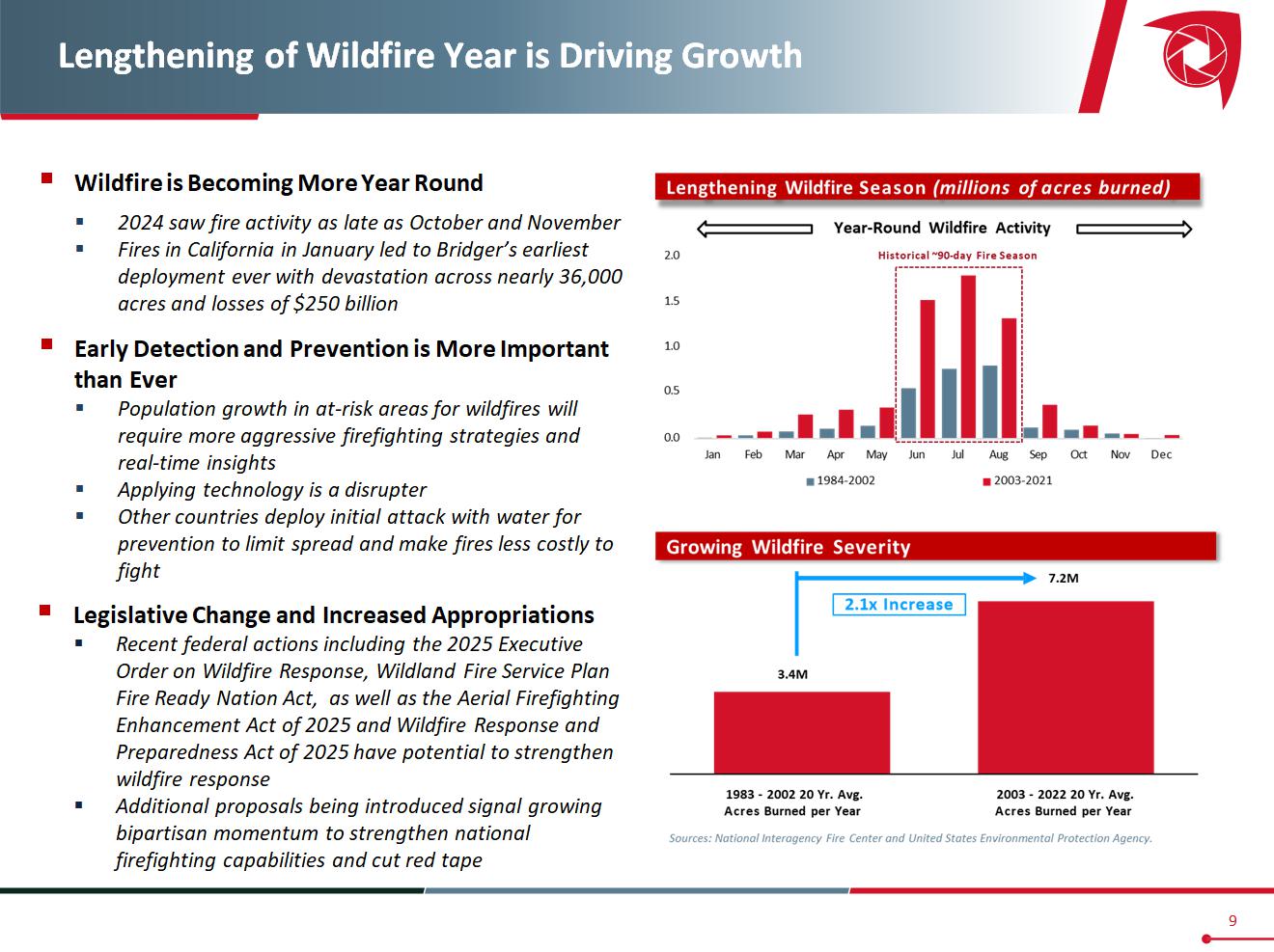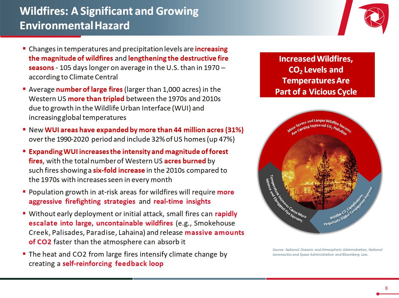 Wildfires: A Significant and Growing Environmental Hazard Increased Wildfires, CO 2 Levels and Temperatures Are Part of a Vicious Cycle Source: National Oceanic and Atmospheric Administration, National Aeronautics and Space Administration and Bloomberg Law. ▪ Changes in temperatures and precipitation levels are increasing the magnitude of wildfires and lengthening the destructive fire seasons - 105 days longer on average in the U.S. than in 1970 – according to Climate Central ▪ Average number of large fires (larger than 1,000 acres) in the Western US more than tripled between the 1970s and 2010s due to growth in the Wildlife Urban Interface (WUI) and increasing global temperatures ▪ New WUI areas have expanded by more than 44 million acres (31%) over the 1990 - 2020 period and include 32% of US homes (up 47%) ▪ Expanding WUI increases the intensity and magnitude of forest fires , with the t otal number of Western US acres burned by such fires showing a six - fold increase in the 2010s compared t o the 1970s with increases seen in every month ▪ Population growth in at - risk areas for wildfires will require more aggressive firefighting strategies and real - time insights ▪ Without early deployment or initial attack, small fires can rapidly escalate into large, uncontainable wildfires (e.g., Smokehouse Creek, Palisades, Paradise, Lahaina) and release massive amounts of CO2 faster than the atmosphere can absorb it ▪ The heat and CO2 from large fires intensify climate change by creating a self - reinforcing feedback loop 8