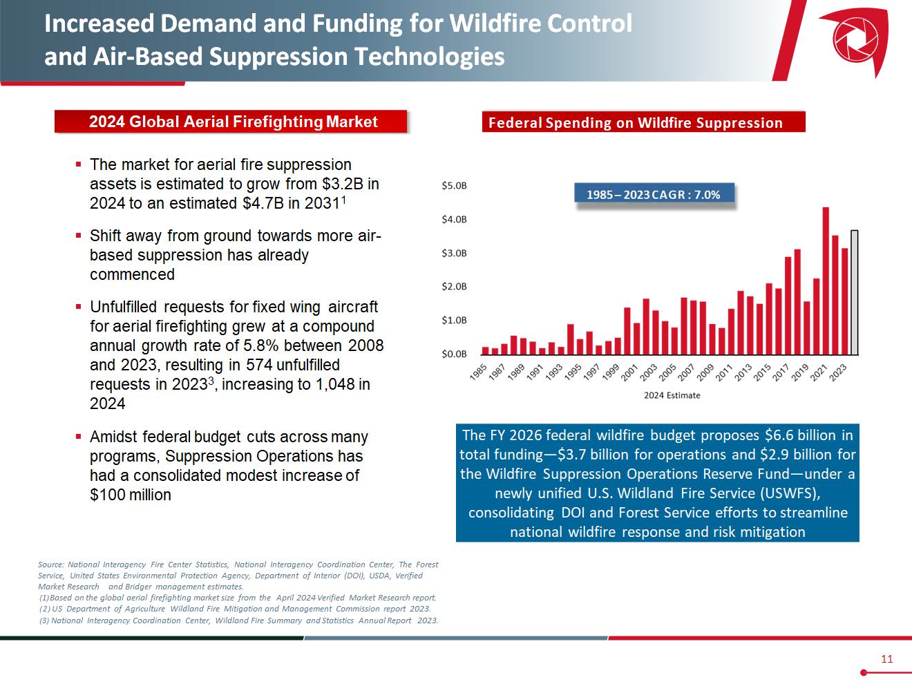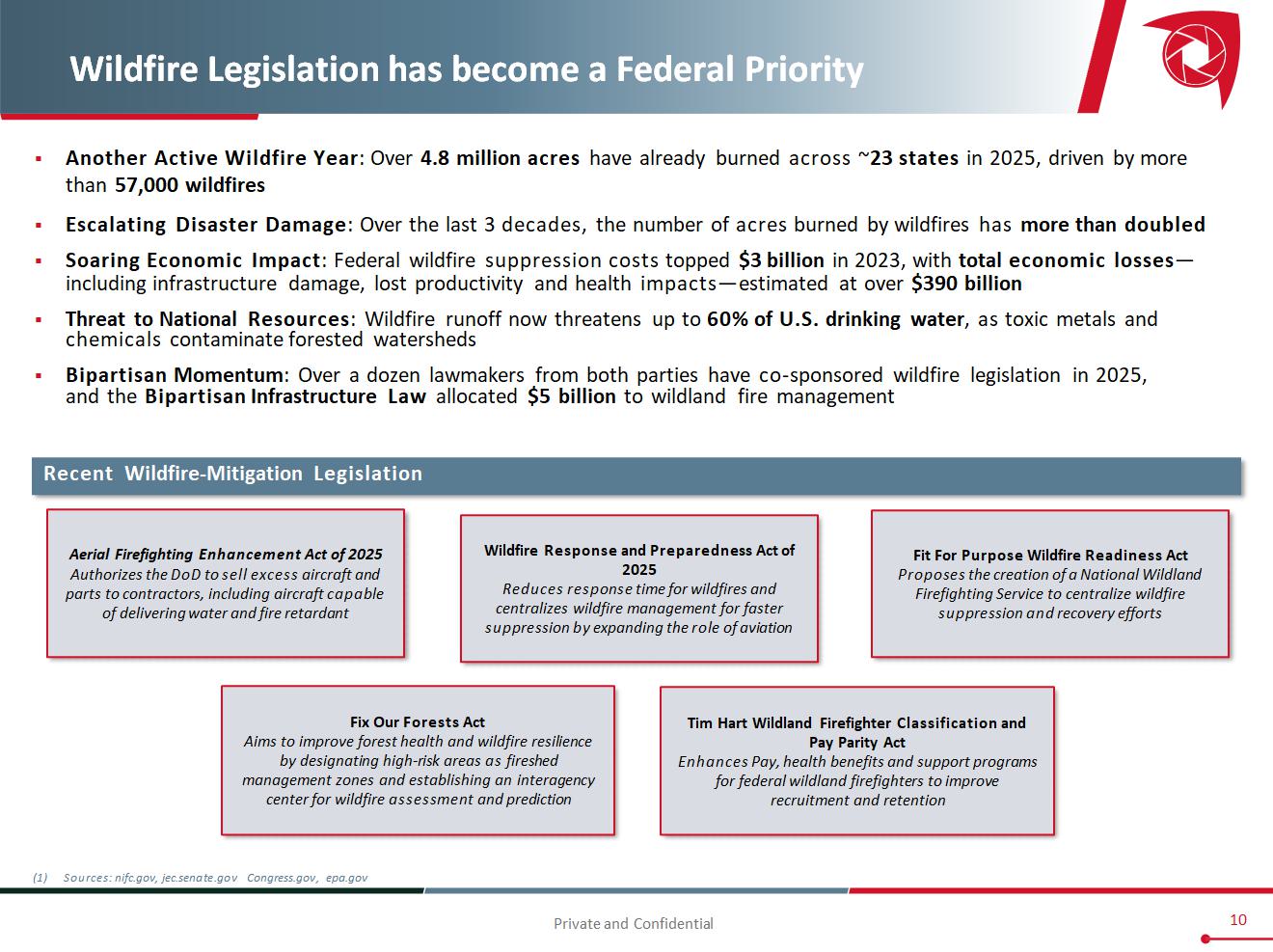 Wildfire Legislation has become a Federal Priority Aerial Firefighting Enhancement Act of 2025 Authorizes the DoD to sell excess aircraft and parts to contractors, including aircraft capable of delivering water and fire retardant Fix Our Forests Act Aims to improve forest health and wildfire resilience by designating high - risk areas as fireshed management zones and establishing an interagency center for wildfire assessment and prediction Wildfire Response and Preparedness Act of 2025 Reduces response time for wildfires and centralizes wildfire management for faster suppression by expanding the role of aviation Tim Hart Wildland Firefighter Classification and Pay Parity Act Enhances Pay, health benefits and support programs for federal wildland firefighters to improve recruitment and retention Fit For Purpose Wildfire Readiness Act Proposes the creation of a National Wildland Firefighting Service to centralize wildfire suppression and recovery efforts (1) Sources: nifc.gov, jec.senate.gov Congress.gov, epa.gov ▪ Another Active Wildfire Year : Over 4.8 million acres have already burned across ~ 23 states in 2025, driven by more than 57 ,000 wildfires ▪ Escalating Disaster Damage : Over the last 3 decades, the number of acres burned by wildfires has more than doubled ▪ Soaring Economic Impact : Federal wildfire suppression costs topped $3 billion in 2023, with total economic losses — including infrastructure damage, lost productivity and health impacts — estimated at over $390 billion ▪ Threat to National Resources : Wildfire runoff now threatens up to 60% of U.S. drinking water , as toxic metals and chemicals contaminate forested watersheds ▪ Bipartisan Momentum : Over a dozen lawmakers from both parties have co - sponsored wildfire legislation in 2025, and the Bipartisan Infrastructure Law allocated $5 billion to wildland fire management Recent Wildfire - Mitigation Legislation Private and Confidential 10