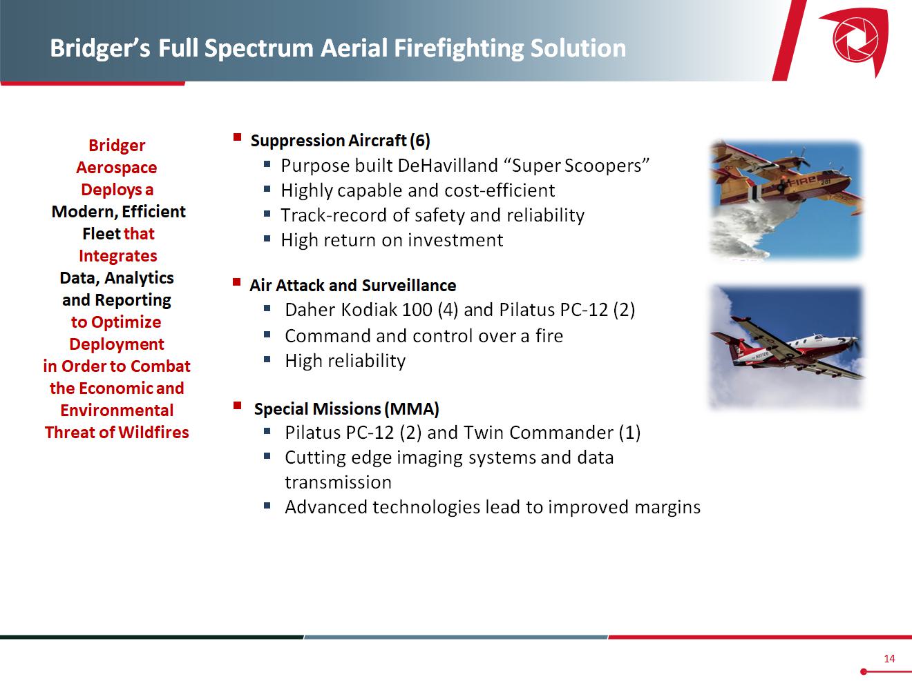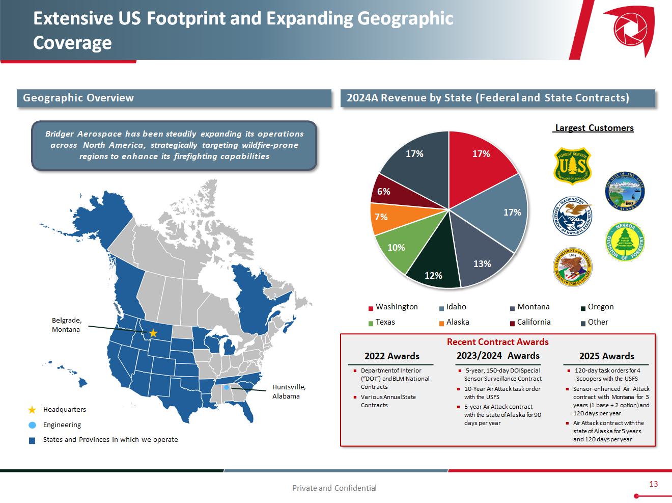 Extensive US Footprint and Expanding Geographic Coverage Geographic Overview 2024A Revenue by State (Federal and State Contracts) Bridger Aerospace has been steadily expanding its operations across North America, strategically targeting wildfire - prone regions to enhance its firefighting capabilities  Departmentof Interior (“DOI”) and BLM National Contracts  Various Annual State Contracts  5 - year, 150 - day DOISpecial Sensor Surveillance Contract  10 - Year Air Attack task order with the USFS  5 - year Air Attack contract with the state of Alaska for 90 days per year Belgrade, Montana Huntsville, Alabama Largest Customers 17% 17% 13% 12% 10% 7% 6% 17% Washington Texas Idaho Alaska Montana California Oregon Other  120 - day task orders for 4 Scoopers with the USFS  Sensor - enhanced Air Attack contract with Montana for 3 years ( 1 base + 2 option) and 120 days per year  Air Attack contract with the state of Alaska for 5 years and 120 days per year 2022 Awards 2025 Awards Recent Contract Awards 2023/2024 Awards Headquarters Engineering States and Provinces in which we operate Private and Confidential 13