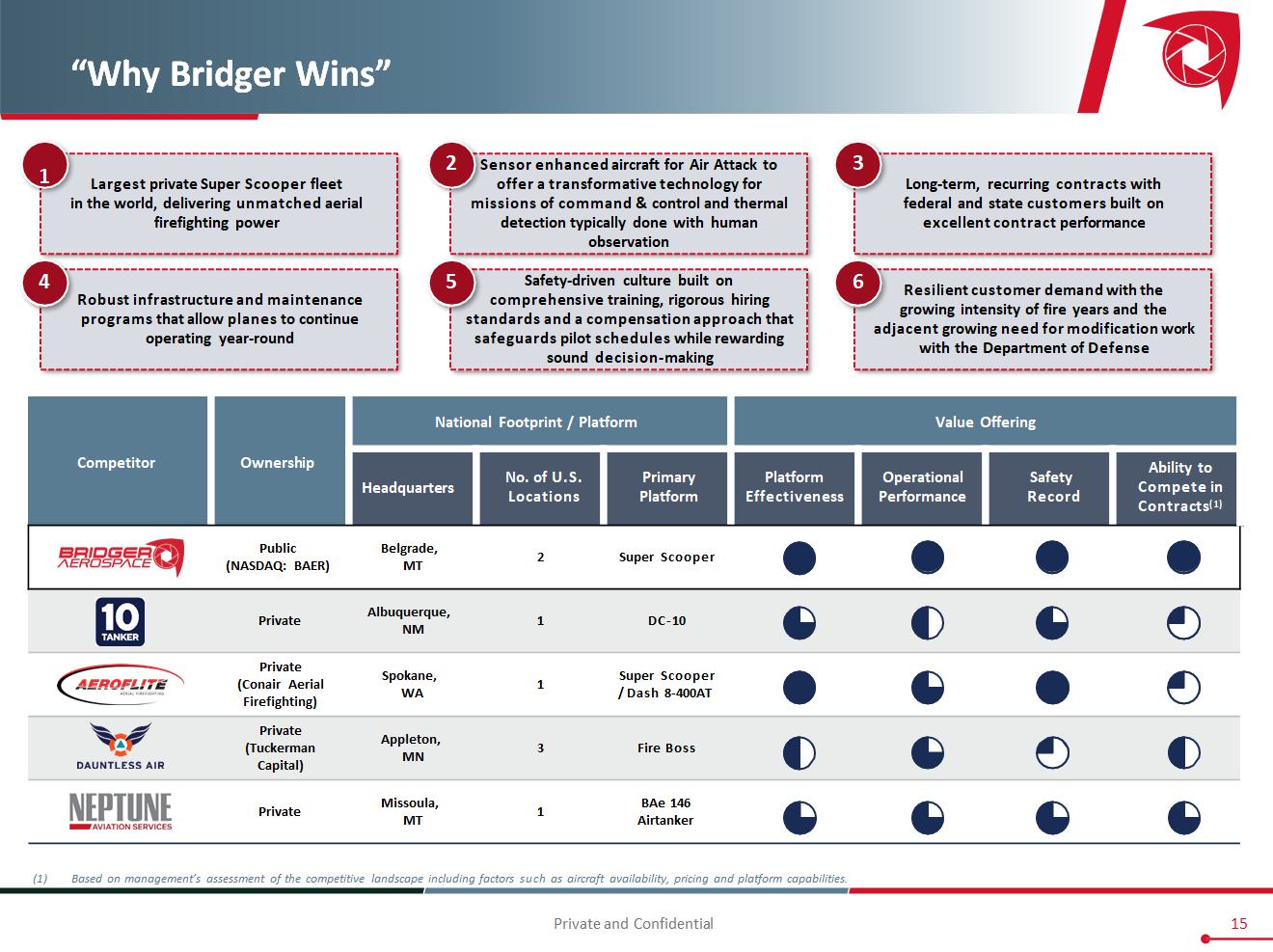 “Why Bridger Wins” Value Offering National Footprint / Platform Ownership Competitor Ability to Compete in Contracts (1) Safety Record Operational Performance Platform Effectiveness Primary Platform No. of U.S. Locations Headquarters Super Scooper 2 Belgrade, MT Public (NASDAQ: BAER) DC - 10 1 Albuquerque, NM Private Super Scooper / Dash 8 - 400AT 1 Spokane, WA Private (Conair Aerial Firefighting) Fire Boss 3 Appleton, MN Private (Tuckerman Capital) BAe 146 Airtanker 1 Missoula, MT Private Largest private Super Scooper fleet in the world, delivering unmatched aerial firefighting power Robust infrastructure and maintenance programs that allow planes to continue operating year - round Sensor enhanced aircraft for Air Attack to offer a transformative technology for missions of command & control and thermal detection typically done with human observation Safety - driven culture built on comprehensive training, rigorous hiring standards and a compensation approach that safeguards pilot schedules while rewarding sound decision - making Long - term, recurring contracts with federal and state customers built on excellent contract performance Resilient customer demand with the growing intensity of fire years and the adjacent growing need for modification work with the Department of Defense 1 2 3 4 5 6 (1) Based on management’s assessment of the competitive landscape including factors such as aircraft availability, pricing and platform capabilities. Private and Confidential 15