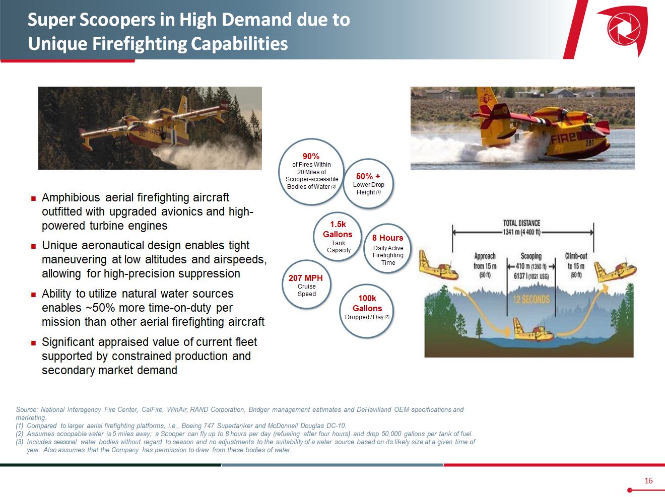 Source: National Interagency Fire Center, CalFire, WinAir, RAND Corporation, Bridger management estimates and DeHavilland OEM specifications and marketing. (1) Compared to larger aerial firefighting platforms, i.e., Boeing 747 Supertanker and McDonnell Douglas DC - 10. (2) Assumes scoopable water is 5 miles away; a Scooper can fly up to 8 hours per day (refueling after four hours) and drop 50,000 gallons per tank of fuel. (3) Includes season al water bodies without regard to season and no adjustments to the suitability of a water source based on its likely size at a given time of year. Also assumes that the Company has permission to draw from these bodies of water.  Amphibious aerial firefighting aircraft outfitted with upgraded avionics and high - powered turbine engines  Unique aeronautical design enables tight maneuvering at low altitudes and airspeeds, allowing for high - precision suppression  Ability to utilize natural water sources enables ~50% more time - on - duty per mission than other aerial firefighting aircraft  Significant appraised value of current fleet supported by constrained production and secondary market demand 207 MPH Cruise Speed 8 Hours Daily Active Firefighting Time 1.5k Gallons Tank Capacity 90% of Fires Within 20 Miles of Scooper - accessible Bodies of Water (3) 100k Gallons Dropped / Day (2) 50% + Lower Drop Height (1) Super Scoopers in High Demand due to Unique Firefighting Capabilities 16