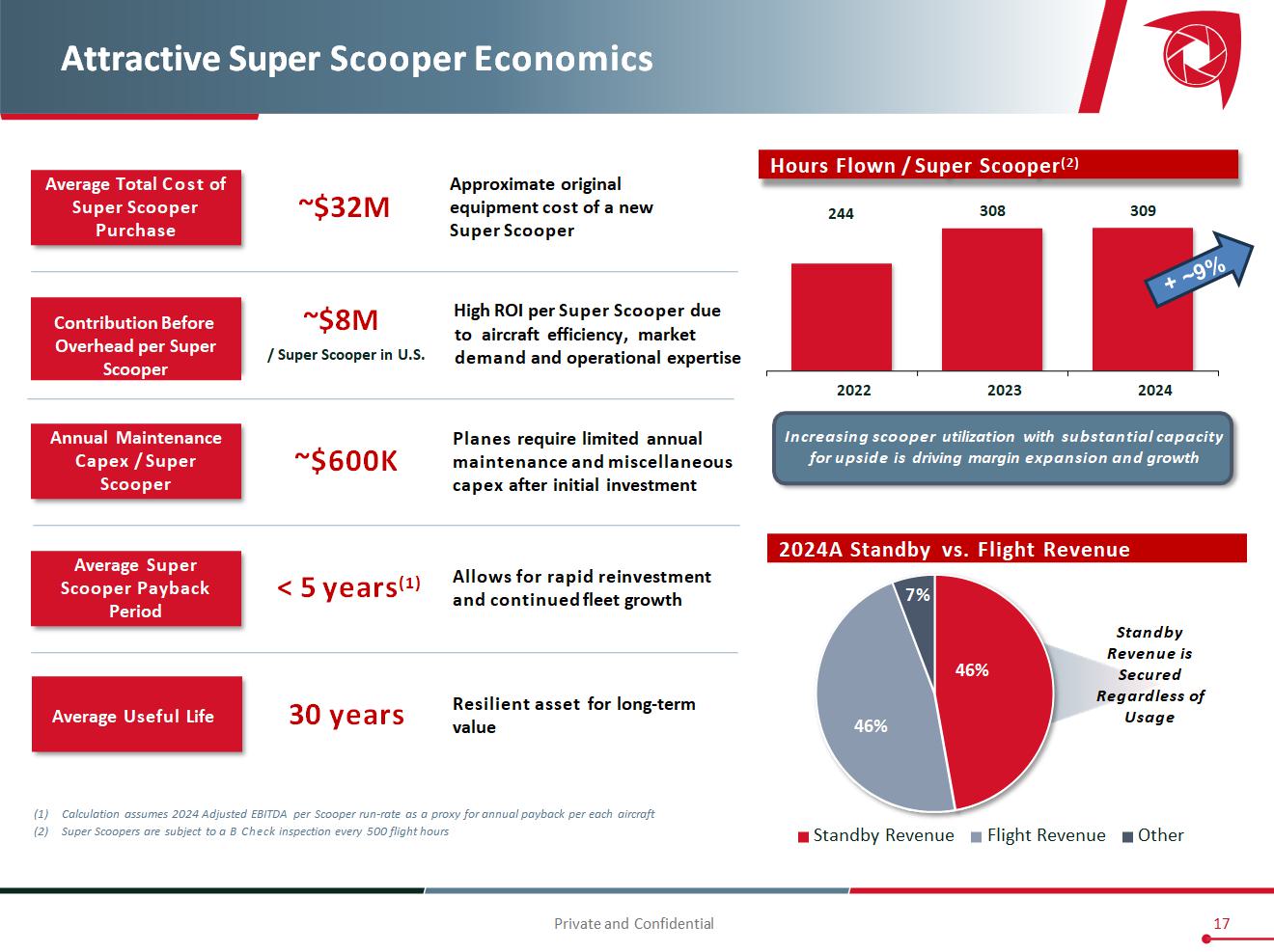 Attractive Super Scooper Economics ~$32M Approximate original equipment cost of a new Super Scooper Average Total Cost of Super Scooper Purchase ~$600K Planes require limited annual maintenance and miscellaneous capex after initial investment Annual Maintenance Capex / Super Scooper < 5 years ( 1 ) Allows for rapid reinvestment and continued fleet growth Average Super Scooper Payback Period (1) Calculation assumes 202 4 Adjusted EBITDA per Scooper run - rate as a proxy for annual payback per each aircraft (2) Super Scoopers are subject to a B Check inspection every 500 flight hours 30 years Resilient asset for long - term value Average Useful Life Hours Flown / Super Scooper ( 2 ) 244 308 309 2022 2023 2024 Increasing scooper utilization with substantial capacity for upside is driving margin expansion and growth Contribution Before Overhead per Super Scooper ~$ 8 M High ROI per Super Scooper due / Super Scooper in U.S. to aircraft efficiency, market demand and operational expertise Private and Confidential 17 2024A Standby vs. Flight Revenue 4 6 % 47% 7 % Standby Revenue Flight Revenue Other Standby Revenue is Secured Regardless of Usage 4 6 %