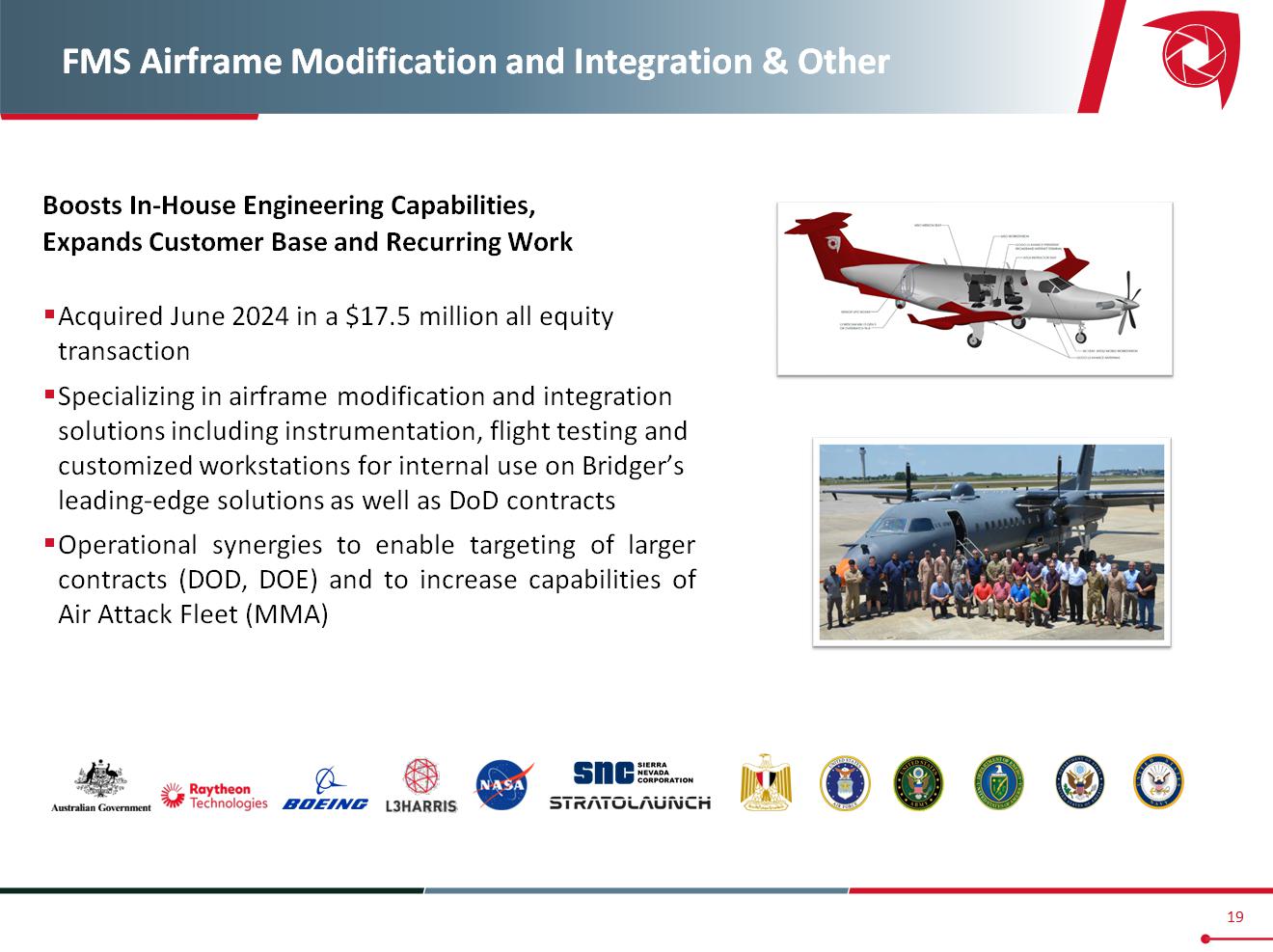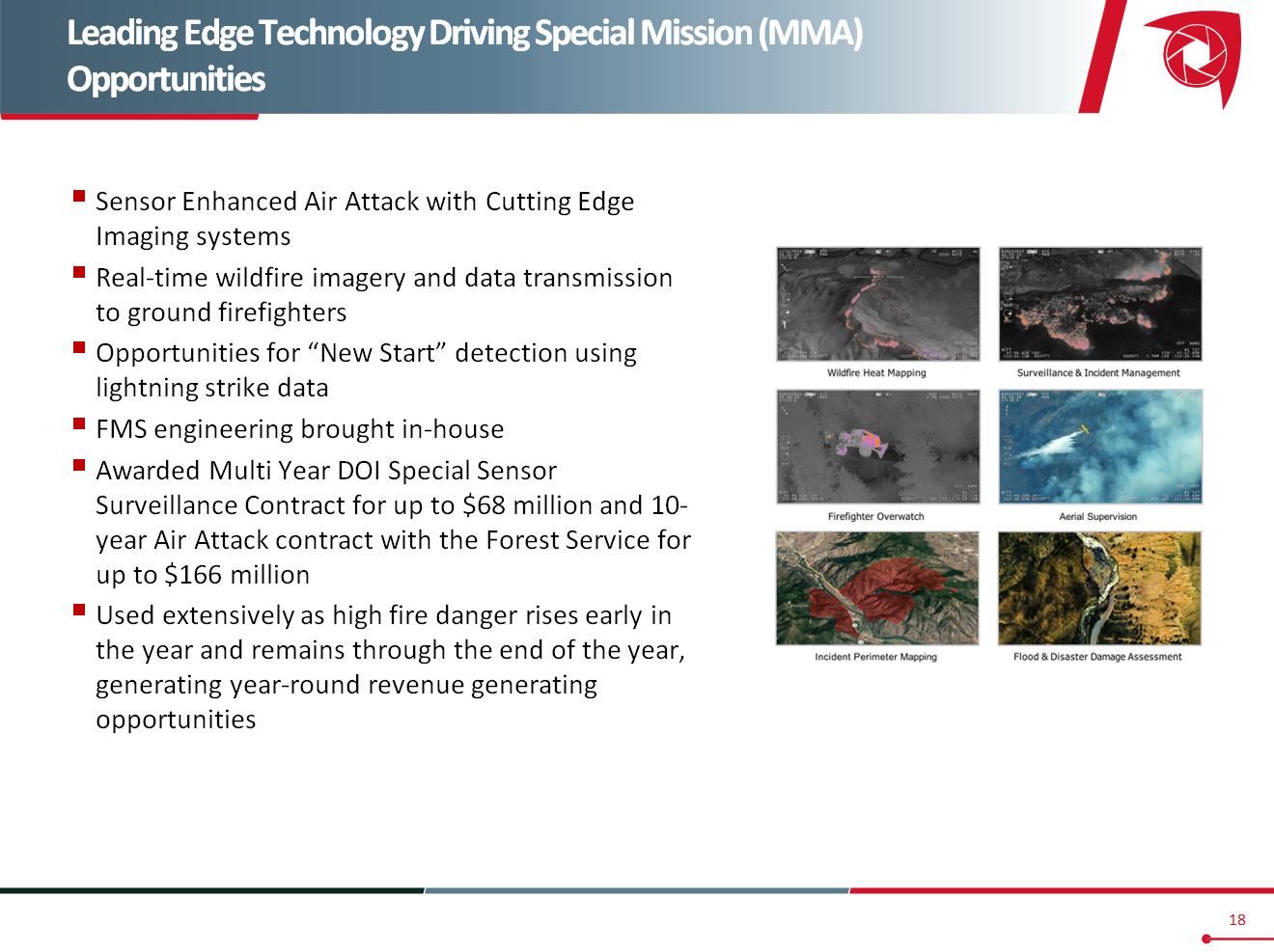 Leading Edge Technology Driving Special Mission (MMA) Opportunities 18 ▪ Sensor Enhanced Air Attack with Cutting Edge Imaging systems ▪ Real - time wildfire imagery and data transmission to ground firefighters ▪ Opportunities for “New Start” detection using lightning strike data ▪ FMS engineering brought in - house ▪ Awarded Multi Year DOI Special Sensor Surveillance Contract for up to $68 million and 10 - year Air Attack contract with the Forest Service for up to $166 million ▪ Used extensively as high fire danger rises early in the year and remains through the end of the year, generating year - round revenue generating opportunities