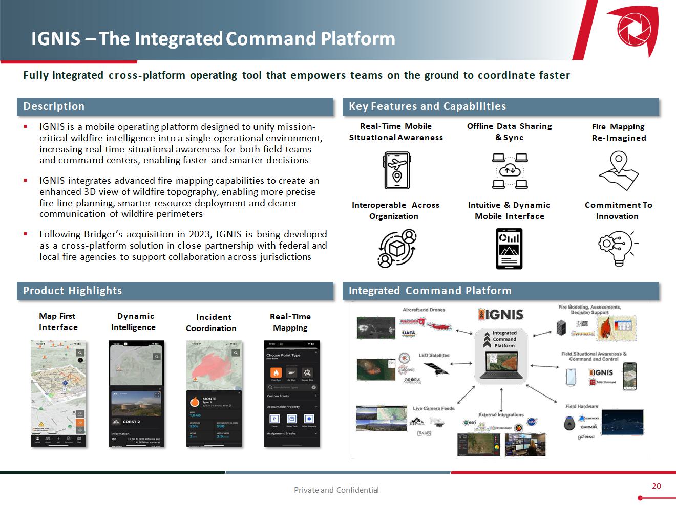 Interoperable Across Organization IGNIS – The Integrated Command Platform Fully integrated cross - platform operating tool that empowers teams on the ground to coordinate faster Description Key Features and Capabilities Product Highlights Integrated Command Platform ▪ IGNIS is a mobile operating platform designed to unify mission - critical wildfire intelligence into a single operational environment, increasing real - time situational awareness for both field teams and command centers, enabling faster and smarter decisions ▪ IGNIS integrates advanced fire mapping capabilities to create an enhanced 3D view of wildfire topography, enabling more precise fire line planning, smarter resource deployment and clearer communication of wildfire perimeters ▪ Following Bridger’s acquisition in 2023 , IGNIS is being developed as a cross - platform solution in close partnership with federal and local fire agencies to support collaboration across jurisdictions Map First Interface Dynamic Intelligence Incident Coordination Real - Time Mapping Real - Time Mobile Situational Awareness Offline Data Sharing & Sync Fire Mapping Re - Imagined Intuitive & Dynamic Mobile Interface Commitment To Innovation Private and Confidential 20