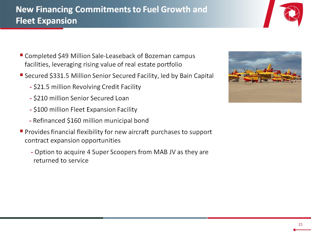 ▪ Completed $49 Million Sale - Leaseback of Bozeman campus facilities, leveraging rising value of real estate portfolio ▪ Secured $331.5 Million Senior Secured Facility, led by Bain Capital - $21.5 million Revolving Credit Facility - $210 million Senior Secured Loan - $100 million Fleet Expansion Facility - Refinanced $160 million municipal bond ▪ Provides financial flexibility for new aircraft purchases to support contract expansion opportunities - Option t o acquire 4 Super Scoopers from MAB JV as they are returned to service New Financing Commitments to Fuel Growth and Fleet Expansion 21