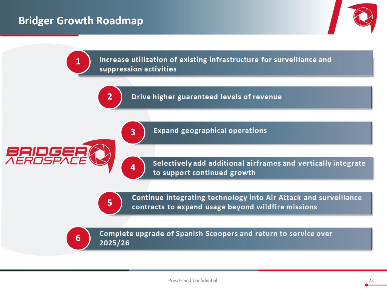 Selectively add additional airframes and vertically integrate to support continued growth 4 5 Bridger Growth Roadmap Increase utilization of existing infrastructure for surveillance and suppression activities 1 Drive higher guaranteed levels of revenue 2 Expand geographical operations 3 6 Private and Confidential 22 Complete upgrade of Spanish Scoopers and return to service over 2025/26 Continue integrating technology into Air Attack and surveillance contracts to expand usage beyond wildfire missions
