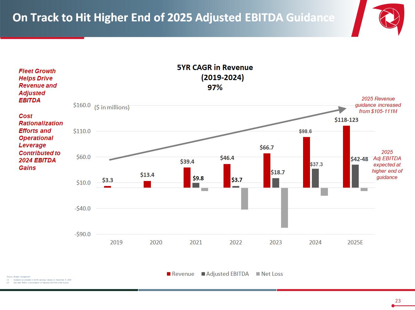 On Track to Hit Higher End of 2025 Adjusted EBITDA Guidance $3.3 $13.4 $39.4 $46.4 $66.7 $118 - 123 $18.7 $42 - 48 -$90.0 -$40.0 $10.0 $60.0 $110.0 $160.0 2019 2020 2021 2022 2023 2024 2025E ($ in millions) Revenue Adjusted EBITDA Net Loss $ 98.6 $37.3 5YR CAGR in Revenue (2019 - 2024) 97% $9.8 $3.7 Fleet Growth Helps Drive Revenue and Adjusted EBITDA Cost Rationalization Efforts and Operational Leverage Contributed to 2024 EBITDA Gains Source: Bridger management. (1) Guidance as provided in Q3’25 earnings release on November 6, 2025 (2) See slide #28for a reconciliation of Adjusted EBITDA to Net Income 23 2025 Revenue guidance increased from $105 - 111M 2025 Adj EBITDA expected at higher end of guidance