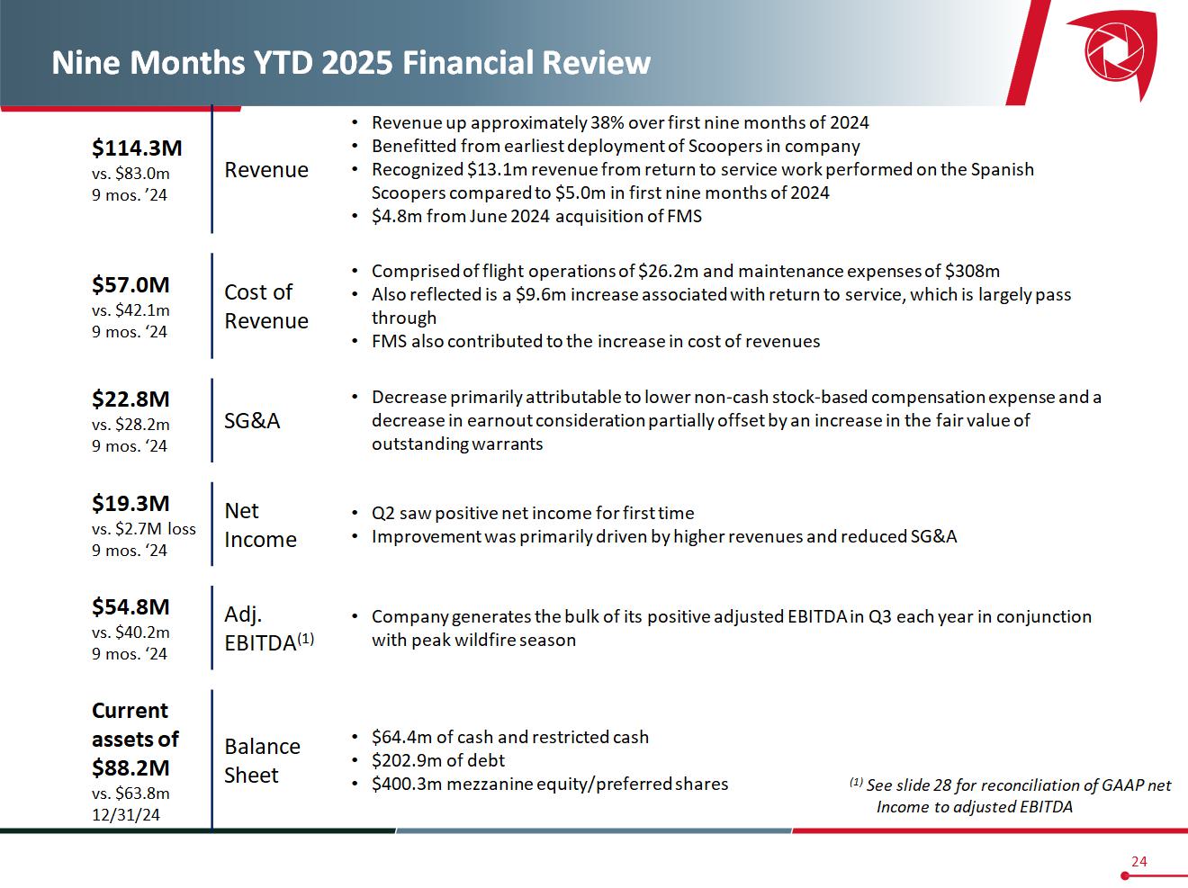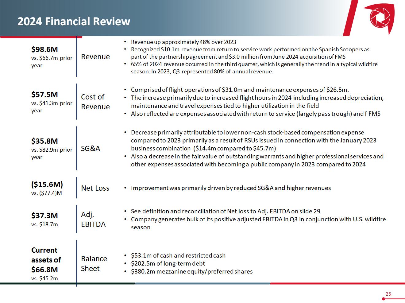 Nine Months YTD 2025 Financial Review • Revenue up approximately 38% over first nine months of 2024 • Benefitted from earliest deployment of Scoopers in company • Recognized $13.1m revenue from return to service work performed on the Spanish Scoopers compared to $5.0m in first nine months of 2024 • $4.8m from June 2024 acquisition of FMS Revenue $114.3M vs. $83.0m 9 mos. ’24 • Comprised of flight operations of $26.2m and maintenance expenses of $308m • Also reflected is a $9.6m increase associated with return to service, which is largely pass through • FMS also contributed to the increase in cost of revenues Cost of Revenue $57.0M vs. $42.1m 9 mos. ‘24 • Decrease primarily attributable to lower non - cash stock - based compensation expense and a decrease in earnout consideration partially offset by an increase in the fair value of outstanding warrants SG&A $22.8M vs. $28.2m 9 mos. ‘24 • Q2 saw positive net income for first time • Improvement was primarily driven by higher revenues and reduced SG&A Net Income $19.3M vs. $2.7M loss 9 mos. ‘24 • Company generates the bulk of its positive adjusted EBITDA in Q3 each year in conjunction with peak wildfire season Adj. EBITDA (1) $54.8M vs. $40.2m 9 mos. ‘24 • $64.4m of cash and restricted cash • $202.9m of debt • $400.3m mezzanine equity/preferred shares Balance Sheet Current assets of $88.2M vs. $63.8m 12/31/24 (1) See slide 28 for reconciliation of GAAP net Income to adjusted EBITDA 24