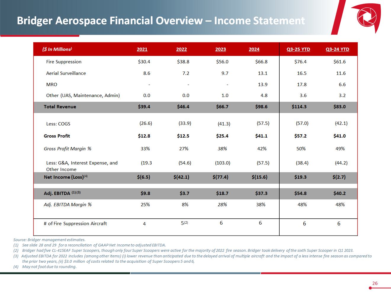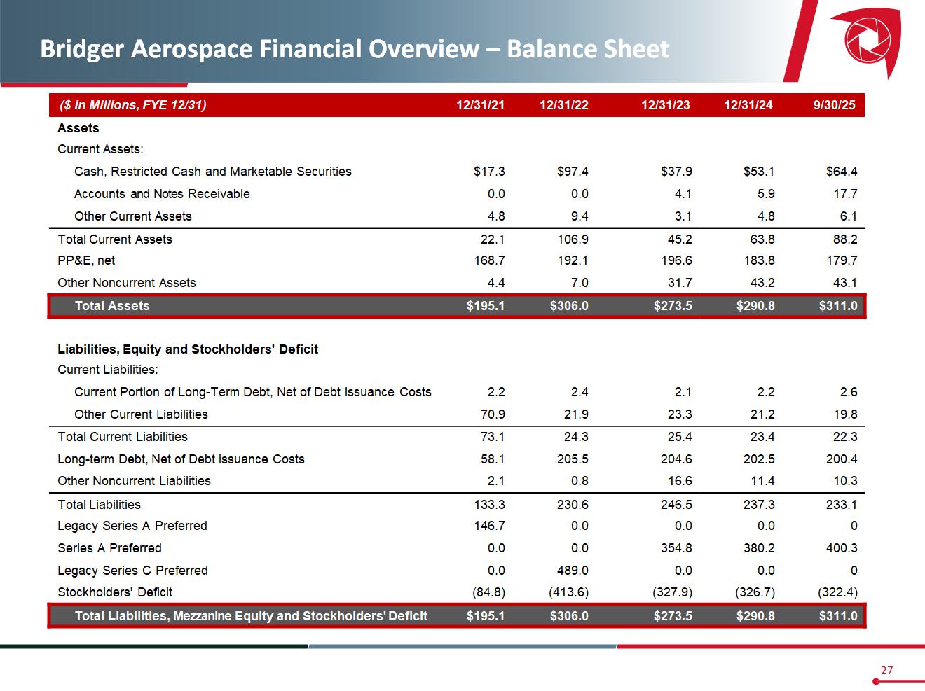 Bridger Aerospace Financial Overview – Balance Sheet 9/30/25 12/31/24 12/31/23 12/31/22 12/31/21 ($ in Millions , FYE 12/31) Assets Current Assets: $64.4 $53.1 $37.9 $97.4 $17.3 Cash, Restricted Cash a n d Marketable Securities 17.7 5.9 4.1 0.0 0.0 Accounts and Notes Receivable 6.1 4.8 3.1 9.4 4.8 Other Current Assets 88.2 63.8 45.2 106.9 22.1 Total Current Assets 179.7 183.8 196.6 192.1 168.7 PP&E , net 43.1 43.2 31.7 7.0 4.4 Other Noncurrent Assets $311.0 $290.8 $ 273.5 $306.0 $195.1 Total Assets Liabilities, Equity and Stockholders ' Deficit Current Liabilities: 2.6 2.2 2.1 2.4 2.2 Current Portion of Long - Term Debt, Net of Debt Issuance Costs 19.8 21.2 23.3 21.9 70.9 Other Current Liabilities 22.3 23.4 25.4 24.3 73.1 Total Current Liabilities 200.4 202.5 204.6 205.5 58.1 Long - term Debt, Net of Debt Issuance Costs 10.3 11.4 16.6 0.8 2.1 Other Noncurrent Liabilities 233.1 237.3 246.5 230.6 133.3 Total Liabilities 0 0.0 0.0 0.0 146.7 Legacy Series A Preferred 400.3 380.2 354.8 0.0 0.0 Series A Preferred 0 0.0 0.0 489.0 0.0 Legacy Series C Preferred (322.4) (326.7) ( 327.9 ) (41 3.6 ) (84.8) Stockholders ' Deficit $311.0 $290.8 $273.5 $306.0 $195.1 Total Liabilities, Mezzanine Equity and Stockholders ' Deficit 27