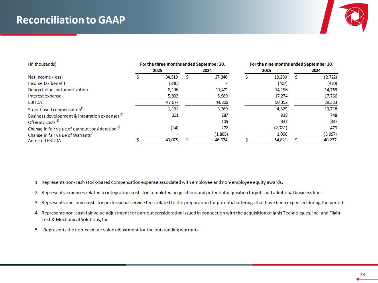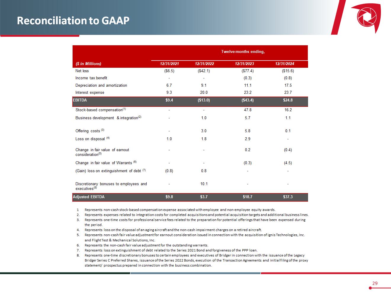 Reconciliation to GAAP 28 1 Represents non - cash stock - based compensation expense associated with employee and non - employee equity awards. 2 Represents expenses related to integration costs for completed acquisitions and potential acquisition targets and additional b usiness lines. 3 Represents one - time costs for professional service fees related to the preparation for potential offerings that have been expe nsed during the period. 4 Represents non - cash fair value adjustment for earnout consideration issued in connection with the acquisition of Ignis Technol ogies, Inc. and Flight Test & Mechanical Solutions, Inc. 5 Represents the non - cash fair value adjustment for the outstanding warrants. (In thousands) 2025 2024 2025 2024 Net income (loss) $ 34,519 $ 27,346 $ 19,289 $ (2,722) Income tax benefit (840) - (407) (470) Depreciation and amortization 8,196 11,471 14,196 14,759 Interest expense 5,802 5,989 17,274 17,766 EBITDA 47,677 44,806 50,352 29,333 Stock-based compensation (1) 1,101 3,369 4,829 13,718 Business development & integration expenses (2) 331 287 918 748 Offering costs (3) - 105 437 (44) Change in fair value of earnout consideration (4) (34) 272 (2,781) 479 Change in fair value of Warrants (5) - (1,865) 1,066 (3,997) Adjusted EBITDA $ 49,075 $ 46,974 $ 54,821 $ 40,237 For the three months ended September 30, For the nine months ended September 30,
