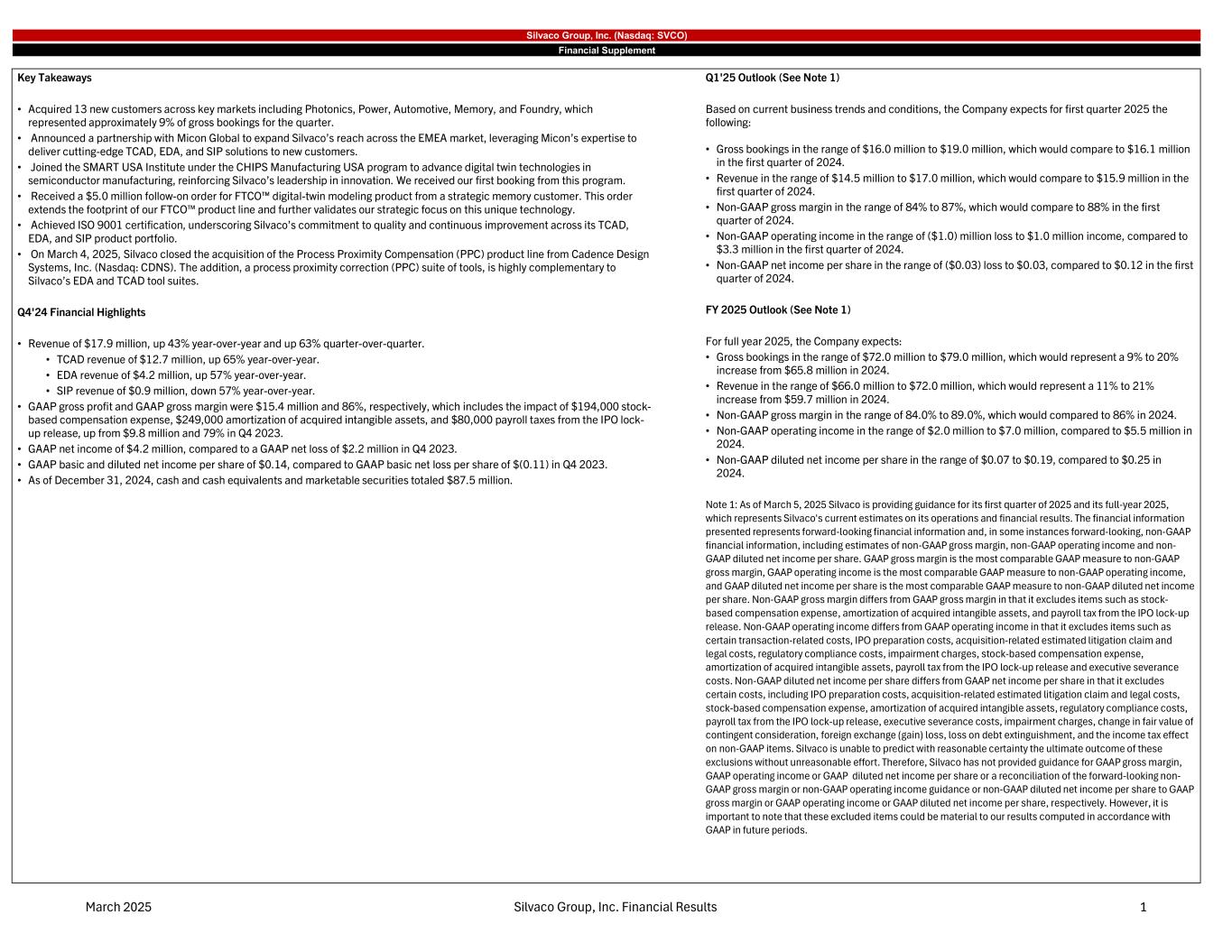 Silvaco Group, Inc. (Nasdaq: SVCO) Financial Supplement Key Takeaways • Acquired 13 new customers across key markets including Photonics, Power, Automotive, Memory, and Foundry, which represented approximately 9% of gross bookings for the quarter. • Announced a partnership with Micon Global to expand Silvaco’s reach across the EMEA market, leveraging Micon’s expertise to deliver cutting-edge TCAD, EDA, and SIP solutions to new customers. • Joined the SMART USA Institute under the CHIPS Manufacturing USA program to advance digital twin technologies in semiconductor manufacturing, reinforcing Silvaco’s leadership in innovation. We received our first booking from this program. • Received a $5.0 million follow-on order for FTCO digital-twin modeling product from a strategic memory customer. This order extends the footprint of our FTCO product line and further validates our strategic focus on this unique technology. • Achieved ISO 9001 certification, underscoring Silvaco’s commitment to quality and continuous improvement across its TCAD, EDA, and SIP product portfolio. • On March 4, 2025, Silvaco closed the acquisition of the Process Proximity Compensation (PPC) product line from Cadence Design Systems, Inc. (Nasdaq: CDNS). The addition, a process proximity correction (PPC) suite of tools, is highly complementary to Silvaco’s EDA and TCAD tool suites. Q4'24 Financial Highlights • Revenue of $17.9 million, up 43% year-over-year and up 63% quarter-over-quarter. • TCAD revenue of $12.7 million, up 65% year-over-year. • EDA revenue of $4.2 million, up 57% year-over-year. • SIP revenue of $0.9 million, down 57% year-over-year. • GAAP gross profit and GAAP gross margin were $15.4 million and 86%, respectively, which includes the impact of $194,000 stock- based compensation expense, $249,000 amortization of acquired intangible assets, and $80,000 payroll taxes from the IPO lock- up release, up from $9.8 million and 79% in Q4 2023. • GAAP net income of $4.2 million, compared to a GAAP net loss of $2.2 million in Q4 2023. • GAAP basic and diluted net income per share of $0.14, compared to GAAP basic net loss per share of $(0.11) in Q4 2023. • As of December 31, 2024, cash and cash equivalents and marketable securities totaled $87.5 million. Q1'25 Outlook (See Note 1) Based on current business trends and conditions, the Company expects for first quarter 2025 the following: • Gross bookings in the range of $16.0 million to $19.0 million, which would compare to $16.1 million in the first quarter of 2024. • Revenue in the range of $14.5 million to $17.0 million, which would compare to $15.9 million in the first quarter of 2024. • Non-GAAP gross margin in the range of 84% to 87%, which would compare to 88% in the first quarter of 2024. • Non-GAAP operating income in the range of ($1.0) million loss to $1.0 million income, compared to $3.3 million in the first quarter of 2024. • Non-GAAP net income per share in the range of ($0.03) loss to $0.03, compared to $0.12 in the first quarter of 2024. FY 2025 Outlook (See Note 1) For full year 2025, the Company expects: • Gross bookings in the range of $72.0 million to $79.0 million, which would represent a 9% to 20% increase from $65.8 million in 2024. • Revenue in the range of $66.0 million to $72.0 million, which would represent a 11% to 21% increase from $59.7 million in 2024. • Non-GAAP gross margin in the range of 84.0% to 89.0%, which would compared to 86% in 2024. • Non-GAAP operating income in the range of $2.0 million to $7.0 million, compared to $5.5 million in 2024. • Non-GAAP diluted net income per share in the range of $0.07 to $0.19, compared to $0.25 in 2024. Note 1: As of March 5, 2025 Silvaco is providing guidance for its first quarter of 2025 and its full-year 2025, which represents Silvaco's current estimates on its operations and financial results. The financial information presented represents forward-looking financial information and, in some instances forward-looking, non-GAAP financial information, including estimates of non-GAAP gross margin, non-GAAP operating income and non- GAAP diluted net income per share. GAAP gross margin is the most comparable GAAP measure to non-GAAP gross margin, GAAP operating income is the most comparable GAAP measure to non-GAAP operating income, and GAAP diluted net income per share is the most comparable GAAP measure to non-GAAP diluted net income per share. Non-GAAP gross margin differs from GAAP gross margin in that it excludes items such as stock- based compensation expense, amortization of acquired intangible assets, and payroll tax from the IPO lock-up release. Non-GAAP operating income differs from GAAP operating income in that it excludes items such as certain transaction-related costs, IPO preparation costs, acquisition-related estimated litigation claim and legal costs, regulatory compliance costs, impairment charges, stock-based compensation expense, amortization of acquired intangible assets, payroll tax from the IPO lock-up release and executive severance costs. Non-GAAP diluted net income per share differs from GAAP net income per share in that it excludes certain costs, including IPO preparation costs, acquisition-related estimated litigation claim and legal costs, stock-based compensation expense, amortization of acquired intangible assets, regulatory compliance costs, payroll tax from the IPO lock-up release, executive severance costs, impairment charges, change in fair value of contingent consideration, foreign exchange (gain) loss, loss on debt extinguishment, and the income tax effect on non-GAAP items. Silvaco is unable to predict with reasonable certainty the ultimate outcome of these exclusions without unreasonable effort. Therefore, Silvaco has not provided guidance for GAAP gross margin, GAAP operating income or GAAP diluted net income per share or a reconciliation of the forward-looking non- GAAP gross margin or non-GAAP opera