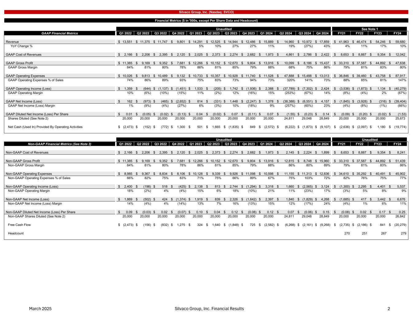 Silvaco Group, Inc. (Nasdaq: SVCO) Financial Metrics ($ in '000s, except Per Share Data and Headcount) Unaudited See Note 1 GAAP Financial Metrics Q1 2022 Q2 2022 Q3 2022 Q4 2022 Q1 2023 Q2 2023 Q3 2023 Q4 2023 Q1 2024 Q2 2024 Q3 2024 Q4 2024 FY21 FY22 FY23 FY24 Revenue 13,551$ 11,375$ 11,747$ 9,801$ 14,291$ 12,525$ 14,944$ 12,486$ 15,889$ 14,960$ 10,972$ 17,859$ 41,963$ 46,474$ 54,246$ 59,680$ YoY Change % 5% 10% 27% 27% 11% 19% (27%) 43% 4% 11% 17% 10% GAAP Cost of Revenues 2,166$ 2,206$ 2,395$ 2,120$ 2,025$ 2,373$ 2,274$ 2,682$ 1,973$ 4,861$ 2,786$ 2,422$ 8,653$ 8,887$ 9,354$ 12,042$ GAAP Gross Profit 11,385$ 9,169$ 9,352$ 7,681$ 12,266$ 10,152$ 12,670$ 9,804$ 13,916$ 10,099$ 8,186$ 15,437$ 33,310$ 37,587$ 44,892$ 47,638$ GAAP Gross Margin 84% 81% 80% 78% 86% 81% 85% 79% 88% 68% 75% 86% 79% 81% 83% 80% GAAP Operating Expenses 10,026$ 9,813$ 10,489$ 9,132$ 10,733$ 10,357$ 10,928$ 11,740$ 11,528$ 47,888$ 15,488$ 13,013$ 36,846$ 39,460$ 43,758$ 87,917$ GAAP Operating Expenses % of Sales 74% 86% 89% 93% 75% 83% 73% 94% 73% 320% 141% 73% 88% 85% 81% 147% GAAP Operating Income (Loss) 1,359$ (644)$ (1,137)$ (1,451)$ 1,533$ (205)$ 1,742$ (1,936)$ 2,388$ (37,789)$ (7,302)$ 2,424$ (3,536)$ (1,873)$ 1,134$ (40,279)$ GAAP Operating Margin 10% (6%) (10%) (15%) 11% (2%) 12% (16%) 15% (253%) (67%) 14% (8%) (4%) 2% (67%) GAAP Net Income (Loss) 162$ (973)$ (465)$ (2,652)$ 814$ (331)$ 1,448$ (2,247)$ 1,378$ (38,388)$ (6,551)$ 4,157$ (1,845)$ (3,928)$ (316)$ (39,404)$ GAAP Net Income (Loss) Margin 1% (9%) (4%) (27%) 6% (3%) 10% (18%) 9% (257%) (60%) 23% (4%) (8%) (1%) (66%) GAAP Diluted Net Income (Loss) Per Share 0.01$ (0.05)$ (0.02)$ (0.13)$ 0.04$ (0.02)$ 0.07$ (0.11)$ 0.07$ (1.55)$ (0.23)$ 0.14$ (0.09)$ (0.20)$ (0.02)$ (1.53)$ Shares Diluted (See Note 2) 20,000 20,000 20,000 20,000 20,000 20,000 20,000 20,000 20,000 24,811 29,048 28,849 20,000 20,000 20,000 25,673 Net Cash (Used In) Provided By Operating Activities (2,473)$ (152)$ (772)$ 1,300$ 501$ 1,665$ (1,835)$ 849$ (2,572)$ (6,222)$ (1,873)$ (9,107)$ (2,636)$ (2,097)$ 1,180$ (19,774)$ Unaudited Unaudited Non-GAAP Financial Metrics (See Note 3) Q1 2022 Q2 2022 Q3 2022 Q4 2022 Q1 2023 Q2 2023 Q3 2023 Q4 2023 Q1 2024 Q2 2024 Q3 2024 Q4 2024 FY21 FY22 FY23 FY24 Non-GAAP Cost of Revenues 2,166$ 2,206$ 2,395$ 2,120$ 2,025$ 2,373$ 2,274$ 2,682$ 1,973$ 2,145$ 2,224$ 1,899$ 8,653$ 8,887$ 9,354$ 8,241$ Non-GAAP Gross Profit 11,385$ 9,169$ 9,352$ 7,681$ 12,266$ 10,152$ 12,670$ 9,804$ 13,916$ 12,815$ 8,748$ 15,960$ 33,310$ 37,587$ 44,892$ 51,439$ Non-GAAP Gross Margin 84% 81% 80% 78% 86% 81% 85% 79% 88% 86% 80% 89% 79% 81% 83% 86% Non-GAAP Operating Expenses 8,985$ 9,367$ 8,834$ 8,106$ 10,128$ 9,339$ 9,926$ 11,098$ 10,598$ 11,155$ 11,313$ 12,836$ 34,610$ 35,292$ 40,491$ 45,902$ Non-GAAP Operating Expenses % of Sales 66% 82% 75% 83% 71% 75% 66% 89% 67% 75% 103% 72% 82% 76% 75% 77% Non-GAAP Operating Income (Loss) 2,400$ (198)$ 518$ (425)$ 2,138$ 813$ 2,744$ (1,294)$ 3,318$ 1,660$ (2,565)$ 3,124$ (1,300)$ 2,295$ 4,401$ 5,537$ Non-GAAP Operating Margin 18% (2%) 4% (4%) 15% 6% 18% (10%) 21% 11% (23%) 17% (3%) 5% 8% 9% Non-GAAP Net Income (Loss) 1,869$ (502)$ 424$ (1,374)$ 1,919$ 839$ 2,326$ (1,642)$ 2,397$ 1,840$ (1,829)$ 4,268$ (1,685)$ 417$ 3,442$ 6,676$ Non-GAAP Net Income (Loss) Margin 14% (4%) 4% (14%) 13% 7% 16% (13%) 15% 12% (17%) 24% (4%) 1% 6% 11% Non-GAAP Diluted Net Income (Loss) Per Share 0.09$ (0.03)$ 0.02$ (0.07)$ 0.10$ 0.04$ 0.12$ (0.08)$ 0.12$ 0.07$ (0.06)$ 0.15$ (0.08)$ 0.02$ 0.17$ 0.25$ Non-GAAP Shares Diluted (See Note 2) 20,000 20,000 20,000 20,000 20,000 20,000 20,000 20,000 20,000 24,811 29,048 28,849 20,000 20,000 20,000 26,842 Free Cash Flow (2,473)$ (156)$ (832)$ 1,275$ 324$ 1,640$ (1,848)$ 725$ (2,582)$ (6,268)$ (2,161)$ (9,268)$ (2,735)$ (2,186)$ 841$ (20,279)$ Headcount 270 251 267 279 March 2025 Silvaco Group, Inc. Financial Results 2
