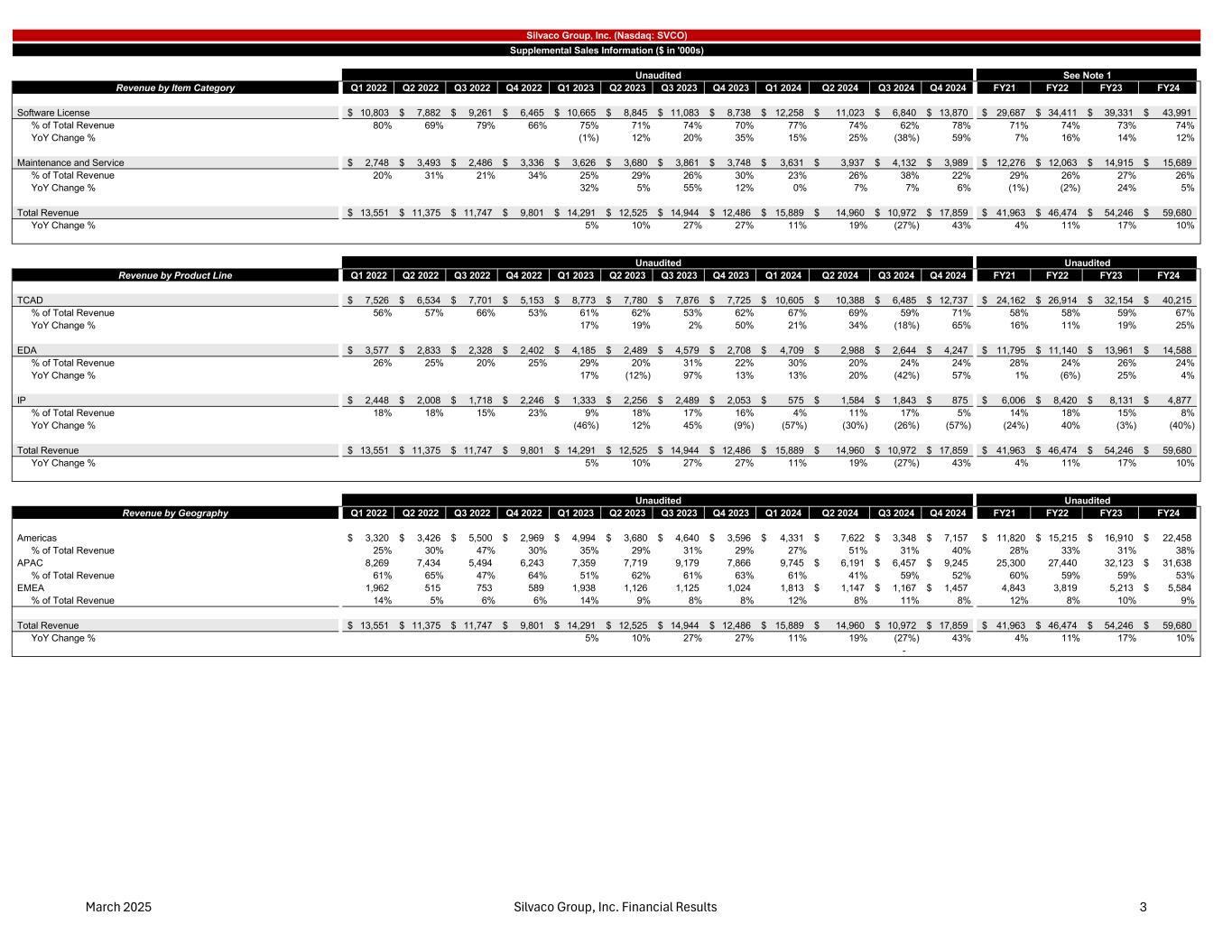 Silvaco Group, Inc. (Nasdaq: SVCO) Supplemental Sales Information ($ in '000s) Unaudited See Note 1 Revenue by Item Category Q1 2022 Q2 2022 Q3 2022 Q4 2022 Q1 2023 Q2 2023 Q3 2023 Q4 2023 Q1 2024 Q2 2024 Q3 2024 Q4 2024 FY21 FY22 FY23 FY24 Software License 10,803$ 7,882$ 9,261$ 6,465$ 10,665$ 8,845$ 11,083$ 8,738$ 12,258$ 11,023$ 6,840$ 13,870$ 29,687$ 34,411$ 39,331$ 43,991$ % of Total Revenue 80% 69% 79% 66% 75% 71% 74% 70% 77% 74% 62% 78% 71% 74% 73% 74% YoY Change % (1%) 12% 20% 35% 15% 25% (38%) 59% 7% 16% 14% 12% Maintenance and Service 2,748$ 3,493$ 2,486$ 3,336$ 3,626$ 3,680$ 3,861$ 3,748$ 3,631$ 3,937$ 4,132$ 3,989$ 12,276$ 12,063$ 14,915$ 15,689$ % of Total Revenue 20% 31% 21% 34% 25% 29% 26% 30% 23% 26% 38% 22% 29% 26% 27% 26% YoY Change % 32% 5% 55% 12% 0% 7% 7% 6% (1%) (2%) 24% 5% Total Revenue 13,551$ 11,375$ 11,747$ 9,801$ 14,291$ 12,525$ 14,944$ 12,486$ 15,889$ 14,960$ 10,972$ 17,859$ 41,963$ 46,474$ 54,246$ 59,680$ YoY Change % 5% 10% 27% 27% 11% 19% (27%) 43% 4% 11% 17% 10% Unaudited Unaudited Revenue by Product Line Q1 2022 Q2 2022 Q3 2022 Q4 2022 Q1 2023 Q2 2023 Q3 2023 Q4 2023 Q1 2024 Q2 2024 Q3 2024 Q4 2024 FY21 FY22 FY23 FY24 TCAD 7,526$ 6,534$ 7,701$ 5,153$ 8,773$ 7,780$ 7,876$ 7,725$ 10,605$ 10,388$ 6,485$ 12,737$ 24,162$ 26,914$ 32,154$ 40,215$ % of Total Revenue 56% 57% 66% 53% 61% 62% 53% 62% 67% 69% 59% 71% 58% 58% 59% 67% YoY Change % 17% 19% 2% 50% 21% 34% (18%) 65% 16% 11% 19% 25% EDA 3,577$ 2,833$ 2,328$ 2,402$ 4,185$ 2,489$ 4,579$ 2,708$ 4,709$ 2,988$ 2,644$ 4,247$ 11,795$ 11,140$ 13,961$ 14,588$ % of Total Revenue 26% 25% 20% 25% 29% 20% 31% 22% 30% 20% 24% 24% 28% 24% 26% 24% YoY Change % 17% (12%) 97% 13% 13% 20% (42%) 57% 1% (6%) 25% 4% IP 2,448$ 2,008$ 1,718$ 2,246$ 1,333$ 2,256$ 2,489$ 2,053$ 575$ 1,584$ 1,843$ 875$ 6,006$ 8,420$ 8,131$ 4,877$ % of Total Revenue 18% 18% 15% 23% 9% 18% 17% 16% 4% 11% 17% 5% 14% 18% 15% 8% YoY Change % (46%) 12% 45% (9%) (57%) (30%) (26%) (57%) (24%) 40% (3%) (40%) Total Revenue 13,551$ 11,375$ 11,747$ 9,801$ 14,291$ 12,525$ 14,944$ 12,486$ 15,889$ 14,960$ 10,972$ 17,859$ 41,963$ 46,474$ 54,246$ 59,680$ YoY Change % 5% 10% 27% 27% 11% 19% (27%) 43% 4% 11% 17% 10% Unaudited Unaudited Revenue by Geography Q1 2022 Q2 2022 Q3 2022 Q4 2022 Q1 2023 Q2 2023 Q3 2023 Q4 2023 Q1 2024 Q2 2024 Q3 2024 Q4 2024 FY21 FY22 FY23 FY24 Americas 3,320$ 3,426$ 5,500$ 2,969$ 4,994$ 3,680$ 4,640$ 3,596$ 4,331$ 7,622$ 3,348$ 7,157$ 11,820$ 15,215$ 16,910$ 22,458$ % of Total Revenue 25% 30% 47% 30% 35% 29% 31% 29% 27% 51% 31% 40% 28% 33% 31% 38% APAC 8,269 7,434 5,494 6,243 7,359 7,719 9,179 7,866 9,745 6,191$ 6,457$ 9,245$ 25,300 27,440 32,123 31,638$ % of Total Revenue 61% 65% 47% 64% 51% 62% 61% 63% 61% 41% 59% 52% 60% 59% 59% 53% EMEA 1,962 515 753 589 1,938 1,126 1,125 1,024 1,813 1,147$ 1,167$ 1,457$ 4,843 3,819 5,213 5,584$ % of Total Revenue 14% 5% 6% 6% 14% 9% 8% 8% 12% 8% 11% 8% 12% 8% 10% 9% Total Revenue 13,551$ 11,375$ 11,747$ 9,801$ 14,291$ 12,525$ 14,944$ 12,486$ 15,889$ 14,960$ 10,972$ 17,859$ 41,963$ 46,474$ 54,246$ 59,680$ YoY Change % 5% 10% 27% 27% 11% 19% (27%) 43% 4% 11% 17% 10% - March 2025 Silvaco Group, Inc. Financial Results 3