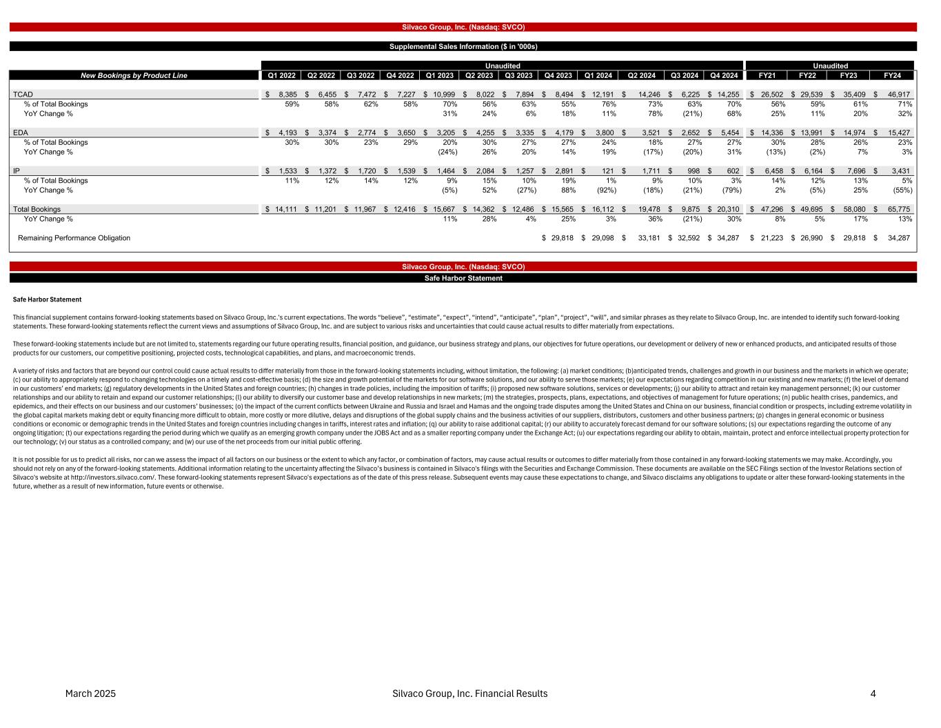 Silvaco Group, Inc. (Nasdaq: SVCO) Supplemental Sales Information ($ in '000s) Unaudited Unaudited New Bookings by Product Line Q1 2022 Q2 2022 Q3 2022 Q4 2022 Q1 2023 Q2 2023 Q3 2023 Q4 2023 Q1 2024 Q2 2024 Q3 2024 Q4 2024 FY21 FY22 FY23 FY24 TCAD 8,385$ 6,455$ 7,472$ 7,227$ 10,999$ 8,022$ 7,894$ 8,494$ 12,191$ 14,246$ 6,225$ 14,255$ 26,502$ 29,539$ 35,409$ 46,917$ % of Total Bookings 59% 58% 62% 58% 70% 56% 63% 55% 76% 73% 63% 70% 56% 59% 61% 71% YoY Change % 31% 24% 6% 18% 11% 78% (21%) 68% 25% 11% 20% 32% EDA 4,193$ 3,374$ 2,774$ 3,650$ 3,205$ 4,255$ 3,335$ 4,179$ 3,800$ 3,521$ 2,652$ 5,454$ 14,336$ 13,991$ 14,974$ 15,427$ % of Total Bookings 30% 30% 23% 29% 20% 30% 27% 27% 24% 18% 27% 27% 30% 28% 26% 23% YoY Change % (24%) 26% 20% 14% 19% (17%) (20%) 31% (13%) (2%) 7% 3% IP 1,533$ 1,372$ 1,720$ 1,539$ 1,464$ 2,084$ 1,257$ 2,891$ 121$ 1,711$ 998$ 602$ 6,458$ 6,164$ 7,696$ 3,431$ % of Total Bookings 11% 12% 14% 12% 9% 15% 10% 19% 1% 9% 10% 3% 14% 12% 13% 5% YoY Change % (5%) 52% (27%) 88% (92%) (18%) (21%) (79%) 2% (5%) 25% (55%) Total Bookings 14,111$ 11,201$ 11,967$ 12,416$ 15,667$ 14,362$ 12,486$ 15,565$ 16,112$ 19,478$ 9,875$ 20,310$ 47,296$ 49,695$ 58,080$ 65,775$ YoY Change % 11% 28% 4% 25% 3% 36% (21%) 30% 8% 5% 17% 13% Remaining Performance Obligation 29,818$ 29,098$ 33,181$ 32,592$ 34,287$ 21,223$ 26,990$ 29,818$ 34,287$ Silvaco Group, Inc. (Nasdaq: SVCO) Safe Harbor Statement Safe Harbor Statement This financial supplement contains forward-looking statements based on Silvaco Group, Inc.'s current expectations. The words “believe”, “estimate”, “expect”, “intend”, “anticipate”, “plan”, “project”, “will”, and similar phrases as they relate to Silvaco Group, Inc. are intended to identify such forward-looking statements. These forward-looking statements reflect the current views and assumptions of Silvaco Group, Inc. and are subject to various risks and uncertainties that could cause actual results to differ materially from expectations. These forward-looking statements include but are not limited to, statements regarding our future operating results, financial position, and guidance, our business strategy and plans, our objectives for future operations, our development or delivery of new or enhanced products, and anticipated results of those products for our customers, our competitive positioning, projected costs, technological capabilities, and plans, and macroeconomic trends. A variety of risks and factors that are beyond our control could cause actual results to differ materially from those in the forward-looking statements including, without limitation, the following: (a) market conditions; (b)anticipated trends, challenges and growth in our business and the markets in which we operate; (c) our ability to appropriately respond to changing technologies on a timely and cost-effective basis; (d) the size and growth potential of the markets for our software solutions, and our ability to serve those markets; (e) our expectations regarding competition in our existing and new markets; (f) the level of demand in our customers’ end markets; (g) regulatory developments in the United States and foreign countries; (h) changes in trade policies, including the imposition of tariffs; (i) proposed new software solutions, services or developments; (j) our ability to attract and retain key management personnel; (k) our customer relationships and our ability to retain and expand our customer relationships; (l) our ability to diversify our customer base and develop relationships in new markets; (m) the strategies, prospects, plans, expectations, and objectives of management for future operations; (n) public health crises, pandemics, and epidemics, and their effects on our business and our customers’ businesses; (o) the impact of the current conflicts between Ukraine and Russia and Israel and Hamas and the ongoing trade disputes among the United States and China on our business, financial condition or prospects, including extreme volatility in the global capital markets making debt or equity financing more difficult to obtain, more costly or more dilutive, delays and disruptions of the global supply chains and the business activities of our suppliers, distributors, customers and other business partners; (p) changes in general economic or business conditions or economic or demographic trends in the United States and foreign countries including changes in tariffs, interest rates and inflation; (q) our ability to raise additional capital; (r) our ability to accurately forecast demand for our software solutions; (s) our expectations regarding the outcome of any ongoing litigation; (t) our expectations regarding the period during which we qualify as an emerging growth company under the JOBS Act and as a smaller reporting company under the Exchange Act; (u) our expectations regarding our ability to obtain, maintain, protect and enforce intellectual property protection for our technology; (v) our status as a controlled company; and (w) our use of the net proceeds from our initial public offering. It is not possible for us to predict all risks, nor can we assess the impact of all factors on our business or the extent to which any factor, or combination of factors, may cause actual results or outcomes to differ materially from those contained in any forward-looking statements we may make. Accordingly, you should not rely on any of the forward-looking statements. Additional information relating to the uncertainty affecting the Silvaco’s business is contained in Silvaco's filings with the Securities and Exchange Commission. These documents are available on the SEC Filings section of the Investor Relations section of Silvaco's website at http://investors.silvaco.com/. These forward-looking statements represent Silvaco's expectations as of the date of this press release. Subsequent events may cause these expectations to change, and Silvaco disclaims any obligations to up