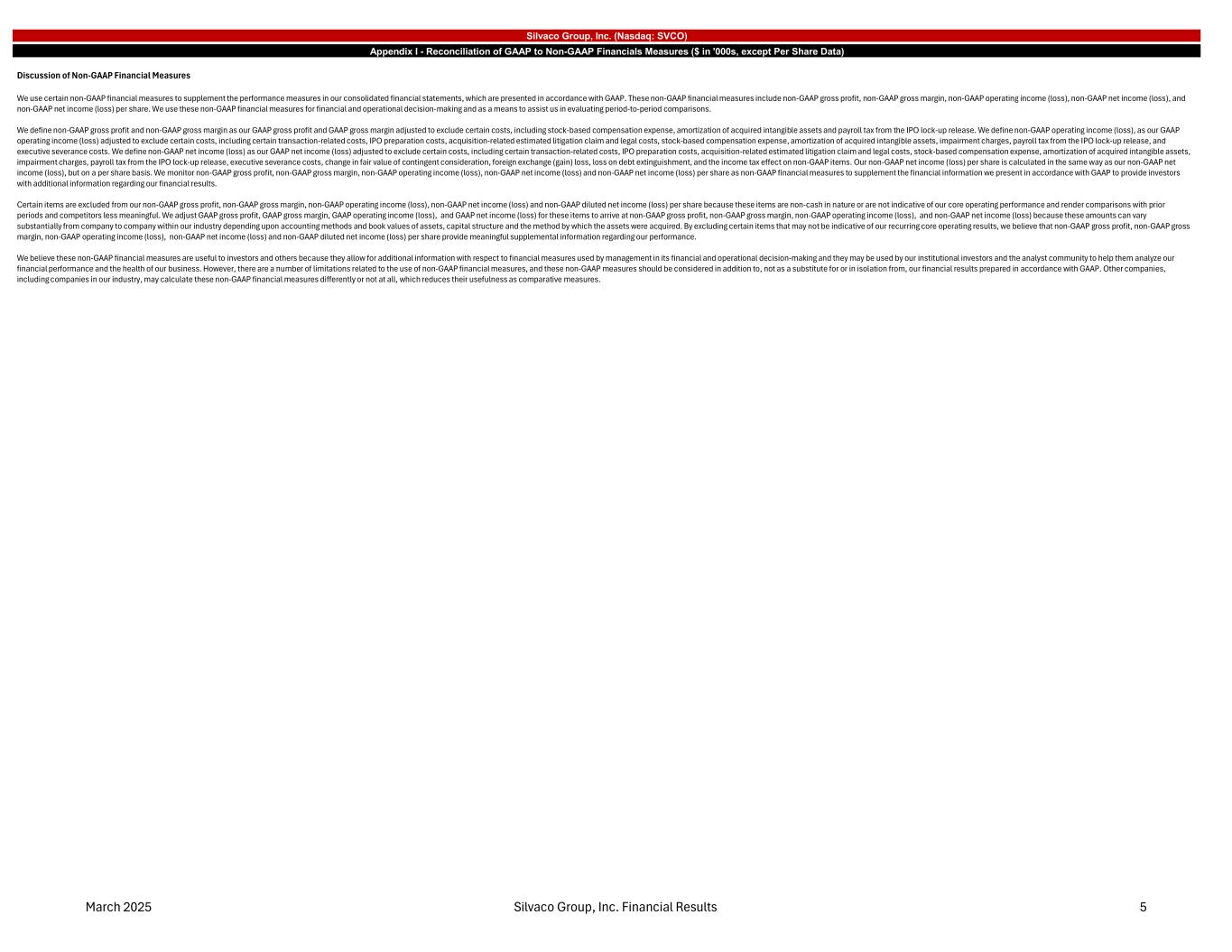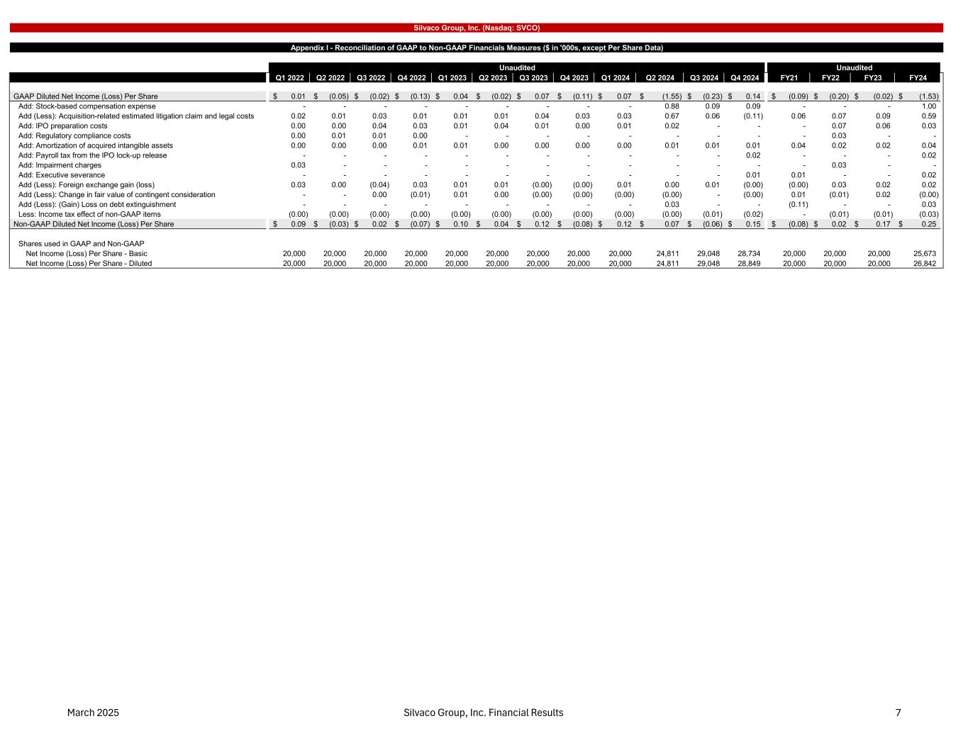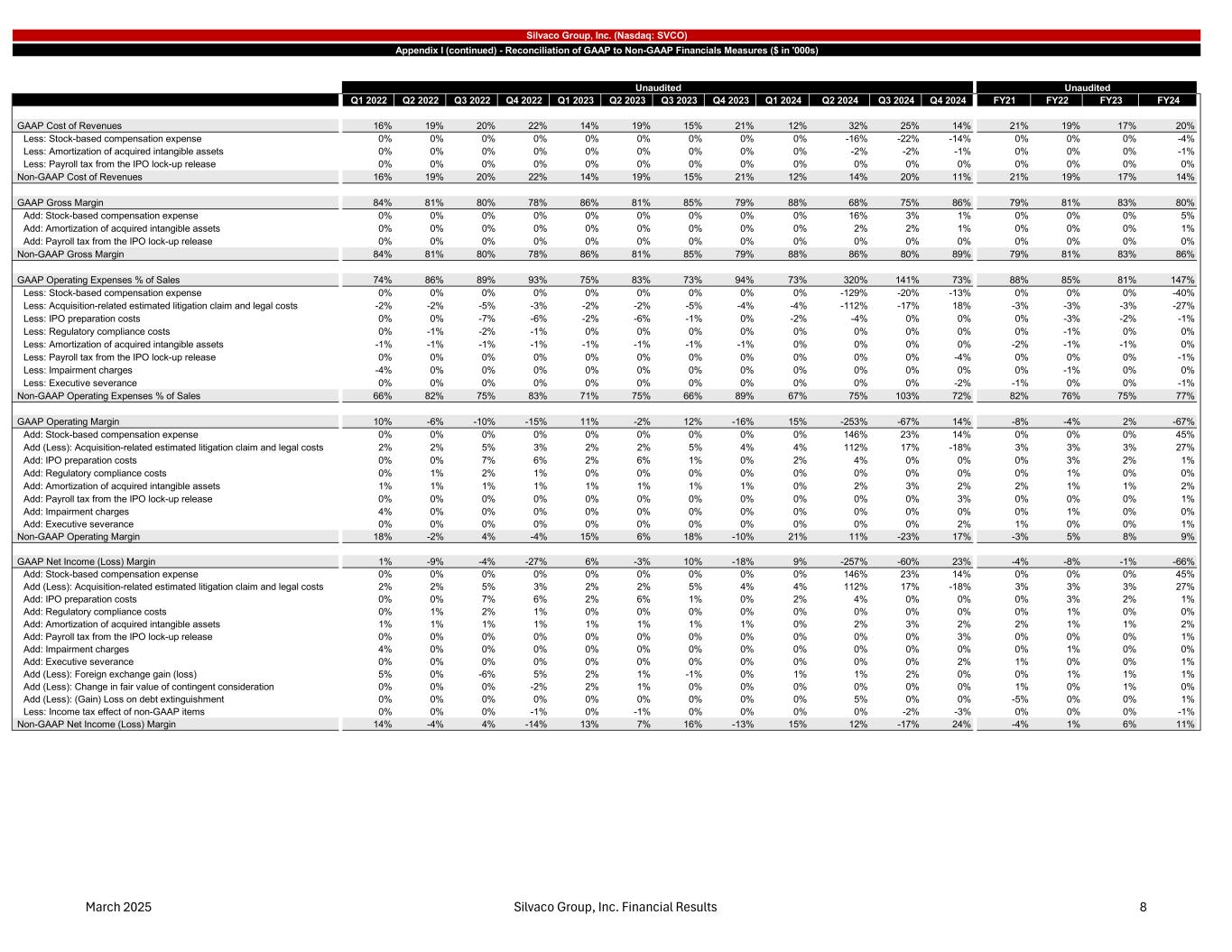 Silvaco Group, Inc. (Nasdaq: SVCO) Appendix I - Reconciliation of GAAP to Non-GAAP Financials Measures ($ in '000s, except Per Share Data) Unaudited Unaudited Q1 2022 Q2 2022 Q3 2022 Q4 2022 Q1 2023 Q2 2023 Q3 2023 Q4 2023 Q1 2024 Q2 2024 Q3 2024 Q4 2024 FY21 FY22 FY23 FY24 GAAP Diluted Net Income (Loss) Per Share 0.01$ (0.05)$ (0.02)$ (0.13)$ 0.04$ (0.02)$ 0.07$ (0.11)$ 0.07$ (1.55)$ (0.23)$ 0.14$ (0.09)$ (0.20)$ (0.02)$ (1.53)$ Add: Stock-based compensation expense - - - - - - - - - 0.88 0.09 0.09 - - - 1.00 Add (Less): Acquisition-related estimated litigation claim and legal costs 0.02 0.01 0.03 0.01 0.01 0.01 0.04 0.03 0.03 0.67 0.06 (0.11) 0.06 0.07 0.09 0.59 Add: IPO preparation costs 0.00 0.00 0.04 0.03 0.01 0.04 0.01 0.00 0.01 0.02 - - - 0.07 0.06 0.03 Add: Regulatory compliance costs 0.00 0.01 0.01 0.00 - - - - - - - - - 0.03 - - Add: Amortization of acquired intangible assets 0.00 0.00 0.00 0.01 0.01 0.00 0.00 0.00 0.00 0.01 0.01 0.01 0.04 0.02 0.02 0.04 Add: Payroll tax from the IPO lock-up release - - - - - - - - - - - 0.02 - - - 0.02 Add: Impairment charges 0.03 - - - - - - - - - - - - 0.03 - - Add: Executive severance - - - - - - - - - - - 0.01 0.01 - - 0.02 Add (Less): Foreign exchange gain (loss) 0.03 0.00 (0.04) 0.03 0.01 0.01 (0.00) (0.00) 0.01 0.00 0.01 (0.00) (0.00) 0.03 0.02 0.02 Add (Less): Change in fair value of contingent consideration - - 0.00 (0.01) 0.01 0.00 (0.00) (0.00) (0.00) (0.00) - (0.00) 0.01 (0.01) 0.02 (0.00) Add (Less): (Gain) Loss on debt extinguishment - - - - - - - - - 0.03 - - (0.11) - - 0.03 Less: Income tax effect of non-GAAP items (0.00) (0.00) (0.00) (0.00) (0.00) (0.00) (0.00) (0.00) (0.00) (0.00) (0.01) (0.02) - (0.01) (0.01) (0.03) Non-GAAP Diluted Net Income (Loss) Per Share 0.09$ (0.03)$ 0.02$ (0.07)$ 0.10$ 0.04$ 0.12$ (0.08)$ 0.12$ 0.07$ (0.06)$ 0.15$ (0.08)$ 0.02$ 0.17$ 0.25$ Shares used in GAAP and Non-GAAP Net Income (Loss) Per Share - Basic 20,000 20,000 20,000 20,000 20,000 20,000 20,000 20,000 20,000 24,811 29,048 28,734 20,000 20,000 20,000 25,673 Net Income (Loss) Per Share - Diluted 20,000 20,000 20,000 20,000 20,000 20,000 20,000 20,000 20,000 24,811 29,048 28,849 20,000 20,000 20,000 26,842 March 2025 Silvaco Group, Inc. Financial Results 7
