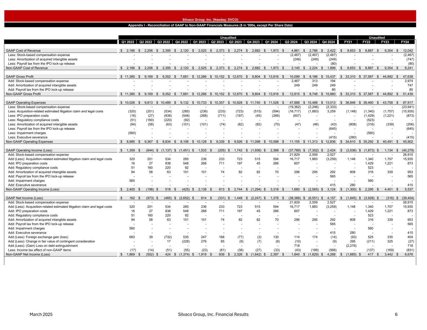 Silvaco Group, Inc. (Nasdaq: SVCO) Appendix I - Reconciliation of GAAP to Non-GAAP Financials Measures ($ in '000s, except Per Share Data) Unaudited Unaudited Q1 2022 Q2 2022 Q3 2022 Q4 2022 Q1 2023 Q2 2023 Q3 2023 Q4 2023 Q1 2024 Q2 2024 Q3 2024 Q4 2024 FY21 FY22 FY23 FY24 GAAP Cost of Revenue 2,166$ 2,206$ 2,395$ 2,120$ 2,025$ 2,373$ 2,274$ 2,682$ 1,973$ 4,861$ 2,786$ 2,422$ 8,653$ 8,887$ 9,354$ 12,042$ Less: Stock-based compensation expense - - - - - - - - - (2,467) (2,467) (2,467) - - - (2,467) Less: Amortization of acquired intangible assets - - - - - - - - - (249) (249) (249) - - - (747) Less: Payroll tax from the IPO lock-up release - - - - - - - - - - - (80) - - - (80) Non-GAAP Cost of Revenue 2,166$ 2,206$ 2,395$ 2,120$ 2,025$ 2,373$ 2,274$ 2,682$ 1,973$ 2,145$ 2,224$ 1,899$ 8,653$ 8,887$ 9,354$ 8,241$ GAAP Gross Profit 11,385$ 9,169$ 9,352$ 7,681$ 12,266$ 10,152$ 12,670$ 9,804$ 13,916$ 10,099$ 8,186$ 15,437$ 33,310$ 37,587$ 44,892$ 47,638$ Add: Stock-based compensation expense - - - - - - - - - 2,467 313 194 - - - 2,974 Add: Amortization of acquired intangible assets - - - - - - - - - 249 249 249 - - - 747 Add: Payroll tax from the IPO lock-up release - - - - - - - - - - - 80 - - - 80 Non-GAAP Gross Profit 11,385$ 9,169$ 9,352$ 7,681$ 12,266$ 10,152$ 12,670$ 9,804$ 13,916$ 12,815$ 8,748$ 15,960$ 33,310$ 37,587$ 44,892$ 51,439$ GAAP Operating Expenses 10,026$ 9,813$ 10,489$ 9,132$ 10,733$ 10,357$ 10,928$ 11,740$ 11,528$ 47,888$ 15,488$ 13,013$ 36,846$ 39,460$ 43,758$ 87,917$ Less: Stock-based compensation expense - - - - - - - - - (19,362) (2,246) (2,333) - - - (23,941) Less: Acquisition-related estimated litigation claim and legal costs (320) (201) (534) (285) (236) (233) (723) (515) (594) (16,717) (1,883) 3,259 (1,148) (1,340) (1,707) (15,935) Less: IPO preparation costs (16) (27) (838) (548) (268) (711) (197) (45) (266) (607) - - - (1,429) (1,221) (873) Less: Regulatory compliance costs (51) (160) (220) (92) - - - - - - - - - (523) - - Less: Amortization of acquired intangible assets (94) (58) (63) (101) (101) (74) (82) (82) (70) (47) (46) (43) (808) (316) (339) (206) Less: Payroll tax from the IPO lock-up release - - - - - - - - - - - (645) - - - (645) Less: Impairment charges (560) - - - - - - - - - - - - (560) - - Less: Executive severance - - - - - - - - - - - (415) (280) - - (415) Non-GAAP Operating Expenses 8,985$ 9,367$ 8,834$ 8,106$ 10,128$ 9,339$ 9,926$ 11,098$ 10,598$ 11,155$ 11,313$ 12,836$ 34,610$ 35,292$ 40,491$ 45,902$ GAAP Operating Income (Loss) 1,359$ (644)$ (1,137)$ (1,451)$ 1,533$ (205)$ 1,742$ (1,936)$ 2,388$ (37,789)$ (7,302)$ 2,424$ (3,536)$ (1,873)$ 1,134$ (40,279)$ Add: Stock-based compensation expense - - - - - - - - - 21,829 2,559 2,527 - - - 26,915 Add (Less): Acquisition-related estimated litigation claim and legal costs 320 201 534 285 236 233 723 515 594 16,717 1,883 (3,259) 1,148 1,340 1,707 15,935 Add: IPO preparation costs 16 27 838 548 268 711 197 45 266 607 - - - 1,429 1,221 873 Add: Regulatory compliance costs 51 160 220 92 - - - - - - - - - 523 - - Add: Amortization of acquired intangible assets 94 58 63 101 101 74 82 82 70 296 295 292 808 316 339 953 Add: Payroll tax from the IPO lock-up release - - - - - - - - - - - 565 - - - 565 Add: Impairment charges 560 - - - - - - - - - - - - 560 - - Add: Executive severance - - - - - - - - - - - 415 280 - - 415 Non-GAAP Operating Income (Loss) 2,400$ (198)$ 518$ (425)$ 2,138$ 813$ 2,744$ (1,294)$ 3,318$ 1,660$ (2,565)$ 3,124$ (1,300)$ 2,295$ 4,401$ 5,537$ GAAP Net Income (Loss) 162$ (973)$ (465)$ (2,652)$ 814$ (331)$ 1,448$ (2,247)$ 1,378$ (38,388)$ (6,551)$ 4,157$ (1,845)$ (3,928)$ (316)$ (39,404)$ Add: Stock-based compensation expense - - - - - - - - - 21,829 2,559 2,527 - - - 26,915 Add (Less): Acquisition-related estimated litigation claim and legal costs 320 201 534 285 236 233 723 515 594 16,717 1,883 (3,259) 1,148 1,340 1,707 15,935 Add: IPO preparation costs 16 27 838 548 268 711 197 45 266 607 - - - 1,429 1,221 873 Add: Regulatory compliance costs 51 160 220 92 - - - - - - - - - 523 - - Add: Amortization of acquired intangible assets 94 58 63 101 101 74 82 82 70 296 295 292 808 316 339 953 Add: Payroll tax from the IPO lock-up release - - - - - - - - - - - 565 - - - 565 Add: Impairment charges 560 - - - - - - - - - - - - 560 - - Add: Executive severance - - - - - - - - - - - 415 280 - - 415 Add (Less): Foreign exchange gain (loss) 683 39 (732) 535 247 168 (77) (3) 130 114 174 (14) (93) 525 335 404 Add (Less): Change in fair value of contingent consideration - - 17 (228) 276 65 (9) (7) (8) (10) - (9) 295 (211) 325 (27) Add (Less): (Gain) Loss on debt extinguishment - - - - - - - - - 718 - - (2,278) - - 718 Less: Income tax effect of non-GAAP items (17) (14) (51) (55) (23) (81) (38) (27) (33) (43) (189) (566) - (137) (169) (831) Non-GAAP Net Income (Loss) 1,869$ (502)$ 424$ (1,374)$ 1,919$ 839$ 2,326$ (1,642)$ 2,397$ 1,840$ (1,829)$ 4,268$ (1,685)$ 417$ 3,442$ 6,676$ March 2025 Silvaco Group, Inc. Financial Results 6