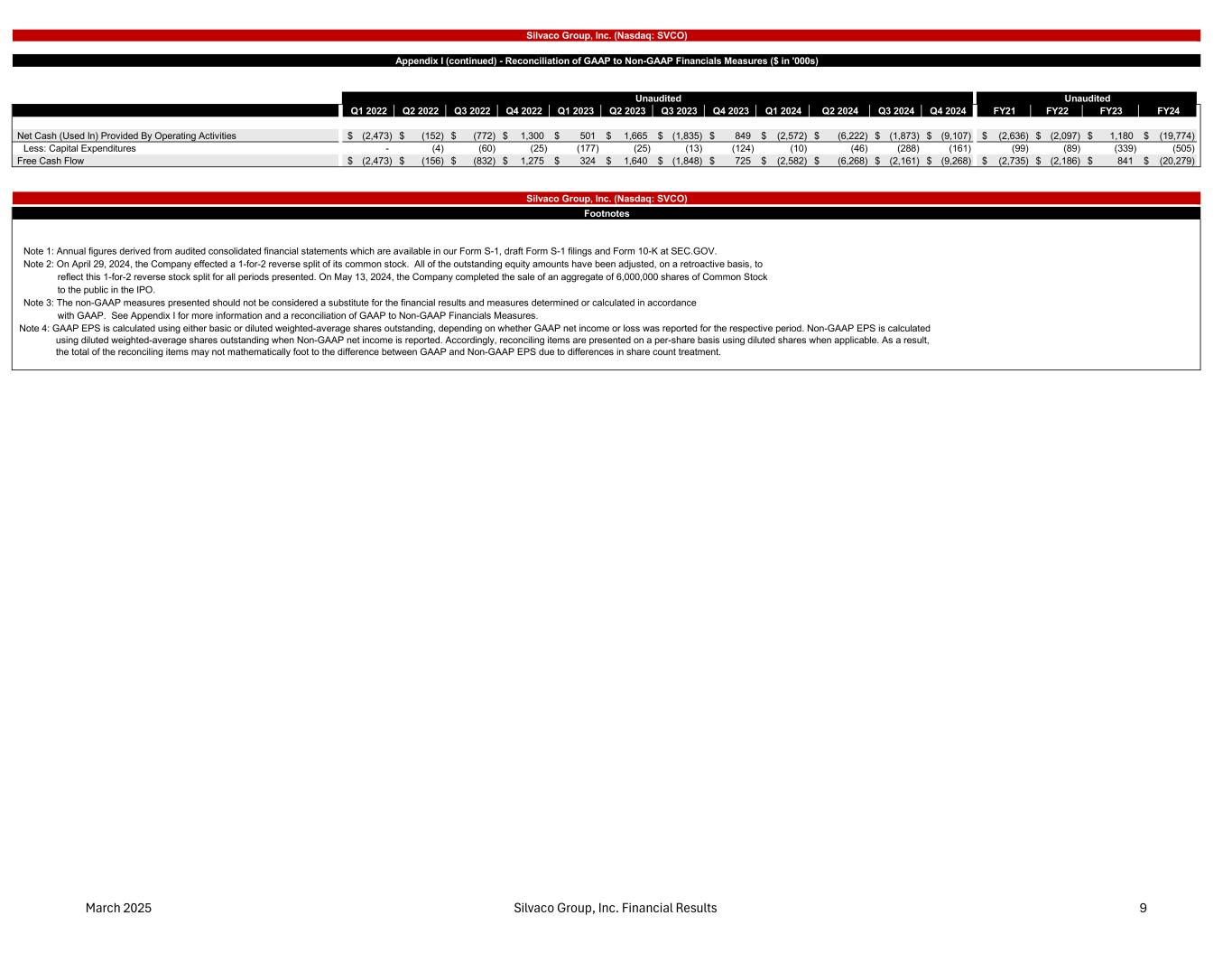 Silvaco Group, Inc. (Nasdaq: SVCO) Appendix I (continued) - Reconciliation of GAAP to Non-GAAP Financials Measures ($ in '000s) Unaudited Unaudited Q1 2022 Q2 2022 Q3 2022 Q4 2022 Q1 2023 Q2 2023 Q3 2023 Q4 2023 Q1 2024 Q2 2024 Q3 2024 Q4 2024 FY21 FY22 FY23 FY24 Net Cash (Used In) Provided By Operating Activities (2,473)$ (152)$ (772)$ 1,300$ 501$ 1,665$ (1,835)$ 849$ (2,572)$ (6,222)$ (1,873)$ (9,107)$ (2,636)$ (2,097)$ 1,180$ (19,774)$ Less: Capital Expenditures - (4) (60) (25) (177) (25) (13) (124) (10) (46) (288) (161) (99) (89) (339) (505) Free Cash Flow (2,473)$ (156)$ (832)$ 1,275$ 324$ 1,640$ (1,848)$ 725$ (2,582)$ (6,268)$ (2,161)$ (9,268)$ (2,735)$ (2,186)$ 841$ (20,279)$ Silvaco Group, Inc. (Nasdaq: SVCO) Footnotes Note 1: Annual figures derived from audited consolidated financial statements which are available in our Form S-1, draft Form S-1 filings and Form 10-K at SEC.GOV. Note 2: On April 29, 2024, the Company effected a 1-for-2 reverse split of its common stock. All of the outstanding equity amounts have been adjusted, on a retroactive basis, to reflect this 1-for-2 reverse stock split for all periods presented. On May 13, 2024, the Company completed the sale of an aggregate of 6,000,000 shares of Common Stock to the public in the IPO. Note 3: The non-GAAP measures presented should not be considered a substitute for the financial results and measures determined or calculated in accordance with GAAP. See Appendix I for more information and a reconciliation of GAAP to Non-GAAP Financials Measures. Note 4: GAAP EPS is calculated using either basic or diluted weighted-average shares outstanding, depending on whether GAAP net income or loss was reported for the respective period. Non-GAAP EPS is calculated using diluted weighted-average shares outstanding when Non-GAAP net income is reported. Accordingly, reconciling items are presented on a per-share basis using diluted shares when applicable. As a result, the total of the reconciling items may not mathematically foot to the difference between GAAP and Non-GAAP EPS due to differences in share count treatment. March 2025 Silvaco Group, Inc. Financial Results 9