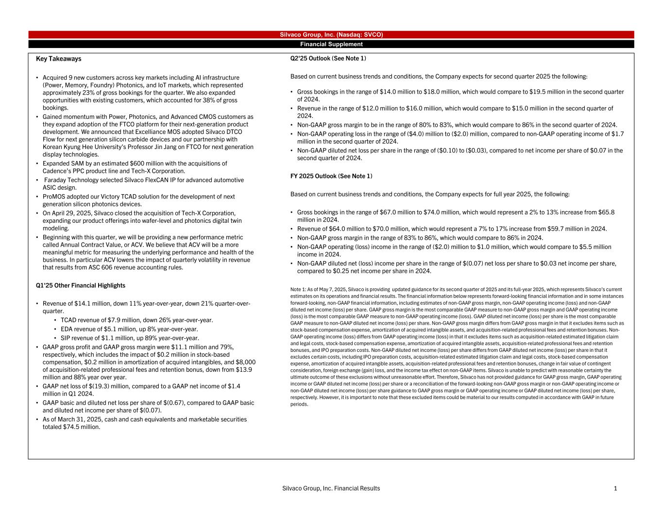 Silvaco Group, Inc. (Nasdaq: SVCO) Financial Supplement Key Takeaways • Acquired 9 new customers across key markets including AI infrastructure (Power, Memory, Foundry) Photonics, and IoT markets, which represented approximately 23% of gross bookings for the quarter. We also expanded opportunities with existing customers, which accounted for 38% of gross bookings. • Gained momentum with Power, Photonics, and Advanced CMOS customers as they expand adoption of the FTCO platform for their next-generation product development. We announced that Excelliance MOS adopted Silvaco DTCO Flow for next generation silicon carbide devices and our partnership with Korean Kyung Hee University’s Professor Jin Jang on FTCO for next generation display technologies. • Expanded SAM by an estimated $600 million with the acquisitions of Cadence’s PPC product line and Tech-X Corporation. • Faraday Technology selected Silvaco FlexCAN IP for advanced automotive ASIC design. • ProMOS adopted our Victory TCAD solution for the development of next generation silicon photonics devices. • On April 29, 2025, Silvaco closed the acquisition of Tech-X Corporation, expanding our product offerings into wafer-level and photonics digital twin modeling. • Beginning with this quarter, we will be providing a new performance metric called Annual Contract Value, or ACV. We believe that ACV will be a more meaningful metric for measuring the underlying performance and health of the business. In particular ACV lowers the impact of quarterly volatility in revenue that results from ASC 606 revenue accounting rules. Q1'25 Other Financial Highlights • Revenue of $14.1 million, down 11% year-over-year, down 21% quarter-over- quarter. • TCAD revenue of $7.9 million, down 26% year-over-year. • EDA revenue of $5.1 million, up 8% year-over-year. • SIP revenue of $1.1 million, up 89% year-over-year. • GAAP gross profit and GAAP gross margin were $11.1 million and 79%, respectively, which includes the impact of $0.2 million in stock-based compensation, $0.2 million in amortization of acquired intangibles, and $8,000 of acquisition-related professional fees and retention bonus, down from $13.9 million and 88% year over year. • GAAP net loss of $(19.3) million, compared to a GAAP net income of $1.4 million in Q1 2024. • GAAP basic and diluted net loss per share of $(0.67), compared to GAAP basic and diluted net income per share of $(0.07). • As of March 31, 2025, cash and cash equivalents and marketable securities totaled $74.5 million. x Q2'25 Outlook (See Note 1) Based on current business trends and conditions, the Company expects for second quarter 2025 the following: • Gross bookings in the range of $14.0 million to $18.0 million, which would compare to $19.5 million in the second quarter of 2024. • Revenue in the range of $12.0 million to $16.0 million, which would compare to $15.0 million in the second quarter of 2024. • Non-GAAP gross margin to be in the range of 80% to 83%, which would compare to 86% in the second quarter of 2024. • Non-GAAP operating loss in the range of ($4.0) million to ($2.0) million, compared to non-GAAP operating income of $1.7 million in the second quarter of 2024. • Non-GAAP diluted net loss per share in the range of ($0.10) to ($0.03), compared to net income per share of $0.07 in the second quarter of 2024. FY 2025 Outlook (See Note 1) Based on current business trends and conditions, the Company expects for full year 2025, the following: • Gross bookings in the range of $67.0 million to $74.0 million, which would represent a 2% to 13% increase from $65.8 million in 2024. • Revenue of $64.0 million to $70.0 million, which would represent a 7% to 17% increase from $59.7 million in 2024. • Non-GAAP gross margin in the range of 83% to 86%, which would compare to 86% in 2024. • Non-GAAP operating (loss) income in the range of ($2.0) million to $1.0 million, which would compare to $5.5 million income in 2024. • Non-GAAP diluted net (loss) income per share in the range of $(0.07) net loss per share to $0.03 net income per share, compared to $0.25 net income per share in 2024. Note 1: As of May 7, 2025, Silvaco is providing updated guidance for its second quarter of 2025 and its full-year 2025, which represents Silvaco’s current estimates on its operations and financial results. The financial information below represents forward-looking financial information and in some instances forward-looking, non-GAAP financial information, including estimates of non-GAAP gross margin, non-GAAP operating income (loss) and non-GAAP diluted net income (loss) per share. GAAP gross margin is the most comparable GAAP measure to non-GAAP gross margin and GAAP operating income (loss) is the most comparable GAAP measure to non-GAAP operating income (loss). GAAP diluted net income (loss) per share is the most comparable GAAP measure to non-GAAP diluted net income (loss) per share. Non-GAAP gross margin differs from GAAP gross margin in that it excludes items such as stock-based compensation expense, amortization of acquired intangible assets, and acquisition-related professional fees and retention bonuses. Non- GAAP operating income (loss) differs from GAAP operating income (loss) in that it excludes items such as acquisition-related estimated litigation claim and legal costs, stock-based compensation expense, amortization of acquired intangible assets, acquisition-related professional fees and retention bonuses, and IPO preparation costs. Non-GAAP diluted net income (loss) per share differs from GAAP diluted net income (loss) per share in that it excludes certain costs, including IPO preparation costs, acquisition-related estimated litigation claim and legal costs, stock-based compensation expense, amortization of acquired intangible assets, acquisition-related professional fees and retention bonuses, change in fair value of contingent consideration, foreign exchange (gain) loss, and the 