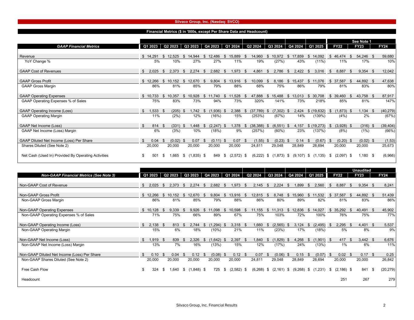 Silvaco Group, Inc. (Nasdaq: SVCO) Financial Metrics ($ in '000s, except Per Share Data and Headcount) See Note 1 GAAP Financial Metrics Q1 2023 Q2 2023 Q3 2023 Q4 2023 Q1 2024 Q2 2024 Q3 2024 Q4 2024 Q1 2025 FY22 FY23 FY24 Revenue 14,291$ 12,525$ 14,944$ 12,486$ 15,889$ 14,960$ 10,972$ 17,859$ 14,092$ 46,474$ 54,246$ 59,680$ YoY Change % 5% 10% 27% 27% 11% 19% (27%) 43% (11%) 11% 17% 10% GAAP Cost of Revenues 2,025$ 2,373$ 2,274$ 2,682$ 1,973$ 4,861$ 2,786$ 2,422$ 3,016$ 8,887$ 9,354$ 12,042$ GAAP Gross Profit 12,266$ 10,152$ 12,670$ 9,804$ 13,916$ 10,099$ 8,186$ 15,437$ 11,076$ 37,587$ 44,892$ 47,638$ GAAP Gross Margin 86% 81% 85% 79% 88% 68% 75% 86% 79% 81% 83% 80% GAAP Operating Expenses 10,733$ 10,357$ 10,928$ 11,740$ 11,528$ 47,888$ 15,488$ 13,013$ 30,708$ 39,460$ 43,758$ 87,917$ GAAP Operating Expenses % of Sales 75% 83% 73% 94% 73% 320% 141% 73% 218% 85% 81% 147% GAAP Operating Income (Loss) 1,533$ (205)$ 1,742$ (1,936)$ 2,388$ (37,789)$ (7,302)$ 2,424$ (19,632)$ (1,873)$ 1,134$ (40,279)$ GAAP Operating Margin 11% (2%) 12% (16%) 15% (253%) (67%) 14% (139%) (4%) 2% (67%) GAAP Net Income (Loss) 814$ (331)$ 1,448$ (2,247)$ 1,378$ (38,388)$ (6,551)$ 4,157$ (19,273)$ (3,928)$ (316)$ (39,404)$ GAAP Net Income (Loss) Margin 6% (3%) 10% (18%) 9% (257%) (60%) 23% (137%) (8%) (1%) (66%) GAAP Diluted Net Income (Loss) Per Share 0.04$ (0.02)$ 0.07$ (0.11)$ 0.07$ (1.55)$ (0.23)$ 0.14$ (0.67)$ (0.20)$ (0.02)$ (1.53)$ Shares Diluted (See Note 2) 20,000 20,000 20,000 20,000 20,000 24,811 29,048 28,849 28,694 20,000 20,000 25,673 Net Cash (Used In) Provided By Operating Activities 501$ 1,665$ (1,835)$ 849$ (2,572)$ (6,222)$ (1,873)$ (9,107)$ (1,135)$ (2,097)$ 1,180$ (6,966)$ Unaudited Non-GAAP Financial Metrics (See Note 3) Q1 2023 Q2 2023 Q3 2023 Q4 2023 Q1 2024 Q2 2024 Q3 2024 Q4 2024 Q1 2025 FY22 FY23 FY24 Non-GAAP Cost of Revenue 2,025$ 2,373$ 2,274$ 2,682$ 1,973$ 2,145$ 2,224$ 1,899$ 2,560$ 8,887$ 9,354$ 8,241$ Non-GAAP Gross Profit 12,266$ 10,152$ 12,670$ 9,804$ 13,916$ 12,815$ 8,748$ 15,960$ 11,532$ 37,587$ 44,892$ 51,439$ Non-GAAP Gross Margin 86% 81% 85% 79% 88% 86% 80% 89% 82% 81% 83% 86% Non-GAAP Operating Expenses 10,128$ 9,339$ 9,926$ 11,098$ 10,598$ 11,155$ 11,313$ 12,836$ 14,027$ 35,292$ 40,491$ 45,902$ Non-GAAP Operating Expenses % of Sales 71% 75% 66% 89% 67% 75% 103% 72% 100% 76% 75% 77% Non-GAAP Operating Income (Loss) 2,138$ 813$ 2,744$ (1,294)$ 3,318$ 1,660$ (2,565)$ 3,124$ (2,495)$ 2,295$ 4,401$ 5,537$ Non-GAAP Operating Margin 15% 6% 18% (10%) 21% 11% (23%) 17% (18%) 5% 8% 9% Non-GAAP Net Income (Loss) 1,919$ 839$ 2,326$ (1,642)$ 2,397$ 1,840$ (1,829)$ 4,268$ (1,901)$ 417$ 3,442$ 6,676$ Non-GAAP Net Income (Loss) Margin 13% 7% 16% (13%) 15% 12% (17%) 24% (13%) 1% 6% 11% Non-GAAP Diluted Net Income (Loss) Per Share 0.10$ 0.04$ 0.12$ (0.08)$ 0.12$ 0.07$ (0.06)$ 0.15$ (0.07)$ 0.02$ 0.17$ 0.25$ Non-GAAP Shares Diluted (See Note 2) 20,000 20,000 20,000 20,000 20,000 24,811 29,048 28,849 28,694 20,000 20,000 26,842 Free Cash Flow 324$ 1,640$ (1,848)$ 725$ (2,582)$ (6,268)$ (2,161)$ (9,268)$ (1,231)$ (2,186)$ 841$ (20,279)$ Headcount 251 267 279 Silvaco Group, Inc. Financial Results 2