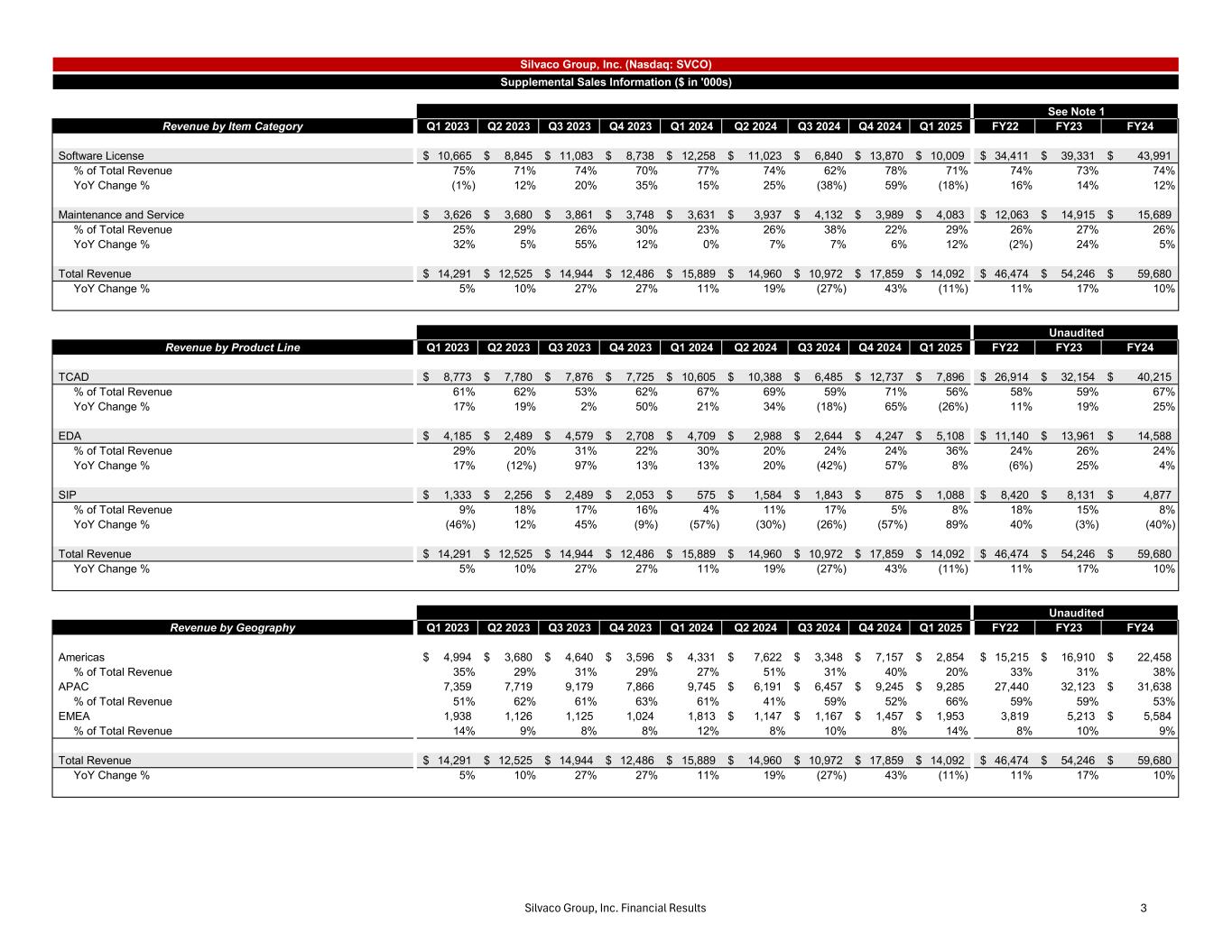 Silvaco Group, Inc. (Nasdaq: SVCO) Supplemental Sales Information ($ in '000s) See Note 1 Revenue by Item Category Q1 2023 Q2 2023 Q3 2023 Q4 2023 Q1 2024 Q2 2024 Q3 2024 Q4 2024 Q1 2025 FY22 FY23 FY24 Software License 10,665$ 8,845$ 11,083$ 8,738$ 12,258$ 11,023$ 6,840$ 13,870$ 10,009$ 34,411$ 39,331$ 43,991$ % of Total Revenue 75% 71% 74% 70% 77% 74% 62% 78% 71% 74% 73% 74% YoY Change % (1%) 12% 20% 35% 15% 25% (38%) 59% (18%) 16% 14% 12% Maintenance and Service 3,626$ 3,680$ 3,861$ 3,748$ 3,631$ 3,937$ 4,132$ 3,989$ 4,083$ 12,063$ 14,915$ 15,689$ % of Total Revenue 25% 29% 26% 30% 23% 26% 38% 22% 29% 26% 27% 26% YoY Change % 32% 5% 55% 12% 0% 7% 7% 6% 12% (2%) 24% 5% Total Revenue 14,291$ 12,525$ 14,944$ 12,486$ 15,889$ 14,960$ 10,972$ 17,859$ 14,092$ 46,474$ 54,246$ 59,680$ YoY Change % 5% 10% 27% 27% 11% 19% (27%) 43% (11%) 11% 17% 10% Unaudited Revenue by Product Line Q1 2023 Q2 2023 Q3 2023 Q4 2023 Q1 2024 Q2 2024 Q3 2024 Q4 2024 Q1 2025 FY22 FY23 FY24 TCAD 8,773$ 7,780$ 7,876$ 7,725$ 10,605$ 10,388$ 6,485$ 12,737$ 7,896$ 26,914$ 32,154$ 40,215$ % of Total Revenue 61% 62% 53% 62% 67% 69% 59% 71% 56% 58% 59% 67% YoY Change % 17% 19% 2% 50% 21% 34% (18%) 65% (26%) 11% 19% 25% EDA 4,185$ 2,489$ 4,579$ 2,708$ 4,709$ 2,988$ 2,644$ 4,247$ 5,108$ 11,140$ 13,961$ 14,588$ % of Total Revenue 29% 20% 31% 22% 30% 20% 24% 24% 36% 24% 26% 24% YoY Change % 17% (12%) 97% 13% 13% 20% (42%) 57% 8% (6%) 25% 4% SIP 1,333$ 2,256$ 2,489$ 2,053$ 575$ 1,584$ 1,843$ 875$ 1,088$ 8,420$ 8,131$ 4,877$ % of Total Revenue 9% 18% 17% 16% 4% 11% 17% 5% 8% 18% 15% 8% YoY Change % (46%) 12% 45% (9%) (57%) (30%) (26%) (57%) 89% 40% (3%) (40%) Total Revenue 14,291$ 12,525$ 14,944$ 12,486$ 15,889$ 14,960$ 10,972$ 17,859$ 14,092$ 46,474$ 54,246$ 59,680$ YoY Change % 5% 10% 27% 27% 11% 19% (27%) 43% (11%) 11% 17% 10% Unaudited Revenue by Geography Q1 2023 Q2 2023 Q3 2023 Q4 2023 Q1 2024 Q2 2024 Q3 2024 Q4 2024 Q1 2025 FY22 FY23 FY24 Americas 4,994$ 3,680$ 4,640$ 3,596$ 4,331$ 7,622$ 3,348$ 7,157$ 2,854$ 15,215$ 16,910$ 22,458$ % of Total Revenue 35% 29% 31% 29% 27% 51% 31% 40% 20% 33% 31% 38% APAC 7,359 7,719 9,179 7,866 9,745 6,191$ 6,457$ 9,245$ 9,285$ 27,440 32,123 31,638$ % of Total Revenue 51% 62% 61% 63% 61% 41% 59% 52% 66% 59% 59% 53% EMEA 1,938 1,126 1,125 1,024 1,813 1,147$ 1,167$ 1,457$ 1,953$ 3,819 5,213 5,584$ % of Total Revenue 14% 9% 8% 8% 12% 8% 10% 8% 14% 8% 10% 9% Total Revenue 14,291$ 12,525$ 14,944$ 12,486$ 15,889$ 14,960$ 10,972$ 17,859$ 14,092$ 46,474$ 54,246$ 59,680$ YoY Change % 5% 10% 27% 27% 11% 19% (27%) 43% (11%) 11% 17% 10% Silvaco Group, Inc. Financial Results 3
