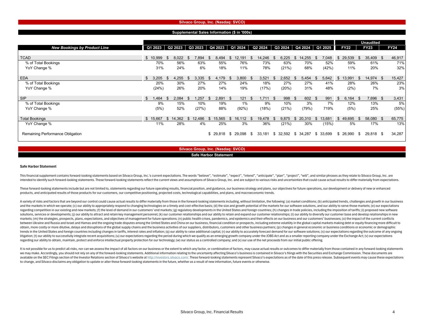 Silvaco Group, Inc. (Nasdaq: SVCO) Supplemental Sales Information ($ in '000s) Unaudited New Bookings by Product Line Q1 2023 Q2 2023 Q3 2023 Q4 2023 Q1 2024 Q2 2024 Q3 2024 Q4 2024 Q1 2025 FY22 FY23 FY24 TCAD 10,999$ 8,022$ 7,894$ 8,494$ 12,191$ 14,246$ 6,225$ 14,255$ 7,048$ 29,539$ 35,409$ 46,917$ % of Total Bookings 70% 56% 63% 55% 76% 73% 63% 70% 52% 59% 61% 71% YoY Change % 31% 24% 6% 18% 11% 78% (21%) 68% (42%) 11% 20% 32% EDA 3,205$ 4,255$ 3,335$ 4,179$ 3,800$ 3,521$ 2,652$ 5,454$ 5,642$ 13,991$ 14,974$ 15,427$ % of Total Bookings 20% 30% 27% 27% 24% 18% 27% 27% 41% 28% 26% 23% YoY Change % (24%) 26% 20% 14% 19% (17%) (20%) 31% 48% (2%) 7% 3% SIP 1,464$ 2,084$ 1,257$ 2,891$ 121$ 1,711$ 998$ 602$ 991$ 6,164$ 7,696$ 3,431$ % of Total Bookings 9% 15% 10% 19% 1% 9% 10% 3% 7% 12% 13% 5% YoY Change % (5%) 52% (27%) 88% (92%) (18%) (21%) (79%) 719% (5%) 25% (55%) Total Bookings 15,667$ 14,362$ 12,486$ 15,565$ 16,112$ 19,478$ 9,875$ 20,310$ 13,681$ 49,695$ 58,080$ 65,775$ YoY Change % 11% 28% 4% 25% 3% 36% (21%) 30% (15%) 5% 17% 13% Remaining Performance Obligation 29,818$ 29,098$ 33,181$ 32,592$ 34,287$ 33,699$ 26,990$ 29,818$ 34,287$ Silvaco Group, Inc. (Nasdaq: SVCO) Safe Harbor Statement Safe Harbor Statement This financial supplement contains forward-looking statements based on Silvaco Group, Inc.'s current expectations. The words “believe”, “estimate”, “expect”, “intend”, “anticipate”, “plan”, “project”, “will”, and similar phrases as they relate to Silvaco Group, Inc. are intended to identify such forward-looking statements. These forward-looking statements reflect the current views and assumptions of Silvaco Group, Inc. and are subject to various risks and uncertainties that could cause actual results to differ materially from expectations. These forward-looking statements include but are not limited to, statements regarding our future operating results, financial position, and guidance, our business strategy and plans, our objectives for future operations, our development or delivery of new or enhanced products, and anticipated results of those products for our customers, our competitive positioning, projected costs, technological capabilities, and plans, and macroeconomic trends. A variety of risks and factors that are beyond our control could cause actual results to differ materially from those in the forward-looking statements including, without limitation, the following: (a) market conditions; (b) anticipated trends, challenges and growth in our business and the markets in which we operate; (c) our ability to appropriately respond to changing technologies on a timely and cost-effective basis; (d) the size and growth potential of the markets for our software solutions, and our ability to serve those markets; (e) our expectations regarding competition in our existing and new markets; (f) the level of demand in our customers’ end markets; (g) regulatory developments in the United States and foreign countries; (h) changes in trade policies, including the imposition of tariffs; (i) proposed new software solutions, services or developments; (j) our ability to attract and retain key management personnel; (k) our customer relationships and our ability to retain and expand our customer relationships; (l) our ability to diversify our customer base and develop relationships in new markets; (m) the strategies, prospects, plans, expectations, and objectives of management for future operations; (n) public health crises, pandemics, and epidemics and their effects on our business and our customers’ businesses; (o) the impact of the current conflicts between Ukraine and Russia and Israel and Hamas and the ongoing trade disputes among the United States and China on our business, financial condition or prospects, including extreme volatility in the global capital markets making debt or equity financing more difficult to obtain, more costly or more dilutive, delays and disruptions of the global supply chains and the business activities of our suppliers, distributors, customers and other business partners; (p) changes in general economic or business conditions or economic or demographic trends in the United States and foreign countries including changes in tariffs, interest rates and inflation; (q) our ability to raise additional capital; (r) our ability to accurately forecast demand for our software solutions; (s) our expectations regarding the outcome of any ongoing litigation; (t) our ability to successfully integrate recent acquisitions; (u) our expectations regarding the period during which we qualify as an emerging growth company under the JOBS Act and as a smaller reporting company under the Exchange Act; (v) our expectations regarding our ability to obtain, maintain, protect and enforce intellectual property protection for our technology; (w) our status as a controlled company; and (x) our use of the net proceeds from our initial public offering. It is not possible for us to predict all risks, nor can we assess the impact of all factors on our business or the extent to which any factor, or combination of factors, may cause actual results or outcomes to differ materially from those contained in any forward-looking statements we may make. Accordingly, you should not rely on any of the forward-looking statements. Additional information relating to the uncertainty affecting Silvaco’s business is contained in Silvaco’s filings with the Securities and Exchange Commission. These documents are available on the SEC Filings section of the Investor Relations section of Silvaco’s website at http://investors.silvaco.com/. These forward-looking statements represent Silvaco’s expectations as of the date of this press release. Subsequent events may cause these expectations to change, and Silvaco disclaims any obligation to update or alter these forward-looking statements in the future, whether as a result of new information, future events or otherwise. Silvaco 