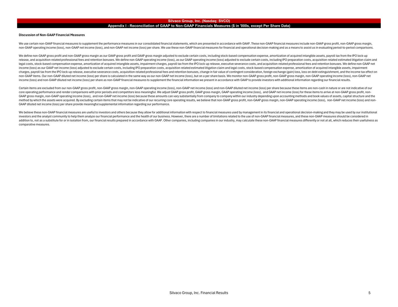 Silvaco Group, Inc. (Nasdaq: SVCO) Appendix I - Reconciliation of GAAP to Non-GAAP Financials Measures ($ in '000s, except Per Share Data) Discussion of Non-GAAP Financial Measures We use certain non-GAAP financial measures to supplement the performance measures in our consolidated financial statements, which are presented in accordance with GAAP. These non-GAAP financial measures include non-GAAP gross profit, non-GAAP gross margin, non-GAAP operating income (loss), non-GAAP net income (loss), and non-GAAP net income (loss) per share. We use these non-GAAP financial measures for financial and operational decision-making and as a means to assist us in evaluating period-to-period comparisons. We define non-GAAP gross profit and non-GAAP gross margin as our GAAP gross profit and GAAP gross margin adjusted to exclude certain costs, including stock-based compensation expense, amortization of acquired intangible assets, payroll tax from the IPO lock-up release, and acquisition-related professional fees and retention bonuses. We define non-GAAP operating income (loss), as our GAAP operating income (loss) adjusted to exclude certain costs, including IPO preparation costs, acquisition-related estimated litigation claim and legal costs, stock-based compensation expense, amortization of acquired intangible assets, impairment charges, payroll tax from the IPO lock-up release, executive severance costs, and acquisition-related professional fees and retention bonuses. We define non-GAAP net income (loss) as our GAAP net income (loss) adjusted to exclude certain costs, including IPO preparation costs, acquisition-related estimated litigation claim and legal costs, stock-based compensation expense, amortization of acquired intangible assets, impairment charges, payroll tax from the IPO lock-up release, executive severance costs, acquisition-related professional fees and retention bonuses, change in fair value of contingent consideration, foreign exchange (gain) loss, loss on debt extinguishment, and the income tax effect on non-GAAP items. Our non-GAAP diluted net income (loss) per share is calculated in the same way as our non-GAAP net income (loss), but on a per share basis. We monitor non-GAAP gross profit, non-GAAP gross margin, non-GAAP operating income (loss), non-GAAP net income (loss) and non-GAAP diluted net income (loss) per share as non-GAAP financial measures to supplement the financial information we present in accordance with GAAP to provide investors with additional information regarding our financial results. Certain items are excluded from our non-GAAP gross profit, non-GAAP gross margin, non-GAAP operating income (loss), non-GAAP net income (loss) and non-GAAP diluted net income (loss) per share because these items are non-cash in nature or are not indicative of our core operating performance and render comparisons with prior periods and competitors less meaningful. We adjust GAAP gross profit, GAAP gross margin, GAAP operating income (loss), and GAAP net income (loss) for these items to arrive at non-GAAP gross profit, non- GAAP gross margin, non-GAAP operating income (loss), and non-GAAP net income (loss) because these amounts can vary substantially from company to company within our industry depending upon accounting methods and book values of assets, capital structure and the method by which the assets were acquired. By excluding certain items that may not be indicative of our recurring core operating results, we believe that non-GAAP gross profit, non-GAAP gross margin, non-GAAP operating income (loss), non-GAAP net income (loss) and non- GAAP diluted net income (loss) per share provide meaningful supplemental information regarding our performance. We believe these non-GAAP financial measures are useful to investors and others because they allow for additional information with respect to financial measures used by management in its financial and operational decision-making and they may be used by our institutional investors and the analyst community to help them analyze our financial performance and the health of our business. However, there are a number of limitations related to the use of non-GAAP financial measures, and these non-GAAP measures should be considered in addition to, not as a substitute for or in isolation from, our financial results prepared in accordance with GAAP. Other companies, including companies in our industry, may calculate these non-GAAP financial measures differently or not at all, which reduces their usefulness as comparative measures. x Silvaco Group, Inc. Financial Results 5