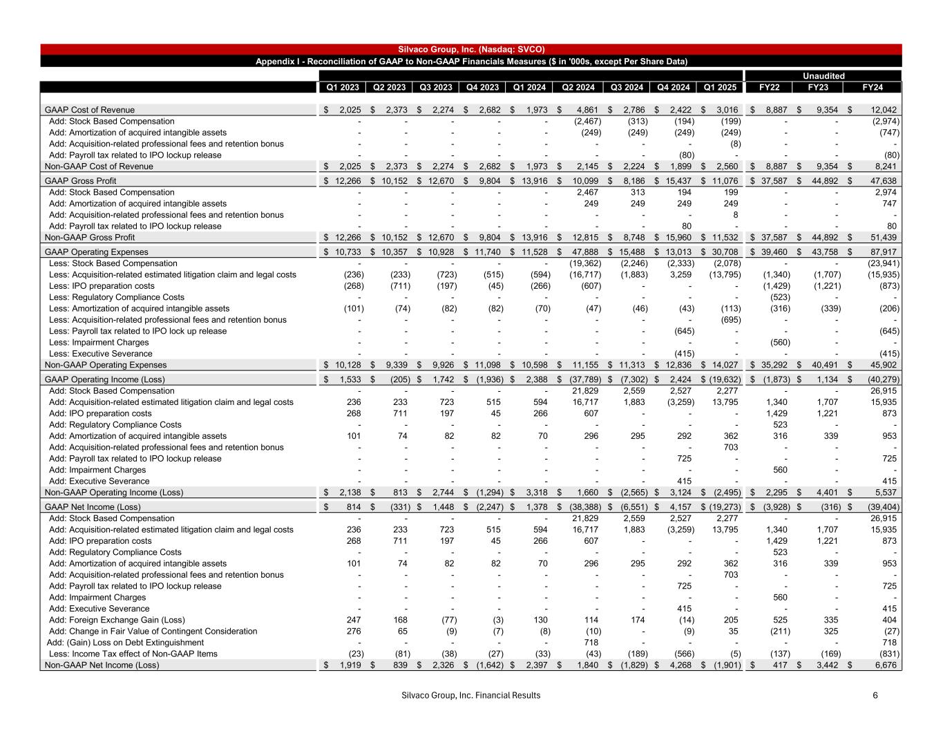 Silvaco Group, Inc. (Nasdaq: SVCO) Appendix I - Reconciliation of GAAP to Non-GAAP Financials Measures ($ in '000s, except Per Share Data) Unaudited Q1 2023 Q2 2023 Q3 2023 Q4 2023 Q1 2024 Q2 2024 Q3 2024 Q4 2024 Q1 2025 FY22 FY23 FY24 GAAP Cost of Revenue 2,025$ 2,373$ 2,274$ 2,682$ 1,973$ 4,861$ 2,786$ 2,422$ 3,016$ 8,887$ 9,354$ 12,042$ Add: Stock Based Compensation - - - - - (2,467) (313) (194) (199) - - (2,974) Add: Amortization of acquired intangible assets - - - - - (249) (249) (249) (249) - - (747) Add: Acquisition-related professional fees and retention bonus - - - - - - - - (8) - - - Add: Payroll tax related to IPO lockup release - - - - - - - (80) - - - (80) Non-GAAP Cost of Revenue 2,025$ 2,373$ 2,274$ 2,682$ 1,973$ 2,145$ 2,224$ 1,899$ 2,560$ 8,887$ 9,354$ 8,241$ GAAP Gross Profit 12,266$ 10,152$ 12,670$ 9,804$ 13,916$ 10,099$ 8,186$ 15,437$ 11,076$ 37,587$ 44,892$ 47,638$ Add: Stock Based Compensation - - - - - 2,467 313 194 199 - - 2,974 Add: Amortization of acquired intangible assets - - - - - 249 249 249 249 - - 747 Add: Acquisition-related professional fees and retention bonus - - - - - - - - 8 - - - Add: Payroll tax related to IPO lockup release - - - - - - - 80 - - - 80 Non-GAAP Gross Profit 12,266$ 10,152$ 12,670$ 9,804$ 13,916$ 12,815$ 8,748$ 15,960$ 11,532$ 37,587$ 44,892$ 51,439$ GAAP Operating Expenses 10,733$ 10,357$ 10,928$ 11,740$ 11,528$ 47,888$ 15,488$ 13,013$ 30,708$ 39,460$ 43,758$ 87,917$ Less: Stock Based Compensation - - - - - (19,362) (2,246) (2,333) (2,078) - - (23,941) Less: Acquisition-related estimated litigation claim and legal costs (236) (233) (723) (515) (594) (16,717) (1,883) 3,259 (13,795) (1,340) (1,707) (15,935) Less: IPO preparation costs (268) (711) (197) (45) (266) (607) - - - (1,429) (1,221) (873) Less: Regulatory Compliance Costs - - - - - - - - - (523) - - Less: Amortization of acquired intangible assets (101) (74) (82) (82) (70) (47) (46) (43) (113) (316) (339) (206) Less: Acquisition-related professional fees and retention bonus - - - - - - - - (695) - - - Less: Payroll tax related to IPO lock up release - - - - - - - (645) - - - (645) Less: Impairment Charges - - - - - - - - - (560) - - Less: Executive Severance - - - - - - - (415) - - - (415) Non-GAAP Operating Expenses 10,128$ 9,339$ 9,926$ 11,098$ 10,598$ 11,155$ 11,313$ 12,836$ 14,027$ 35,292$ 40,491$ 45,902$ GAAP Operating Income (Loss) 1,533$ (205)$ 1,742$ (1,936)$ 2,388$ (37,789)$ (7,302)$ 2,424$ (19,632)$ (1,873)$ 1,134$ (40,279)$ Add: Stock Based Compensation - - - - - 21,829 2,559 2,527 2,277 - - 26,915 Add: Acquisition-related estimated litigation claim and legal costs 236 233 723 515 594 16,717 1,883 (3,259) 13,795 1,340 1,707 15,935 Add: IPO preparation costs 268 711 197 45 266 607 - - - 1,429 1,221 873 Add: Regulatory Compliance Costs - - - - - - - - - 523 - - Add: Amortization of acquired intangible assets 101 74 82 82 70 296 295 292 362 316 339 953 Add: Acquisition-related professional fees and retention bonus - - - - - - - - 703 - - - Add: Payroll tax related to IPO lockup release - - - - - - - 725 - - - 725 Add: Impairment Charges - - - - - - - - - 560 - - Add: Executive Severance - - - - - - - 415 - - - 415 Non-GAAP Operating Income (Loss) 2,138$ 813$ 2,744$ (1,294)$ 3,318$ 1,660$ (2,565)$ 3,124$ (2,495)$ 2,295$ 4,401$ 5,537$ GAAP Net Income (Loss) 814$ (331)$ 1,448$ (2,247)$ 1,378$ (38,388)$ (6,551)$ 4,157$ (19,273)$ (3,928)$ (316)$ (39,404)$ Add: Stock Based Compensation - - - - - 21,829 2,559 2,527 2,277 - - 26,915 Add: Acquisition-related estimated litigation claim and legal costs 236 233 723 515 594 16,717 1,883 (3,259) 13,795 1,340 1,707 15,935 Add: IPO preparation costs 268 711 197 45 266 607 - - - 1,429 1,221 873 Add: Regulatory Compliance Costs - - - - - - - - - 523 - - Add: Amortization of acquired intangible assets 101 74 82 82 70 296 295 292 362 316 339 953 Add: Acquisition-related professional fees and retention bonus - - - - - - - - 703 - - - Add: Payroll tax related to IPO lockup release - - - - - - - 725 - - - 725 Add: Impairment Charges - - - - - - - - - 560 - - Add: Executive Severance - - - - - - - 415 - - - 415 Add: Foreign Exchange Gain (Loss) 247 168 (77) (3) 130 114 174 (14) 205 525 335 404 Add: Change in Fair Value of Contingent Consideration 276 65 (9) (7) (8) (10) - (9) 35 (211) 325 (27) Add: (Gain) Loss on Debt Extinguishment - - - - - 718 - - - - - 718 Less: Income Tax effect of Non-GAAP Items (23) (81) (38) (27) (33) (43) (189) (566) (5) (137) (169) (831) Non-GAAP Net Income (Loss) 1,919$ 839$ 2,326$ (1,642)$ 2,397$ 1,840$ (1,829)$ 4,268$ (1,901)$ 417$ 3,442$ 6,676$ Silvaco Group, Inc. Financial Results 6