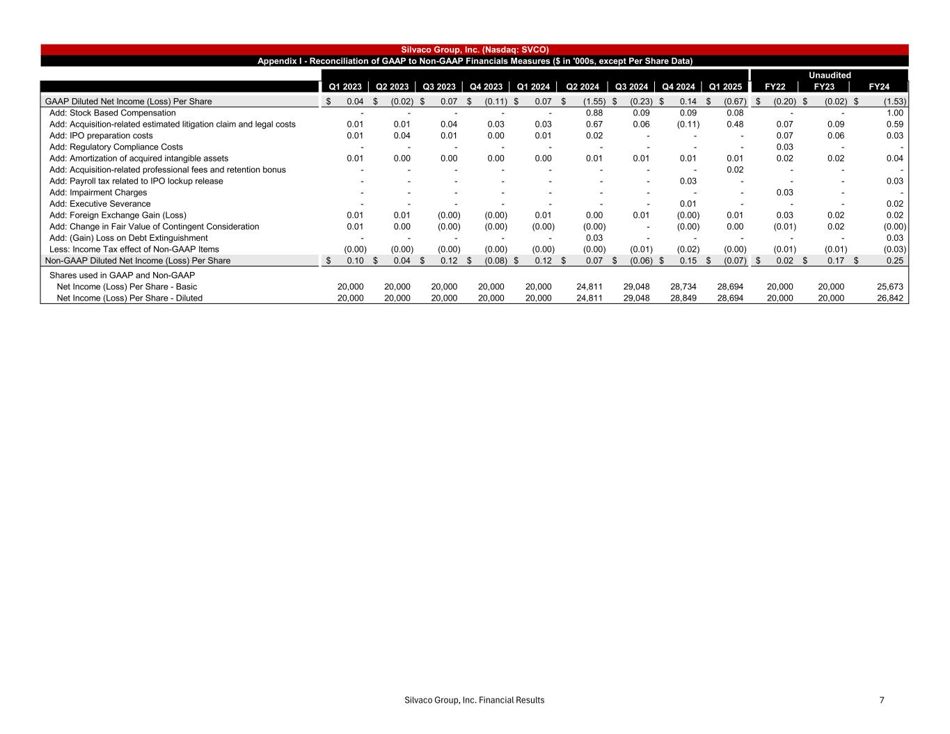 Silvaco Group, Inc. (Nasdaq: SVCO) Appendix I - Reconciliation of GAAP to Non-GAAP Financials Measures ($ in '000s, except Per Share Data) Unaudited Q1 2023 Q2 2023 Q3 2023 Q4 2023 Q1 2024 Q2 2024 Q3 2024 Q4 2024 Q1 2025 FY22 FY23 FY24 GAAP Diluted Net Income (Loss) Per Share 0.04$ (0.02)$ 0.07$ (0.11)$ 0.07$ (1.55)$ (0.23)$ 0.14$ (0.67)$ (0.20)$ (0.02)$ (1.53)$ Add: Stock Based Compensation - - - - - 0.88 0.09 0.09 0.08 - - 1.00 Add: Acquisition-related estimated litigation claim and legal costs 0.01 0.01 0.04 0.03 0.03 0.67 0.06 (0.11) 0.48 0.07 0.09 0.59 Add: IPO preparation costs 0.01 0.04 0.01 0.00 0.01 0.02 - - - 0.07 0.06 0.03 Add: Regulatory Compliance Costs - - - - - - - - - 0.03 - - Add: Amortization of acquired intangible assets 0.01 0.00 0.00 0.00 0.00 0.01 0.01 0.01 0.01 0.02 0.02 0.04 Add: Acquisition-related professional fees and retention bonus - - - - - - - - 0.02 - - - Add: Payroll tax related to IPO lockup release - - - - - - - 0.03 - - - 0.03 Add: Impairment Charges - - - - - - - - - 0.03 - - Add: Executive Severance - - - - - - - 0.01 - - - 0.02 Add: Foreign Exchange Gain (Loss) 0.01 0.01 (0.00) (0.00) 0.01 0.00 0.01 (0.00) 0.01 0.03 0.02 0.02 Add: Change in Fair Value of Contingent Consideration 0.01 0.00 (0.00) (0.00) (0.00) (0.00) - (0.00) 0.00 (0.01) 0.02 (0.00) Add: (Gain) Loss on Debt Extinguishment - - - - - 0.03 - - - - - 0.03 Less: Income Tax effect of Non-GAAP Items (0.00) (0.00) (0.00) (0.00) (0.00) (0.00) (0.01) (0.02) (0.00) (0.01) (0.01) (0.03) Non-GAAP Diluted Net Income (Loss) Per Share 0.10$ 0.04$ 0.12$ (0.08)$ 0.12$ 0.07$ (0.06)$ 0.15$ (0.07)$ 0.02$ 0.17$ 0.25$ Shares used in GAAP and Non-GAAP Net Income (Loss) Per Share - Basic 20,000 20,000 20,000 20,000 20,000 24,811 29,048 28,734 28,694 20,000 20,000 25,673 Net Income (Loss) Per Share - Diluted 20,000 20,000 20,000 20,000 20,000 24,811 29,048 28,849 28,694 20,000 20,000 26,842 Silvaco Group, Inc. Financial Results 7