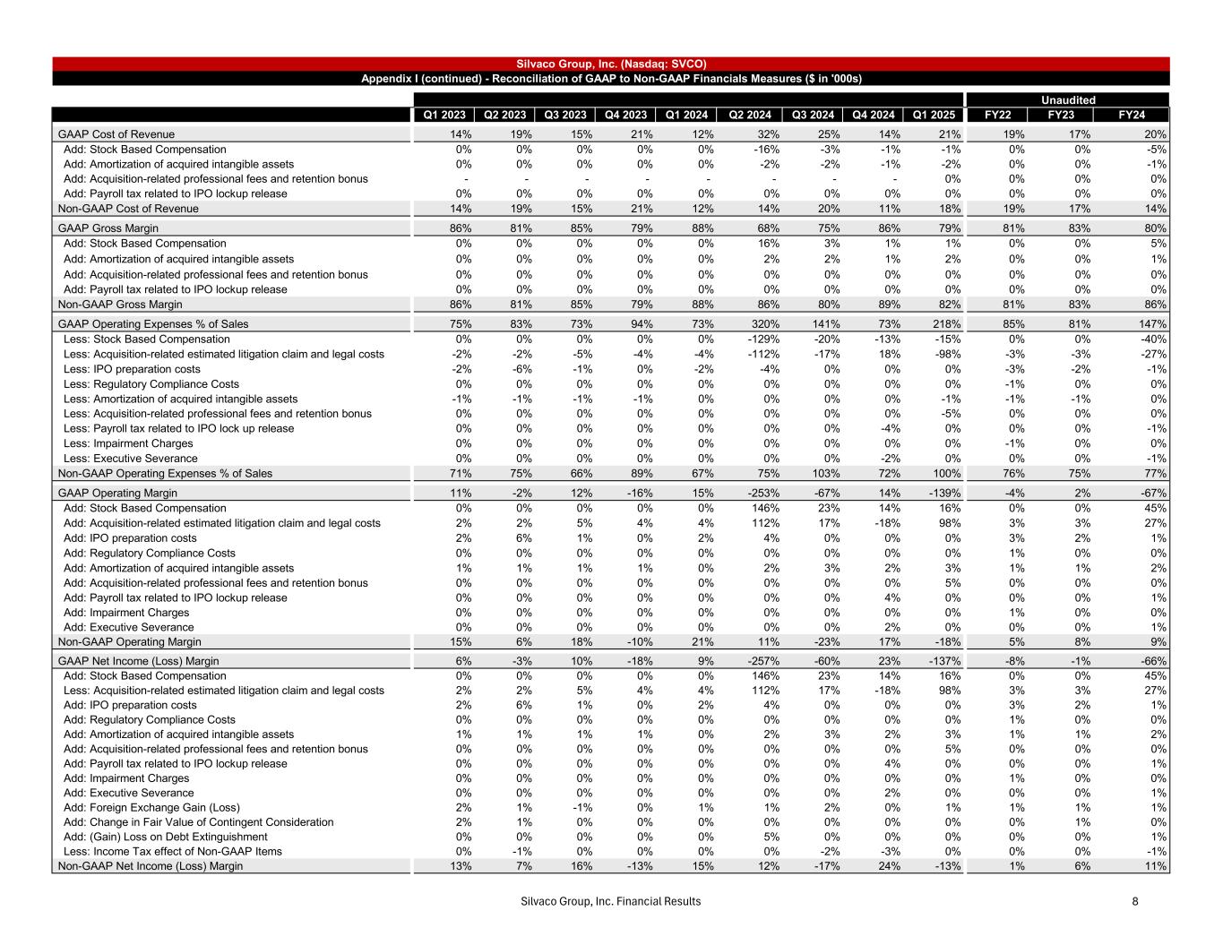 Silvaco Group, Inc. (Nasdaq: SVCO) Appendix I (continued) - Reconciliation of GAAP to Non-GAAP Financials Measures ($ in '000s) Unaudited Q1 2023 Q2 2023 Q3 2023 Q4 2023 Q1 2024 Q2 2024 Q3 2024 Q4 2024 Q1 2025 FY22 FY23 FY24 GAAP Cost of Revenue 14% 19% 15% 21% 12% 32% 25% 14% 21% 19% 17% 20% Add: Stock Based Compensation 0% 0% 0% 0% 0% -16% -3% -1% -1% 0% 0% -5% Add: Amortization of acquired intangible assets 0% 0% 0% 0% 0% -2% -2% -1% -2% 0% 0% -1% Add: Acquisition-related professional fees and retention bonus - - - - - - - - 0% 0% 0% 0% Add: Payroll tax related to IPO lockup release 0% 0% 0% 0% 0% 0% 0% 0% 0% 0% 0% 0% Non-GAAP Cost of Revenue 14% 19% 15% 21% 12% 14% 20% 11% 18% 19% 17% 14% GAAP Gross Margin 86% 81% 85% 79% 88% 68% 75% 86% 79% 81% 83% 80% Add: Stock Based Compensation 0% 0% 0% 0% 0% 16% 3% 1% 1% 0% 0% 5% Add: Amortization of acquired intangible assets 0% 0% 0% 0% 0% 2% 2% 1% 2% 0% 0% 1% Add: Acquisition-related professional fees and retention bonus 0% 0% 0% 0% 0% 0% 0% 0% 0% 0% 0% 0% Add: Payroll tax related to IPO lockup release 0% 0% 0% 0% 0% 0% 0% 0% 0% 0% 0% 0% Non-GAAP Gross Margin 86% 81% 85% 79% 88% 86% 80% 89% 82% 81% 83% 86% GAAP Operating Expenses % of Sales 75% 83% 73% 94% 73% 320% 141% 73% 218% 85% 81% 147% Less: Stock Based Compensation 0% 0% 0% 0% 0% -129% -20% -13% -15% 0% 0% -40% Less: Acquisition-related estimated litigation claim and legal costs -2% -2% -5% -4% -4% -112% -17% 18% -98% -3% -3% -27% Less: IPO preparation costs -2% -6% -1% 0% -2% -4% 0% 0% 0% -3% -2% -1% Less: Regulatory Compliance Costs 0% 0% 0% 0% 0% 0% 0% 0% 0% -1% 0% 0% Less: Amortization of acquired intangible assets -1% -1% -1% -1% 0% 0% 0% 0% -1% -1% -1% 0% Less: Acquisition-related professional fees and retention bonus 0% 0% 0% 0% 0% 0% 0% 0% -5% 0% 0% 0% Less: Payroll tax related to IPO lock up release 0% 0% 0% 0% 0% 0% 0% -4% 0% 0% 0% -1% Less: Impairment Charges 0% 0% 0% 0% 0% 0% 0% 0% 0% -1% 0% 0% Less: Executive Severance 0% 0% 0% 0% 0% 0% 0% -2% 0% 0% 0% -1% Non-GAAP Operating Expenses % of Sales 71% 75% 66% 89% 67% 75% 103% 72% 100% 76% 75% 77% GAAP Operating Margin 11% -2% 12% -16% 15% -253% -67% 14% -139% -4% 2% -67% Add: Stock Based Compensation 0% 0% 0% 0% 0% 146% 23% 14% 16% 0% 0% 45% Add: Acquisition-related estimated litigation claim and legal costs 2% 2% 5% 4% 4% 112% 17% -18% 98% 3% 3% 27% Add: IPO preparation costs 2% 6% 1% 0% 2% 4% 0% 0% 0% 3% 2% 1% Add: Regulatory Compliance Costs 0% 0% 0% 0% 0% 0% 0% 0% 0% 1% 0% 0% Add: Amortization of acquired intangible assets 1% 1% 1% 1% 0% 2% 3% 2% 3% 1% 1% 2% Add: Acquisition-related professional fees and retention bonus 0% 0% 0% 0% 0% 0% 0% 0% 5% 0% 0% 0% Add: Payroll tax related to IPO lockup release 0% 0% 0% 0% 0% 0% 0% 4% 0% 0% 0% 1% Add: Impairment Charges 0% 0% 0% 0% 0% 0% 0% 0% 0% 1% 0% 0% Add: Executive Severance 0% 0% 0% 0% 0% 0% 0% 2% 0% 0% 0% 1% Non-GAAP Operating Margin 15% 6% 18% -10% 21% 11% -23% 17% -18% 5% 8% 9% GAAP Net Income (Loss) Margin 6% -3% 10% -18% 9% -257% -60% 23% -137% -8% -1% -66% Add: Stock Based Compensation 0% 0% 0% 0% 0% 146% 23% 14% 16% 0% 0% 45% Less: Acquisition-related estimated litigation claim and legal costs 2% 2% 5% 4% 4% 112% 17% -18% 98% 3% 3% 27% Add: IPO preparation costs 2% 6% 1% 0% 2% 4% 0% 0% 0% 3% 2% 1% Add: Regulatory Compliance Costs 0% 0% 0% 0% 0% 0% 0% 0% 0% 1% 0% 0% Add: Amortization of acquired intangible assets 1% 1% 1% 1% 0% 2% 3% 2% 3% 1% 1% 2% Add: Acquisition-related professional fees and retention bonus 0% 0% 0% 0% 0% 0% 0% 0% 5% 0% 0% 0% Add: Payroll tax related to IPO lockup release 0% 0% 0% 0% 0% 0% 0% 4% 0% 0% 0% 1% Add: Impairment Charges 0% 0% 0% 0% 0% 0% 0% 0% 0% 1% 0% 0% Add: Executive Severance 0% 0% 0% 0% 0% 0% 0% 2% 0% 0% 0% 1% Add: Foreign Exchange Gain (Loss) 2% 1% -1% 0% 1% 1% 2% 0% 1% 1% 1% 1% Add: Change in Fair Value of Contingent Consideration 2% 1% 0% 0% 0% 0% 0% 0% 0% 0% 1% 0% Add: (Gain) Loss on Debt Extinguishment 0% 0% 0% 0% 0% 5% 0% 0% 0% 0% 0% 1% Less: Income Tax effect of Non-GAAP Items 0% -1% 0% 0% 0% 0% -2% -3% 0% 0% 0% -1% Non-GAAP Net Income (Loss) Margin 13% 7% 16% -13% 15% 12% -17% 24% -13% 1% 6% 11% Silvaco Group, Inc. Financial Results 8