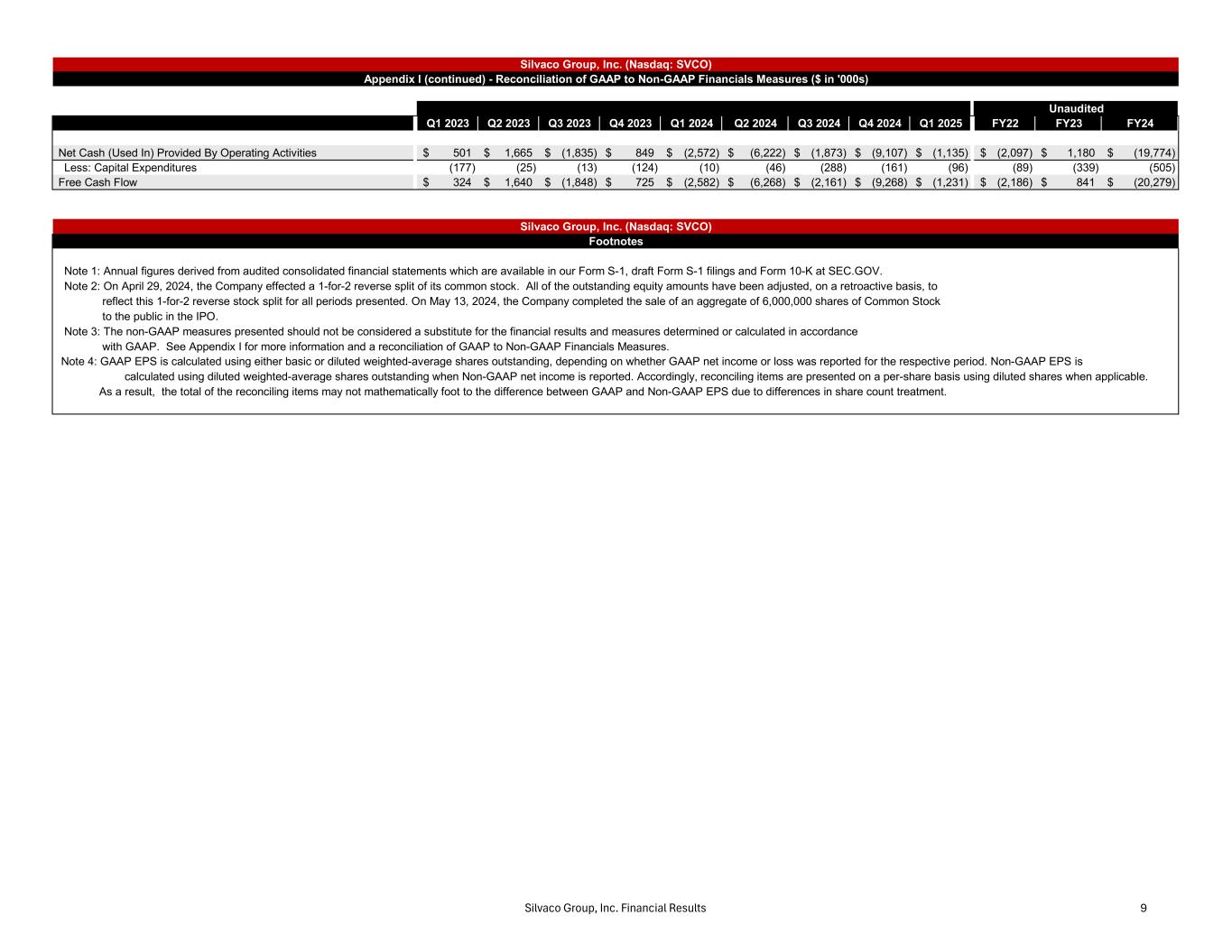 Silvaco Group, Inc. (Nasdaq: SVCO) Appendix I (continued) - Reconciliation of GAAP to Non-GAAP Financials Measures ($ in '000s) Unaudited Q1 2023 Q2 2023 Q3 2023 Q4 2023 Q1 2024 Q2 2024 Q3 2024 Q4 2024 Q1 2025 FY22 FY23 FY24 Net Cash (Used In) Provided By Operating Activities 501$ 1,665$ (1,835)$ 849$ (2,572)$ (6,222)$ (1,873)$ (9,107)$ (1,135)$ (2,097)$ 1,180$ (19,774)$ Less: Capital Expenditures (177) (25) (13) (124) (10) (46) (288) (161) (96) (89) (339) (505) Free Cash Flow 324$ 1,640$ (1,848)$ 725$ (2,582)$ (6,268)$ (2,161)$ (9,268)$ (1,231)$ (2,186)$ 841$ (20,279)$ Silvaco Group, Inc. (Nasdaq: SVCO) Footnotes Note 1: Annual figures derived from audited consolidated financial statements which are available in our Form S-1, draft Form S-1 filings and Form 10-K at SEC.GOV. Note 2: On April 29, 2024, the Company effected a 1-for-2 reverse split of its common stock. All of the outstanding equity amounts have been adjusted, on a retroactive basis, to reflect this 1-for-2 reverse stock split for all periods presented. On May 13, 2024, the Company completed the sale of an aggregate of 6,000,000 shares of Common Stock to the public in the IPO. Note 3: The non-GAAP measures presented should not be considered a substitute for the financial results and measures determined or calculated in accordance with GAAP. See Appendix I for more information and a reconciliation of GAAP to Non-GAAP Financials Measures. As a result, the total of the reconciling items may not mathematically foot to the difference between GAAP and Non-GAAP EPS due to differences in share count treatment. Note 4: GAAP EPS is calculated using either basic or diluted weighted-average shares outstanding, depending on whether GAAP net income or loss was reported for the respective period. Non-GAAP EPS is calculated using diluted weighted-average shares outstanding when Non-GAAP net income is reported. Accordingly, reconciling items are presented on a per-share basis using diluted shares when applicable. Silvaco Group, Inc. Financial Results 9