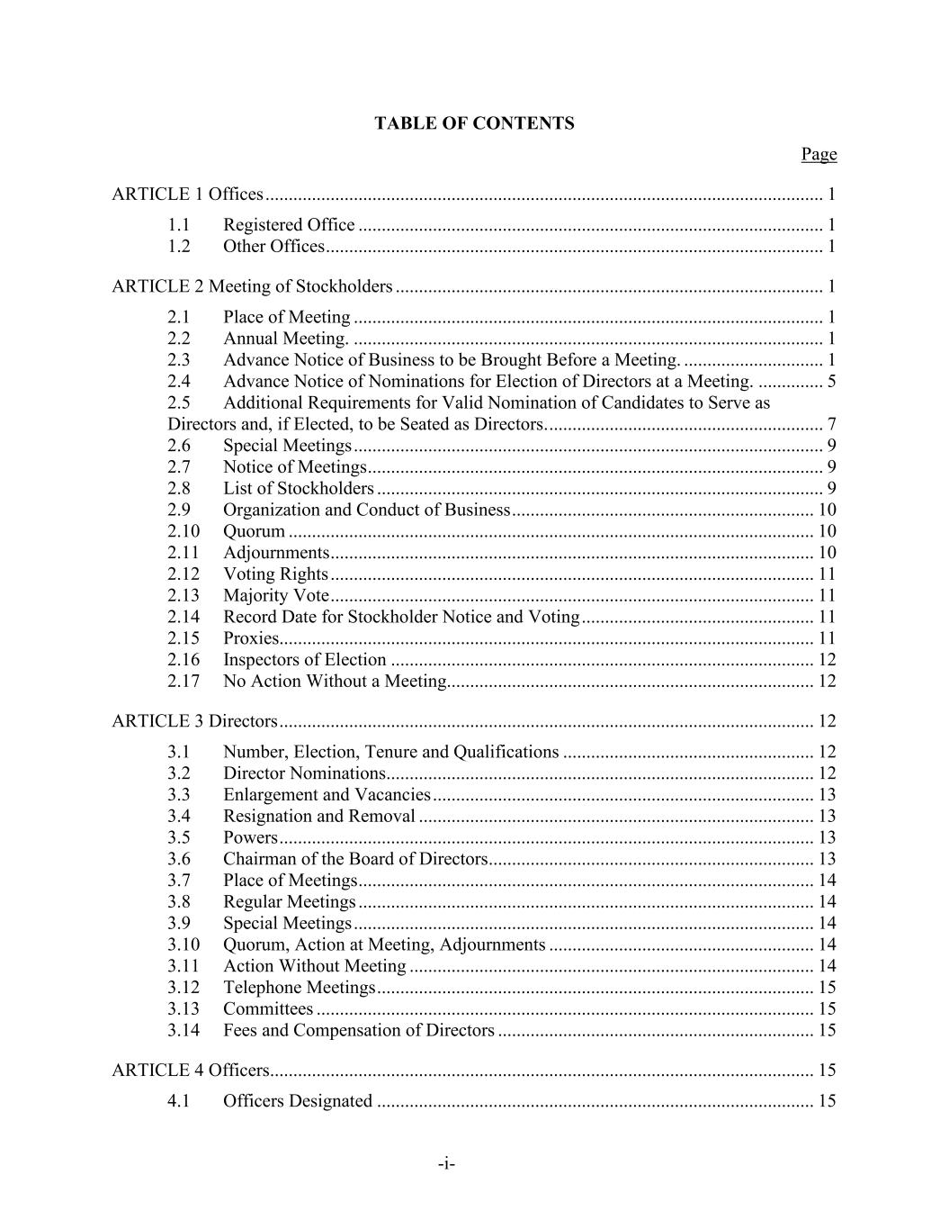 -i- TABLE OF CONTENTS Page ARTICLE 1 Offices ........................................................................................................................ 1 1.1 Registered Office .................................................................................................... 1 1.2 Other Offices ........................................................................................................... 1 ARTICLE 2 Meeting of Stockholders ............................................................................................ 1 2.1 Place of Meeting ..................................................................................................... 1 2.2 Annual Meeting. ..................................................................................................... 1 2.3 Advance Notice of Business to be Brought Before a Meeting. .............................. 1 2.4 Advance Notice of Nominations for Election of Directors at a Meeting. .............. 5 2.5 Additional Requirements for Valid Nomination of Candidates to Serve as Directors and, if Elected, to be Seated as Directors. ........................................................... 7 2.6 Special Meetings ..................................................................................................... 9 2.7 Notice of Meetings .................................................................................................. 9 2.8 List of Stockholders ................................................................................................ 9 2.9 Organization and Conduct of Business ................................................................. 10 2.10 Quorum ................................................................................................................. 10 2.11 Adjournments ........................................................................................................ 10 2.12 Voting Rights ........................................................................................................ 11 2.13 Majority Vote ........................................................................................................ 11 2.14 Record Date for Stockholder Notice and Voting .................................................. 11 2.15 Proxies................................................................................................................... 11 2.16 Inspectors of Election ........................................................................................... 12 2.17 No Action Without a Meeting............................................................................... 12 ARTICLE 3 Directors ................................................................................................................... 12 3.1 Number, Election, Tenure and Qualifications ...................................................... 12 3.2 Director Nominations............................................................................................ 12 3.3 Enlargement and Vacancies .................................................................................. 13 3.4 Resignation and Removal ..................................................................................... 13 3.5 Powers ................................................................................................................... 13 3.6 Chairman of the Board of Directors ...................................................................... 13 3.7 Place of Meetings .................................................................................................. 14 3.8 Regular Meetings .................................................................................................. 14 3.9 Special Meetings ................................................................................................... 14 3.10 Quorum, Action at Meeting, Adjournments ......................................................... 14 3.11 Action Without Meeting ....................................................................................... 14 3.12 Telephone Meetings .............................................................................................. 15 3.13 Committees ........................................................................................................... 15 3.14 Fees and Compensation of Directors .................................................................... 15 ARTICLE 4 Officers..................................................................................................................... 15 4.1 Officers Designated .............................................................................................. 15
