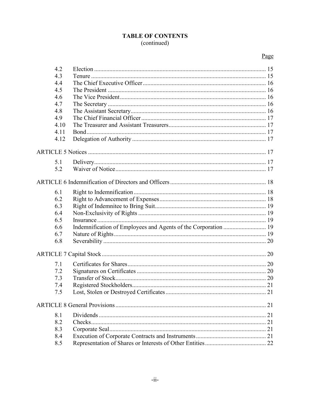 TABLE OF CONTENTS (continued) Page -ii- 4.2 Election ................................................................................................................. 15 4.3 Tenure ................................................................................................................... 15 4.4 The Chief Executive Officer ................................................................................. 16 4.5 The President ........................................................................................................ 16 4.6 The Vice President ................................................................................................ 16 4.7 The Secretary ........................................................................................................ 16 4.8 The Assistant Secretary......................................................................................... 16 4.9 The Chief Financial Officer .................................................................................. 17 4.10 The Treasurer and Assistant Treasurers ................................................................ 17 4.11 Bond ...................................................................................................................... 17 4.12 Delegation of Authority ........................................................................................ 17 ARTICLE 5 Notices ..................................................................................................................... 17 5.1 Delivery................................................................................................................. 17 5.2 Waiver of Notice ................................................................................................... 17 ARTICLE 6 Indemnification of Directors and Officers ............................................................... 18 6.1 Right to Indemnification ....................................................................................... 18 6.2 Right to Advancement of Expenses ...................................................................... 18 6.3 Right of Indemnitee to Bring Suit ......................................................................... 19 6.4 Non-Exclusivity of Rights .................................................................................... 19 6.5 Insurance ............................................................................................................... 19 6.6 Indemnification of Employees and Agents of the Corporation ............................ 19 6.7 Nature of Rights .................................................................................................... 19 6.8 Severability ........................................................................................................... 20 ARTICLE 7 Capital Stock ............................................................................................................ 20 7.1 Certificates for Shares ........................................................................................... 20 7.2 Signatures on Certificates ..................................................................................... 20 7.3 Transfer of Stock................................................................................................... 20 7.4 Registered Stockholders........................................................................................ 21 7.5 Lost, Stolen or Destroyed Certificates .................................................................. 21 ARTICLE 8 General Provisions ................................................................................................... 21 8.1 Dividends .............................................................................................................. 21 8.2 Checks ................................................................................................................... 21 8.3 Corporate Seal ....................................................................................................... 21 8.4 Execution of Corporate Contracts and Instruments .............................................. 21 8.5 Representation of Shares or Interests of Other Entities ........................................ 22