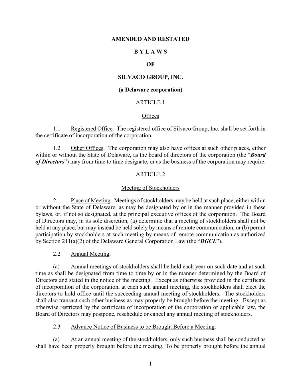 1 AMENDED AND RESTATED B Y L A W S OF SILVACO GROUP, INC. (a Delaware corporation) ARTICLE 1 Offices 1.1 Registered Office. The registered office of Silvaco Group, Inc. shall be set forth in the certificate of incorporation of the corporation. 1.2 Other Offices. The corporation may also have offices at such other places, either within or without the State of Delaware, as the board of directors of the corporation (the “Board of Directors”) may from time to time designate, or as the business of the corporation may require. ARTICLE 2 Meeting of Stockholders 2.1 Place of Meeting. Meetings of stockholders may be held at such place, either within or without the State of Delaware, as may be designated by or in the manner provided in these bylaws, or, if not so designated, at the principal executive offices of the corporation. The Board of Directors may, in its sole discretion, (a) determine that a meeting of stockholders shall not be held at any place, but may instead be held solely by means of remote communication, or (b) permit participation by stockholders at such meeting by means of remote communication as authorized by Section 211(a)(2) of the Delaware General Corporation Law (the “DGCL”). 2.2 Annual Meeting. (a) Annual meetings of stockholders shall be held each year on such date and at such time as shall be designated from time to time by or in the manner determined by the Board of Directors and stated in the notice of the meeting. Except as otherwise provided in the certificate of incorporation of the corporation, at each such annual meeting, the stockholders shall elect the directors to hold office until the succeeding annual meeting of stockholders. The stockholders shall also transact such other business as may properly be brought before the meeting. Except as otherwise restricted by the certificate of incorporation of the corporation or applicable law, the Board of Directors may postpone, reschedule or cancel any annual meeting of stockholders. 2.3 Advance Notice of Business to be Brought Before a Meeting. (a) At an annual meeting of the stockholders, only such business shall be conducted as shall have been properly brought before the meeting. To be properly brought before the annual