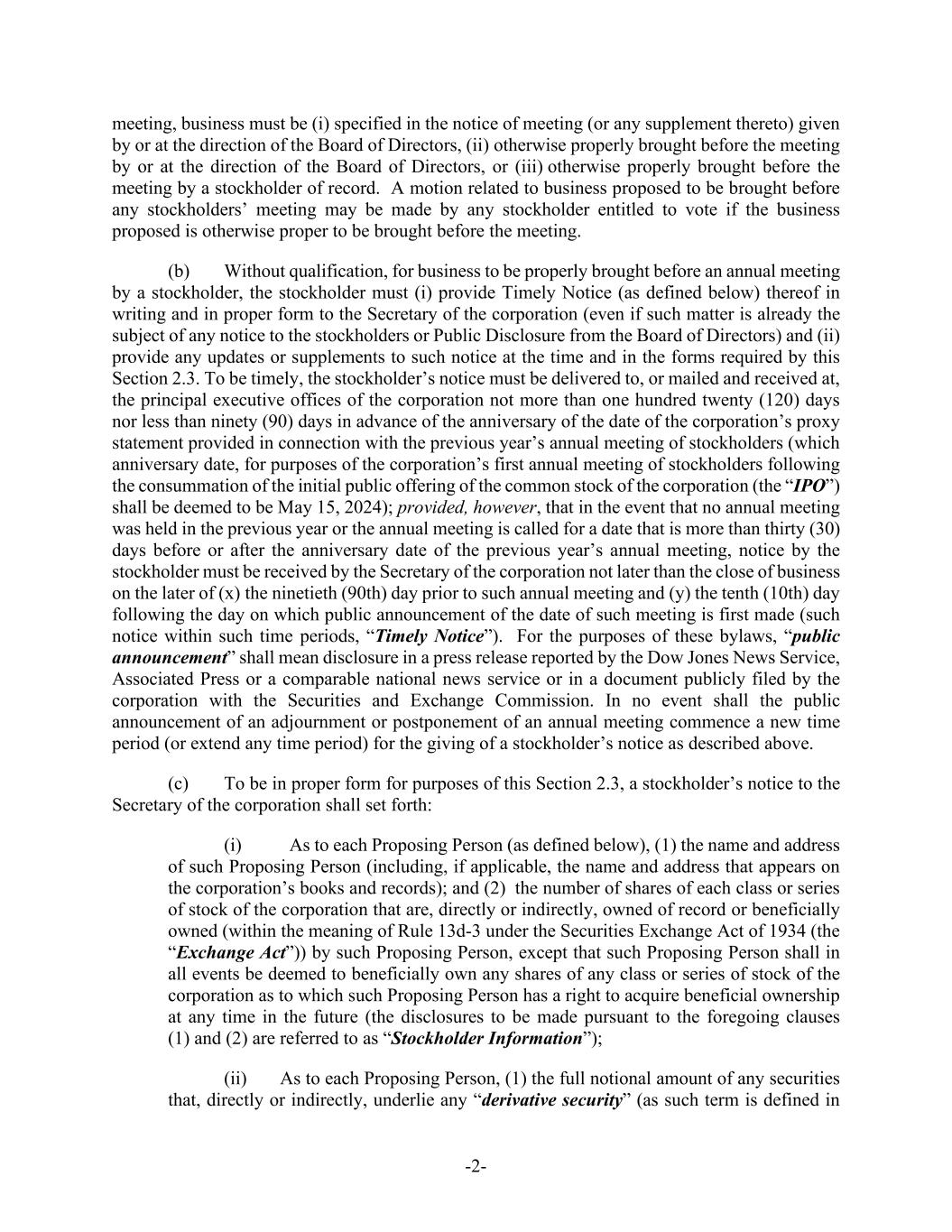-2- meeting, business must be (i) specified in the notice of meeting (or any supplement thereto) given by or at the direction of the Board of Directors, (ii) otherwise properly brought before the meeting by or at the direction of the Board of Directors, or (iii) otherwise properly brought before the meeting by a stockholder of record. A motion related to business proposed to be brought before any stockholders’ meeting may be made by any stockholder entitled to vote if the business proposed is otherwise proper to be brought before the meeting. (b) Without qualification, for business to be properly brought before an annual meeting by a stockholder, the stockholder must (i) provide Timely Notice (as defined below) thereof in writing and in proper form to the Secretary of the corporation (even if such matter is already the subject of any notice to the stockholders or Public Disclosure from the Board of Directors) and (ii) provide any updates or supplements to such notice at the time and in the forms required by this Section 2.3. To be timely, the stockholder’s notice must be delivered to, or mailed and received at, the principal executive offices of the corporation not more than one hundred twenty (120) days nor less than ninety (90) days in advance of the anniversary of the date of the corporation’s proxy statement provided in connection with the previous year’s annual meeting of stockholders (which anniversary date, for purposes of the corporation’s first annual meeting of stockholders following the consummation of the initial public offering of the common stock of the corporation (the “IPO”) shall be deemed to be May 15, 2024); provided, however, that in the event that no annual meeting was held in the previous year or the annual meeting is called for a date that is more than thirty (30) days before or after the anniversary date of the previous year’s annual meeting, notice by the stockholder must be received by the Secretary of the corporation not later than the close of business on the later of (x) the ninetieth (90th) day prior to such annual meeting and (y) the tenth (10th) day following the day on which public announcement of the date of such meeting is first made (such notice within such time periods, “Timely Notice”). For the purposes of these bylaws, “public announcement” shall mean disclosure in a press release reported by the Dow Jones News Service, Associated Press or a comparable national news service or in a document publicly filed by the corporation with the Securities and Exchange Commission. In no event shall the public announcement of an adjournment or postponement of an annual meeting commence a new time period (or extend any time period) for the giving of a stockholder’s notice as described above. (c) To be in proper form for purposes of this Section 2.3, a stockholder’s notice to the Secretary of the corporation shall set forth: (i) As to each Proposing Person (as defined below), (1) the name and address of such Proposing Person (including, if applicable, the name and address that appears on the corporation’s books and records); and (2) the number of shares of each class or series of stock of the corporation that are, directly or indirectly, owned of record or beneficially owned (within the meaning of Rule 13d-3 under the Securities Exchange Act of 1934 (the “Exchange Act”)) by such Proposing Person, except that such Proposing Person shall in all events be deemed to beneficially own any shares of any class or series of stock of the corporation as to which such Proposing Person has a right to acquire beneficial ownership at any time in the future (the disclosures to be made pursuant to the foregoing clauses (1) and (2) are referred to as “Stockholder Information”); (ii) As to each Proposing Person, (1) the full notional amount of any securities that, directly or indirectly, underlie any “derivative security” (as such term is defined in