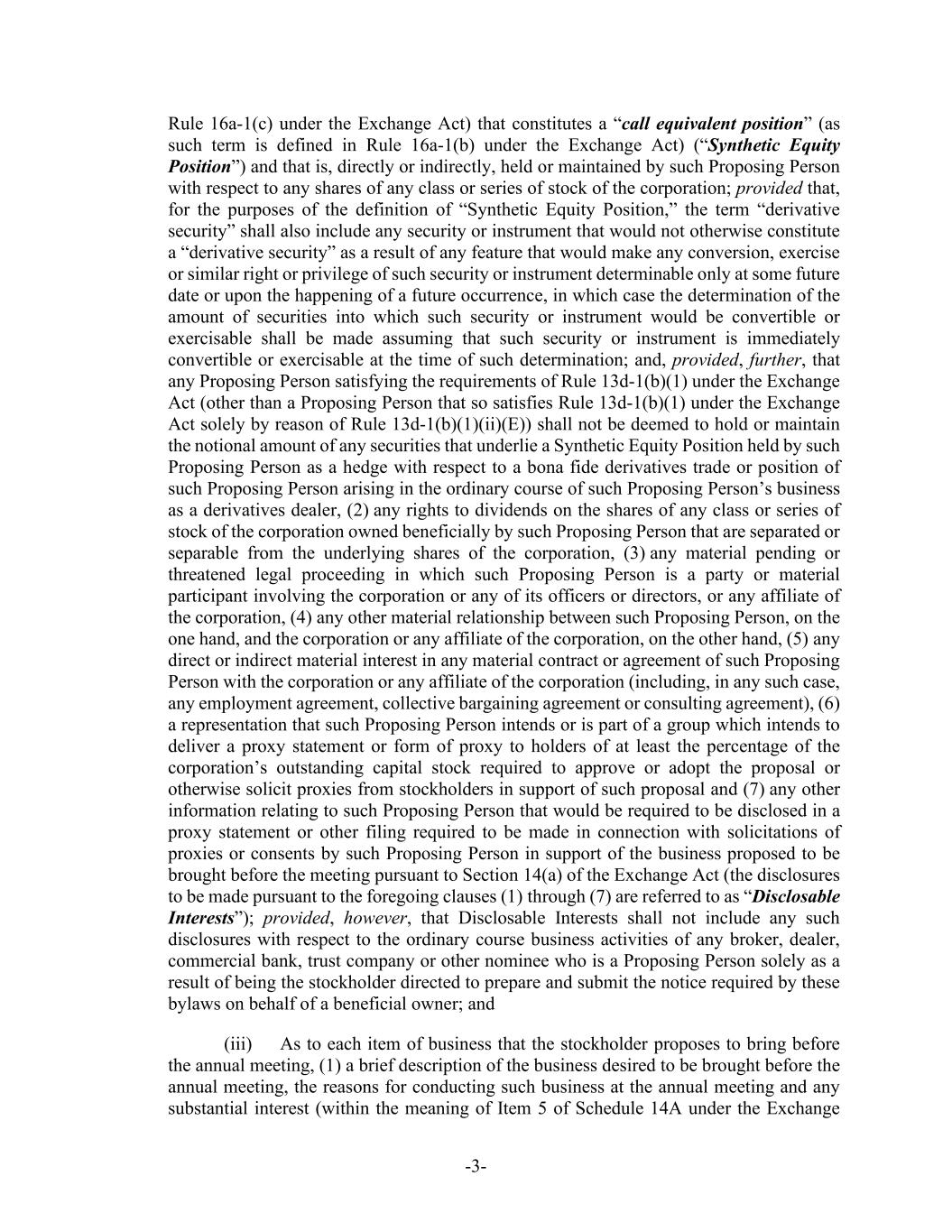 -3- Rule 16a-1(c) under the Exchange Act) that constitutes a “call equivalent position” (as such term is defined in Rule 16a-1(b) under the Exchange Act) (“Synthetic Equity Position”) and that is, directly or indirectly, held or maintained by such Proposing Person with respect to any shares of any class or series of stock of the corporation; provided that, for the purposes of the definition of “Synthetic Equity Position,” the term “derivative security” shall also include any security or instrument that would not otherwise constitute a “derivative security” as a result of any feature that would make any conversion, exercise or similar right or privilege of such security or instrument determinable only at some future date or upon the happening of a future occurrence, in which case the determination of the amount of securities into which such security or instrument would be convertible or exercisable shall be made assuming that such security or instrument is immediately convertible or exercisable at the time of such determination; and, provided, further, that any Proposing Person satisfying the requirements of Rule 13d-1(b)(1) under the Exchange Act (other than a Proposing Person that so satisfies Rule 13d-1(b)(1) under the Exchange Act solely by reason of Rule 13d-1(b)(1)(ii)(E)) shall not be deemed to hold or maintain the notional amount of any securities that underlie a Synthetic Equity Position held by such Proposing Person as a hedge with respect to a bona fide derivatives trade or position of such Proposing Person arising in the ordinary course of such Proposing Person’s business as a derivatives dealer, (2) any rights to dividends on the shares of any class or series of stock of the corporation owned beneficially by such Proposing Person that are separated or separable from the underlying shares of the corporation, (3) any material pending or threatened legal proceeding in which such Proposing Person is a party or material participant involving the corporation or any of its officers or directors, or any affiliate of the corporation, (4) any other material relationship between such Proposing Person, on the one hand, and the corporation or any affiliate of the corporation, on the other hand, (5) any direct or indirect material interest in any material contract or agreement of such Proposing Person with the corporation or any affiliate of the corporation (including, in any such case, any employment agreement, collective bargaining agreement or consulting agreement), (6) a representation that such Proposing Person intends or is part of a group which intends to deliver a proxy statement or form of proxy to holders of at least the percentage of the corporation’s outstanding capital stock required to approve or adopt the proposal or otherwise solicit proxies from stockholders in support of such proposal and (7) any other information relating to such Proposing Person that would be required to be disclosed in a proxy statement or other filing required to be made in connection with solicitations of proxies or consents by such Proposing Person in support of the business proposed to be brought before the meeting pursuant to Section 14(a) of the Exchange Act (the disclosures to be made pursuant to the foregoing clauses (1) through (7) are referred to as “Disclosable Interests”); provided, however, that Disclosable Interests shall not include any such disclosures with respect to the ordinary course business activities of any broker, dealer, commercial bank, trust company or other nominee who is a Proposing Person solely as a result of being the stockholder directed to prepare and submit the notice required by these bylaws on behalf of a beneficial owner; and (iii) As to each item of business that the stockholder proposes to bring before the annual meeting, (1) a brief description of the business desired to be brought before the annual meeting, the reasons for conducting such business at the annual meeting and any substantial interest (within the meaning of Item 5 of Schedule 14A under the Exchange