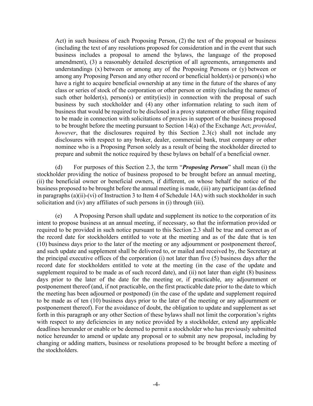 -4- Act) in such business of each Proposing Person, (2) the text of the proposal or business (including the text of any resolutions proposed for consideration and in the event that such business includes a proposal to amend the bylaws, the language of the proposed amendment), (3) a reasonably detailed description of all agreements, arrangements and understandings (x) between or among any of the Proposing Persons or (y) between or among any Proposing Person and any other record or beneficial holder(s) or person(s) who have a right to acquire beneficial ownership at any time in the future of the shares of any class or series of stock of the corporation or other person or entity (including the names of such other holder(s), person(s) or entity(ies)) in connection with the proposal of such business by such stockholder and (4) any other information relating to such item of business that would be required to be disclosed in a proxy statement or other filing required to be made in connection with solicitations of proxies in support of the business proposed to be brought before the meeting pursuant to Section 14(a) of the Exchange Act; provided, however, that the disclosures required by this Section 2.3(c) shall not include any disclosures with respect to any broker, dealer, commercial bank, trust company or other nominee who is a Proposing Person solely as a result of being the stockholder directed to prepare and submit the notice required by these bylaws on behalf of a beneficial owner. (d) For purposes of this Section 2.3, the term “Proposing Person” shall mean (i) the stockholder providing the notice of business proposed to be brought before an annual meeting, (ii) the beneficial owner or beneficial owners, if different, on whose behalf the notice of the business proposed to be brought before the annual meeting is made, (iii) any participant (as defined in paragraphs (a)(ii)-(vi) of Instruction 3 to Item 4 of Schedule 14A) with such stockholder in such solicitation and (iv) any affiliates of such persons in (i) through (iii). (e) A Proposing Person shall update and supplement its notice to the corporation of its intent to propose business at an annual meeting, if necessary, so that the information provided or required to be provided in such notice pursuant to this Section 2.3 shall be true and correct as of the record date for stockholders entitled to vote at the meeting and as of the date that is ten (10) business days prior to the later of the meeting or any adjournment or postponement thereof, and such update and supplement shall be delivered to, or mailed and received by, the Secretary at the principal executive offices of the corporation (i) not later than five (5) business days after the record date for stockholders entitled to vote at the meeting (in the case of the update and supplement required to be made as of such record date), and (ii) not later than eight (8) business days prior to the later of the date for the meeting or, if practicable, any adjournment or postponement thereof (and, if not practicable, on the first practicable date prior to the date to which the meeting has been adjourned or postponed) (in the case of the update and supplement required to be made as of ten (10) business days prior to the later of the meeting or any adjournment or postponement thereof). For the avoidance of doubt, the obligation to update and supplement as set forth in this paragraph or any other Section of these bylaws shall not limit the corporation’s rights with respect to any deficiencies in any notice provided by a stockholder, extend any applicable deadlines hereunder or enable or be deemed to permit a stockholder who has previously submitted notice hereunder to amend or update any proposal or to submit any new proposal, including by changing or adding matters, business or resolutions proposed to be brought before a meeting of the stockholders.