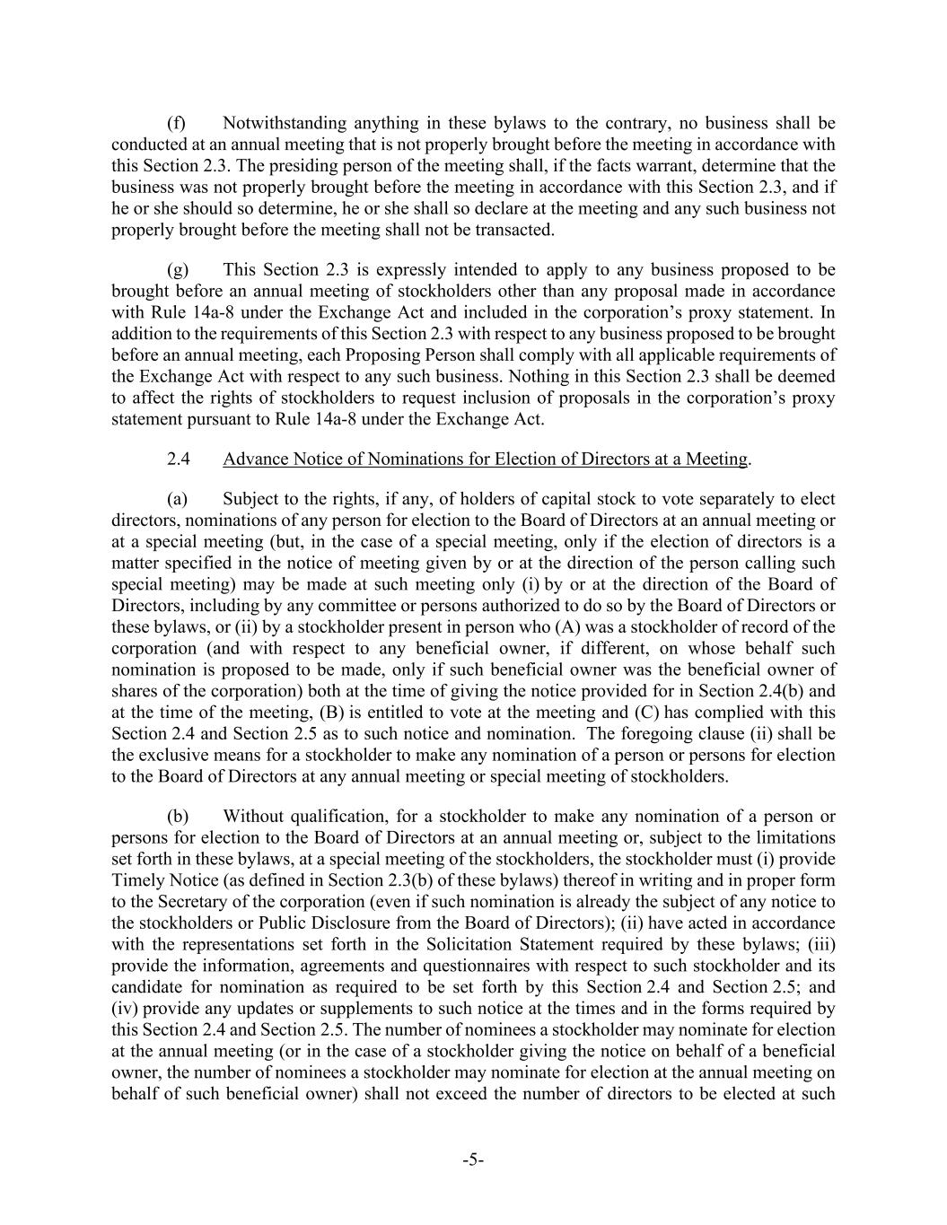 -5- (f) Notwithstanding anything in these bylaws to the contrary, no business shall be conducted at an annual meeting that is not properly brought before the meeting in accordance with this Section 2.3. The presiding person of the meeting shall, if the facts warrant, determine that the business was not properly brought before the meeting in accordance with this Section 2.3, and if he or she should so determine, he or she shall so declare at the meeting and any such business not properly brought before the meeting shall not be transacted. (g) This Section 2.3 is expressly intended to apply to any business proposed to be brought before an annual meeting of stockholders other than any proposal made in accordance with Rule 14a-8 under the Exchange Act and included in the corporation’s proxy statement. In addition to the requirements of this Section 2.3 with respect to any business proposed to be brought before an annual meeting, each Proposing Person shall comply with all applicable requirements of the Exchange Act with respect to any such business. Nothing in this Section 2.3 shall be deemed to affect the rights of stockholders to request inclusion of proposals in the corporation’s proxy statement pursuant to Rule 14a-8 under the Exchange Act. 2.4 Advance Notice of Nominations for Election of Directors at a Meeting. (a) Subject to the rights, if any, of holders of capital stock to vote separately to elect directors, nominations of any person for election to the Board of Directors at an annual meeting or at a special meeting (but, in the case of a special meeting, only if the election of directors is a matter specified in the notice of meeting given by or at the direction of the person calling such special meeting) may be made at such meeting only (i) by or at the direction of the Board of Directors, including by any committee or persons authorized to do so by the Board of Directors or these bylaws, or (ii) by a stockholder present in person who (A) was a stockholder of record of the corporation (and with respect to any beneficial owner, if different, on whose behalf such nomination is proposed to be made, only if such beneficial owner was the beneficial owner of shares of the corporation) both at the time of giving the notice provided for in Section 2.4(b) and at the time of the meeting, (B) is entitled to vote at the meeting and (C) has complied with this Section 2.4 and Section 2.5 as to such notice and nomination. The foregoing clause (ii) shall be the exclusive means for a stockholder to make any nomination of a person or persons for election to the Board of Directors at any annual meeting or special meeting of stockholders. (b) Without qualification, for a stockholder to make any nomination of a person or persons for election to the Board of Directors at an annual meeting or, subject to the limitations set forth in these bylaws, at a special meeting of the stockholders, the stockholder must (i) provide Timely Notice (as defined in Section 2.3(b) of these bylaws) thereof in writing and in proper form to the Secretary of the corporation (even if such nomination is already the subject of any notice to the stockholders or Public Disclosure from the Board of Directors); (ii) have acted in accordance with the representations set forth in the Solicitation Statement required by these bylaws; (iii) provide the information, agreements and questionnaires with respect to such stockholder and its candidate for nomination as required to be set forth by this Section 2.4 and Section 2.5; and (iv) provide any updates or supplements to such notice at the times and in the forms required by this Section 2.4 and Section 2.5. The number of nominees a stockholder may nominate for election at the annual meeting (or in the case of a stockholder giving the notice on behalf of a beneficial owner, the number of nominees a stockholder may nominate for election at the annual meeting on behalf of such beneficial owner) shall not exceed the number of directors to be elected at such